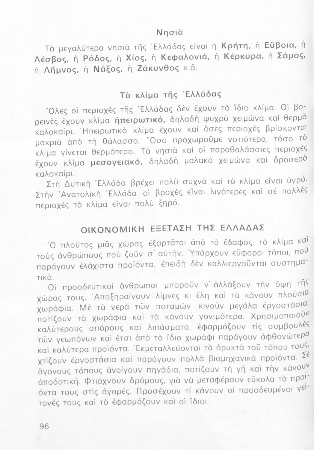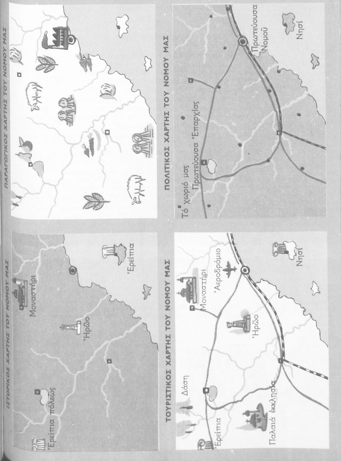 Μαθητικό βοήθημα Γεωγραφίας για την Γ΄ και Δ΄ Δημοτικού που περιέχει χάρτες περιοχών της Ελλάδας τις οποίες εξετάζει από γεωφυσική, πολιτική και οικονομική άποψη.