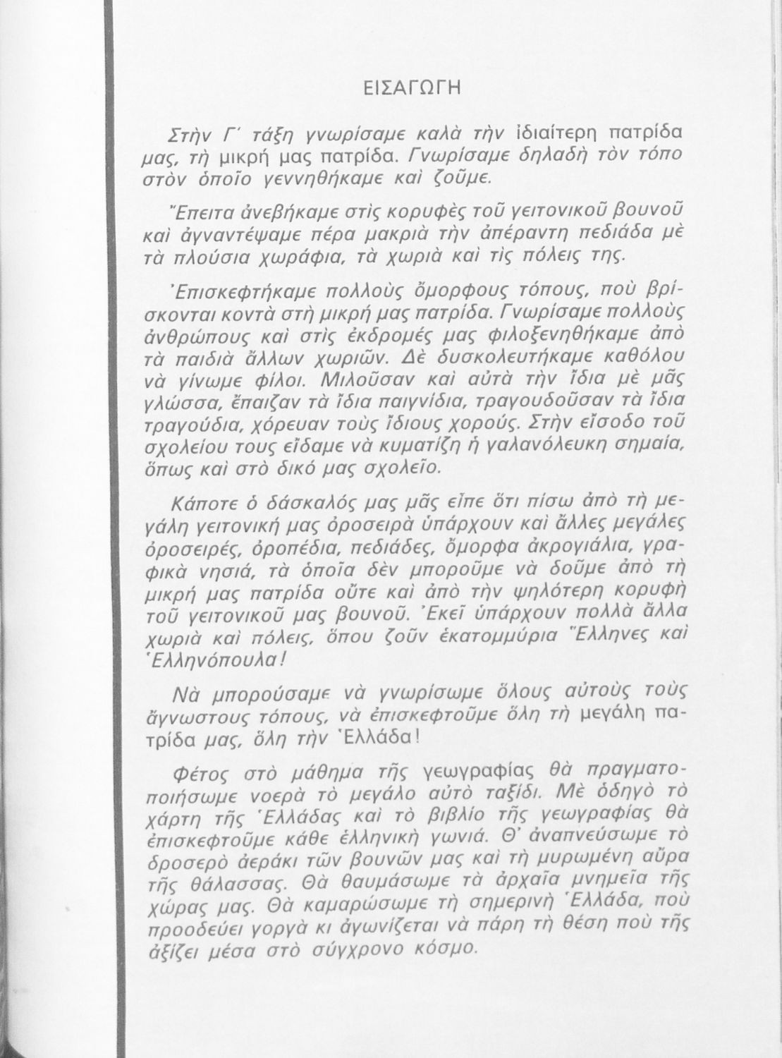 Σχολικό εγχειρίδιο Γεωγραφίας Γ ΄ και Δ' Δημοτικού. Το πρώτο μέρος του βιβλίου απευθύνεται σε μαθητές της Γ' Δημοτικού και αποτελεί μια εισαγωγή στην πατριδογνωσία με έμφαση στις παραδόσεις της ελληνικής ...