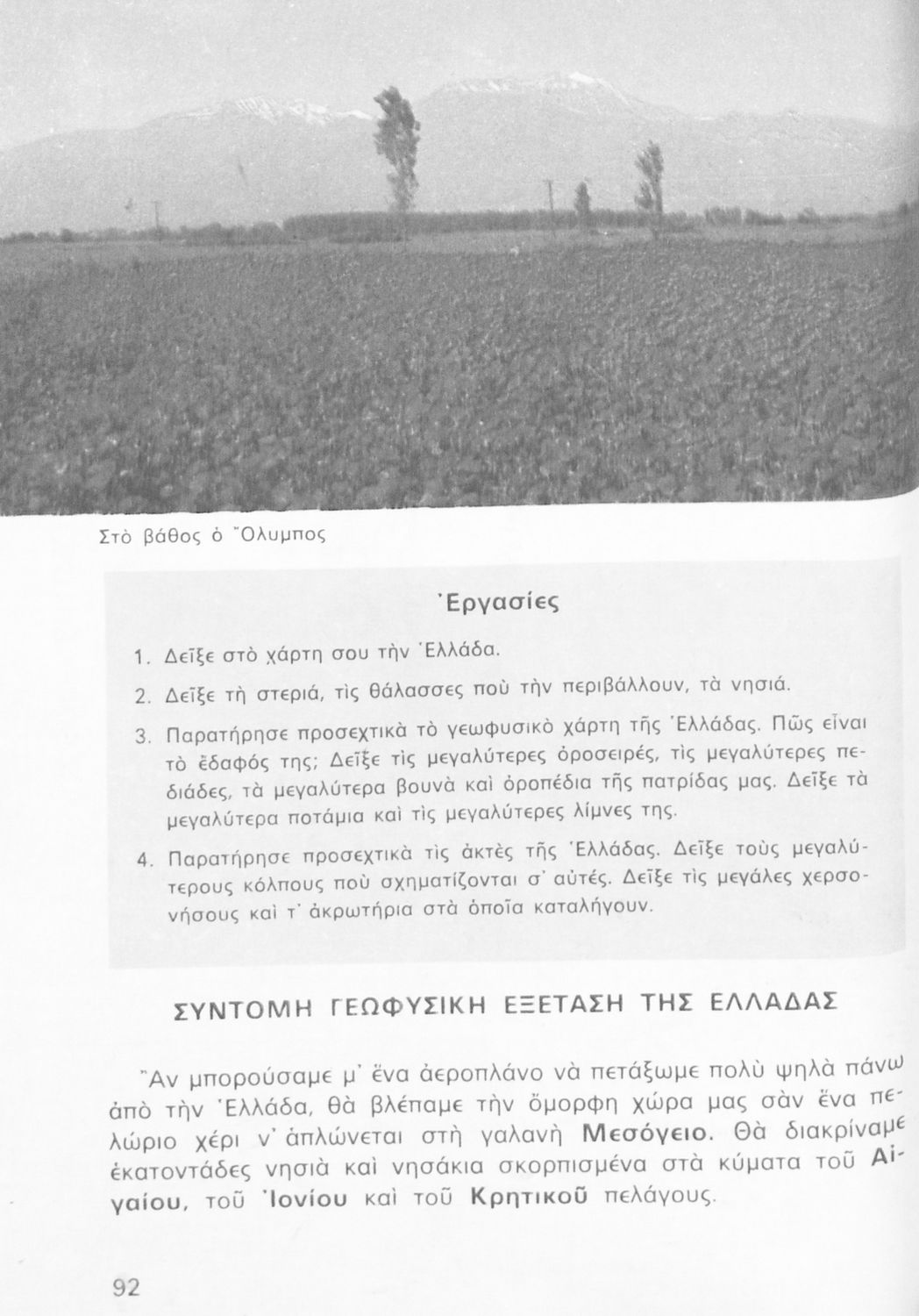 Παρουσίαση περιεχομένου: Σχολικό εγχειρίδιο Γεωγραφίας Γ ΄ και Δ' Δημοτικού. Το πρώτο μέρος του βιβλίου απευθύνεται σε μαθητές της Γ' Δημοτικού και αποτελεί μια εισαγωγή στην πατριδογνωσία με έμφαση στις παραδόσεις της ελληνικής επαρχίας. Το δεύτερο μέρος αφορά την Δ' Δημοτικού και εξετάζει την οικονομική, πολιτική και γεωφυσική γεωγραφία της Ελλάδας.