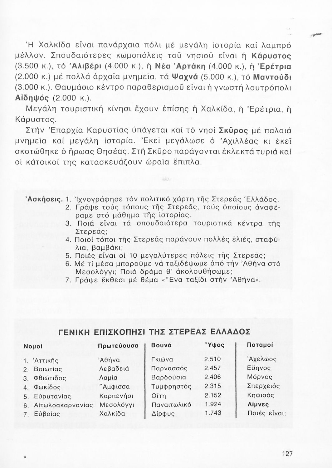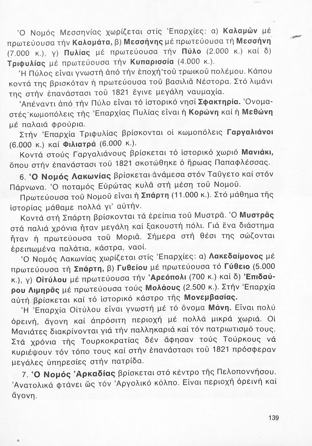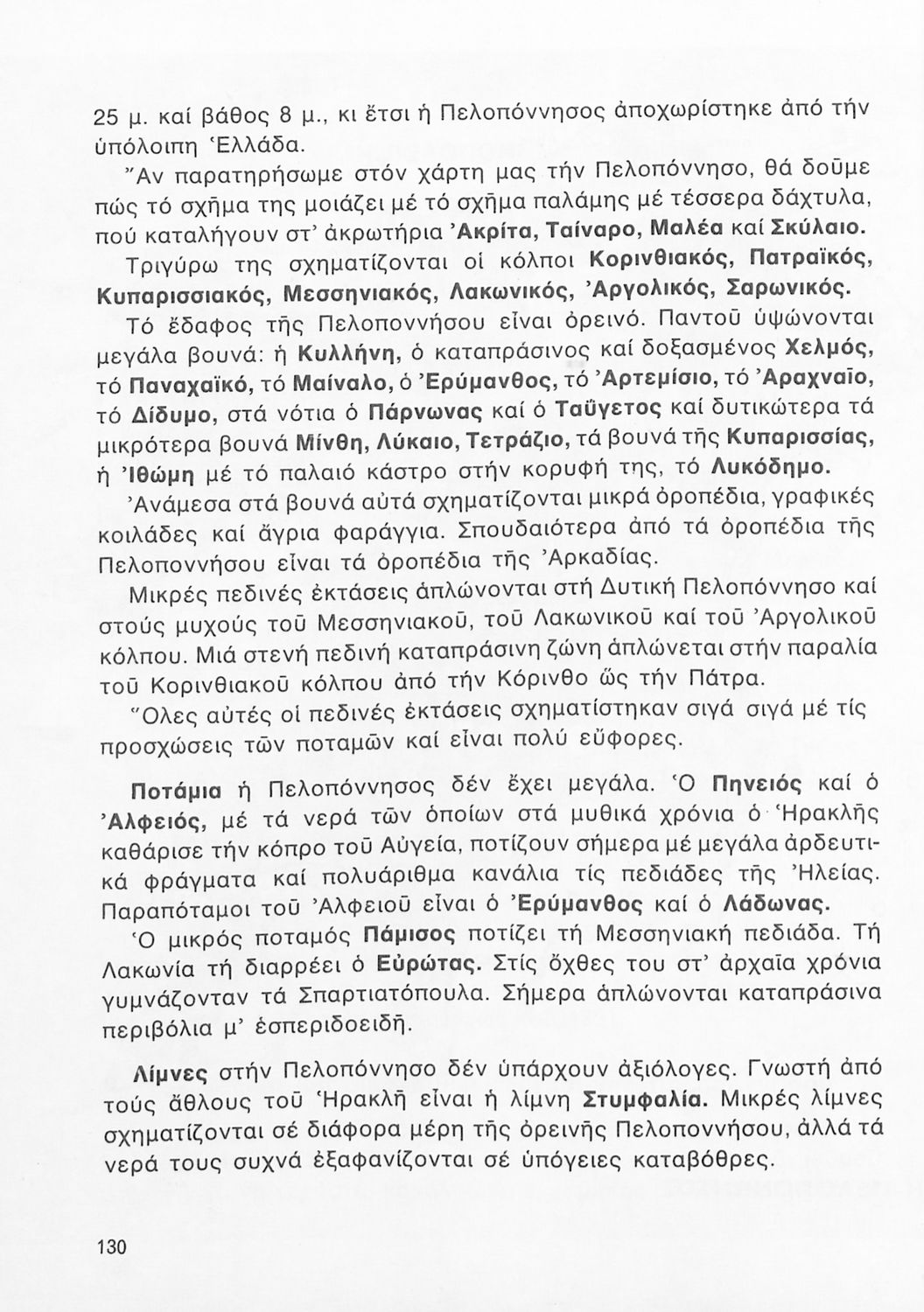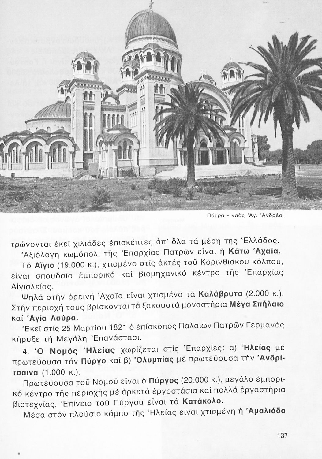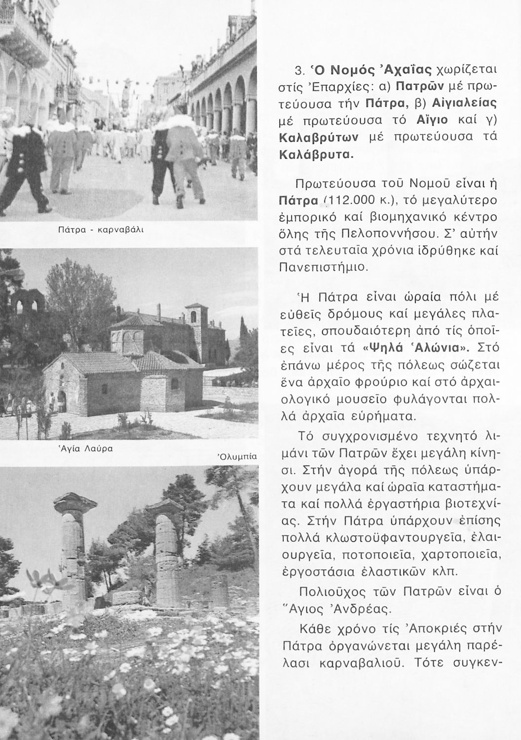 520 ## _aΣχολικό εγχειρίδιο Γεωγραφίας Γ ΄ και Δ' Δημοτικού. Το πρώτο μέρος του βιβλίου απευθύνεται σε μαθητές της Γ' Δημοτικού και αποτελεί μια εισαγωγή στην πατριδογνωσία με έμφαση στις παραδόσεις της ελληνικής επαρχίας. Το δεύτερο μέρος αφορά την Δ' Δημοτικού και εξετάζει την οικονομική, πολιτική και γεωφυσική γεωγραφία της Ελλάδας.