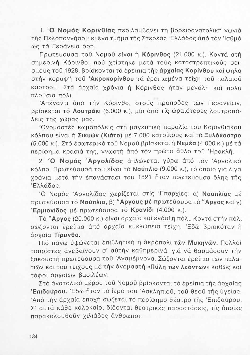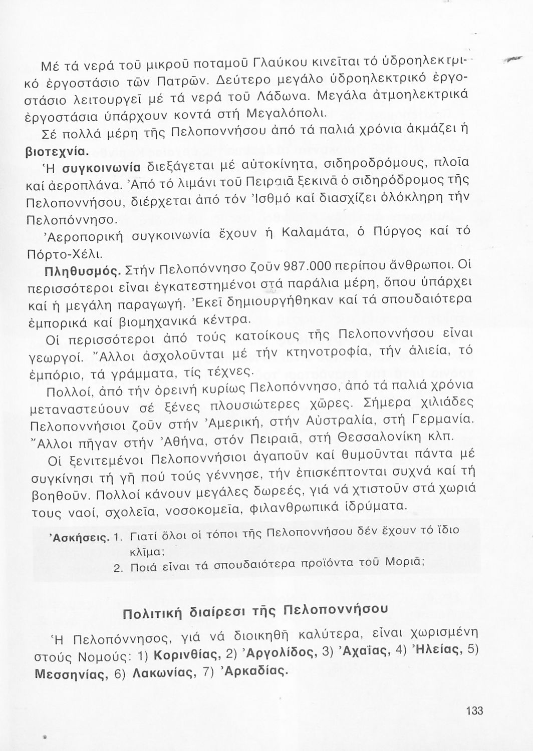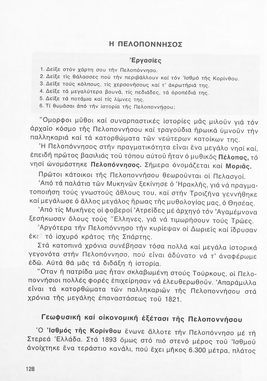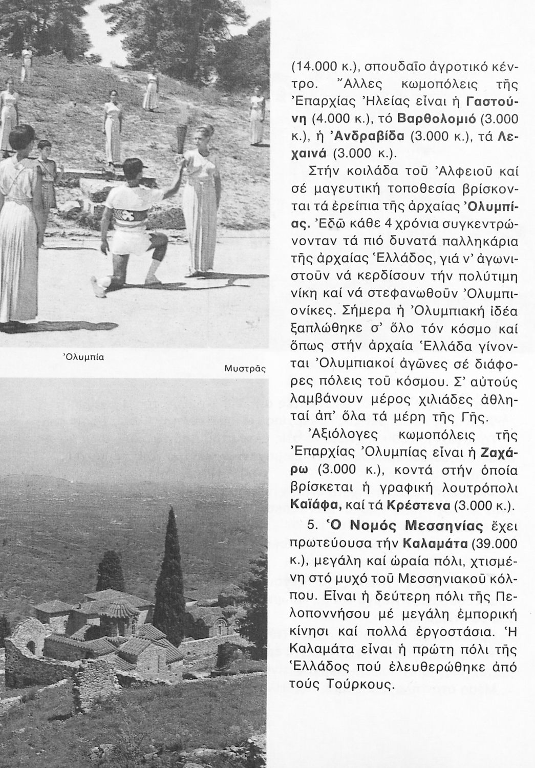 Βαθμίδα εκπαίδευσης: Πρωτοβάθμια Τάξη: Γ' Δημοτικού / Δ' Δημοτικού Μάθημα: Γεωγραφία Γλώσσα: Δημοτική Παρουσίαση περιεχομένου: Σχολικό εγχειρίδιο Γεωγραφίας Γ ΄ και Δ' Δημοτικού. Το πρώτο μέρος του βιβλίου απευθύνεται σε μαθητές της Γ' Δημοτικού και αποτελεί μια εισαγωγή στην πατριδογνωσία με έμφαση στις παραδόσεις της ελληνικής επαρχίας. Το δεύτερο μέρος αφορά την Δ' Δημοτικού και εξετάζει την οικονομική, πολιτική και γεωφυσική γεωγραφία της Ελλάδας. |