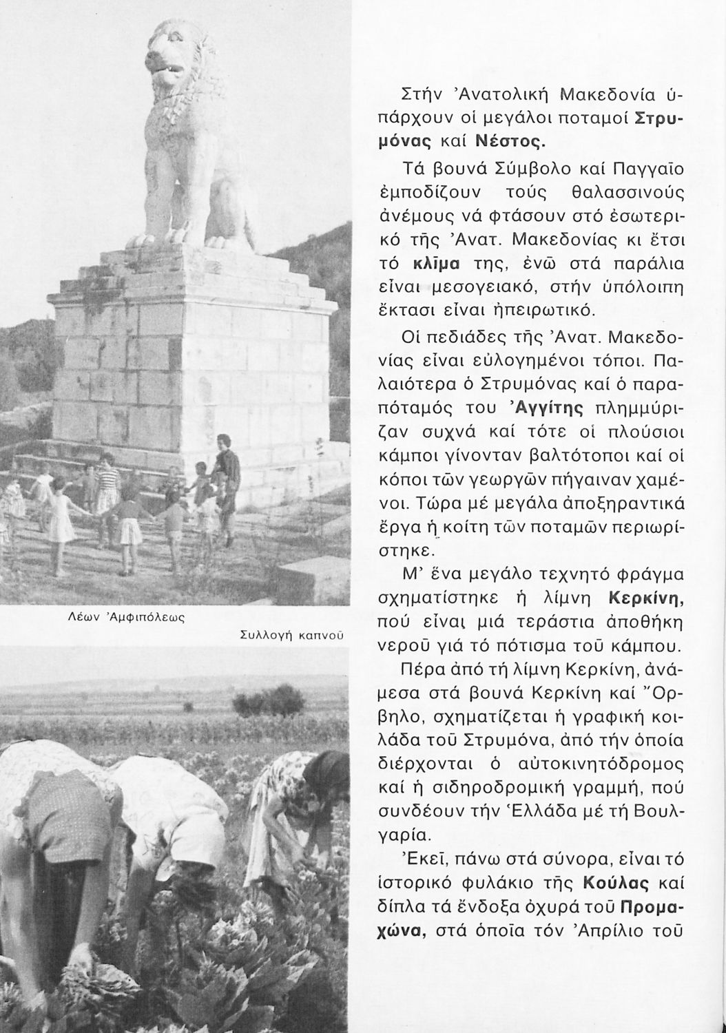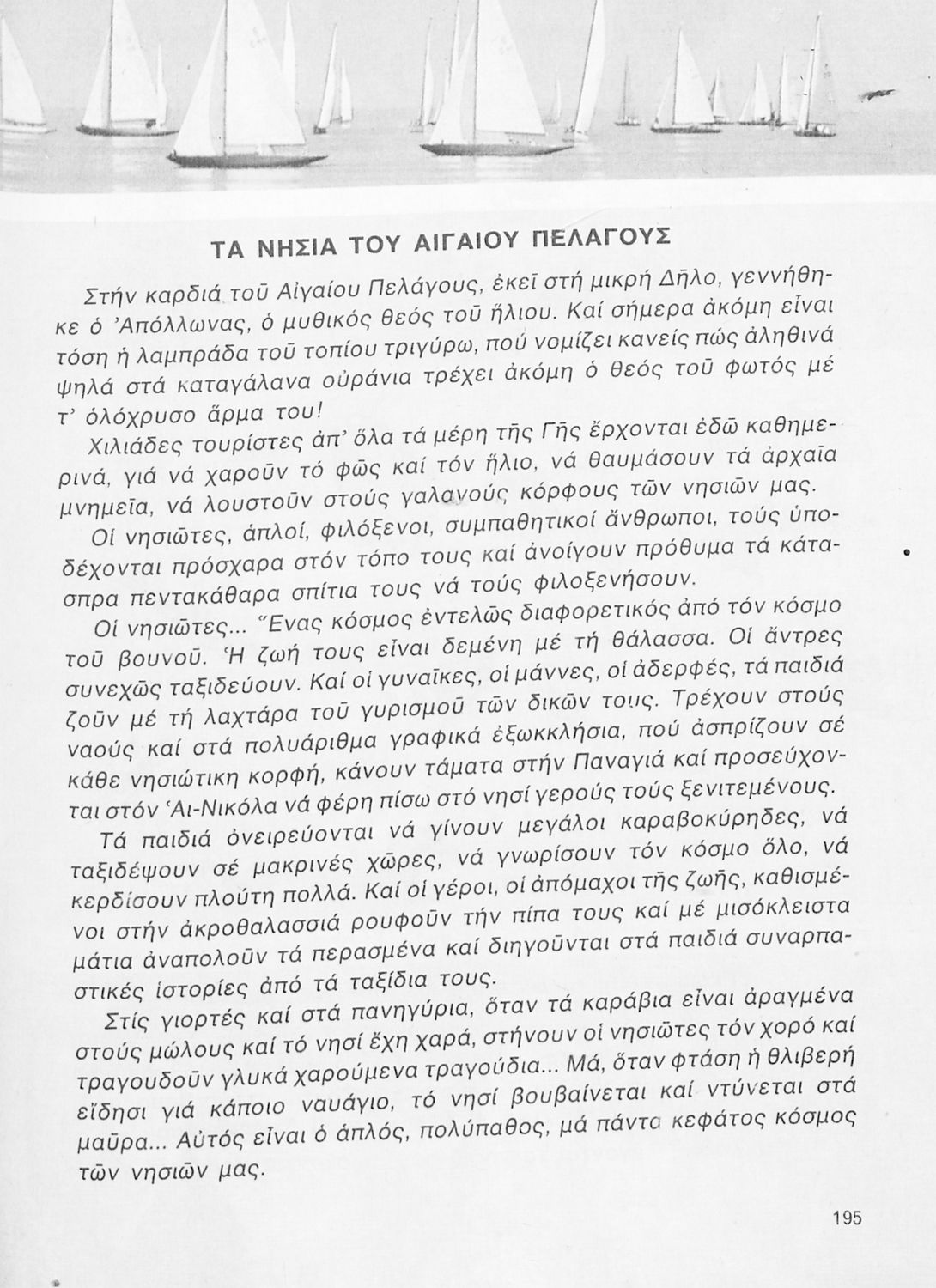 Παρουσίαση περιεχομένου: Σχολικό εγχειρίδιο Γεωγραφίας Γ ΄ και Δ' Δημοτικού. Το πρώτο μέρος του βιβλίου απευθύνεται σε μαθητές της Γ' Δημοτικού και αποτελεί μια εισαγωγή στην πατριδογνωσία με έμφαση στις παραδόσεις της ελληνικής επαρχίας. Το δεύτερο μέρος αφορά την Δ' Δημοτικού και εξετάζει την οικονομική, πολιτική και γεωφυσική γεωγραφία της Ελλάδας.