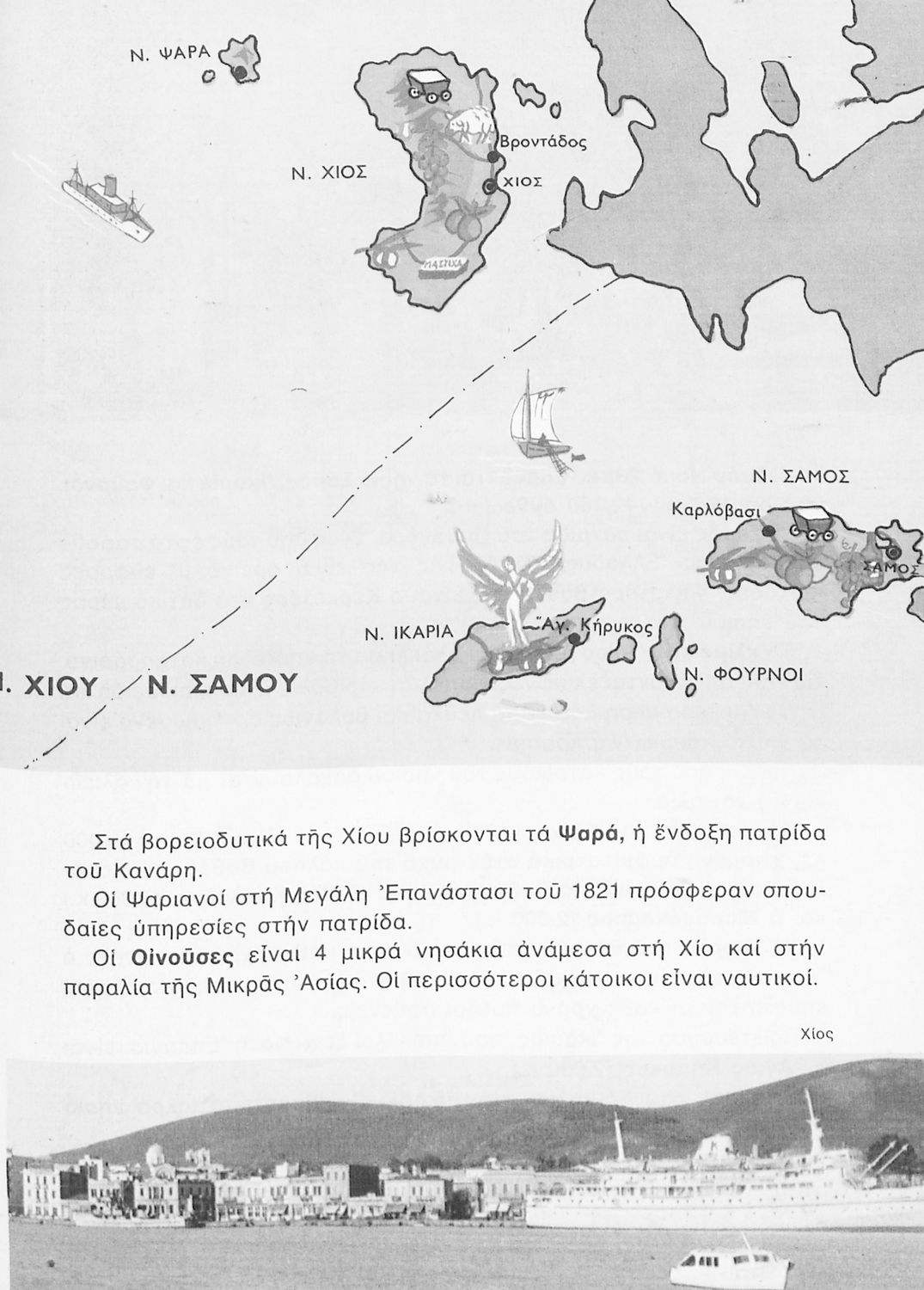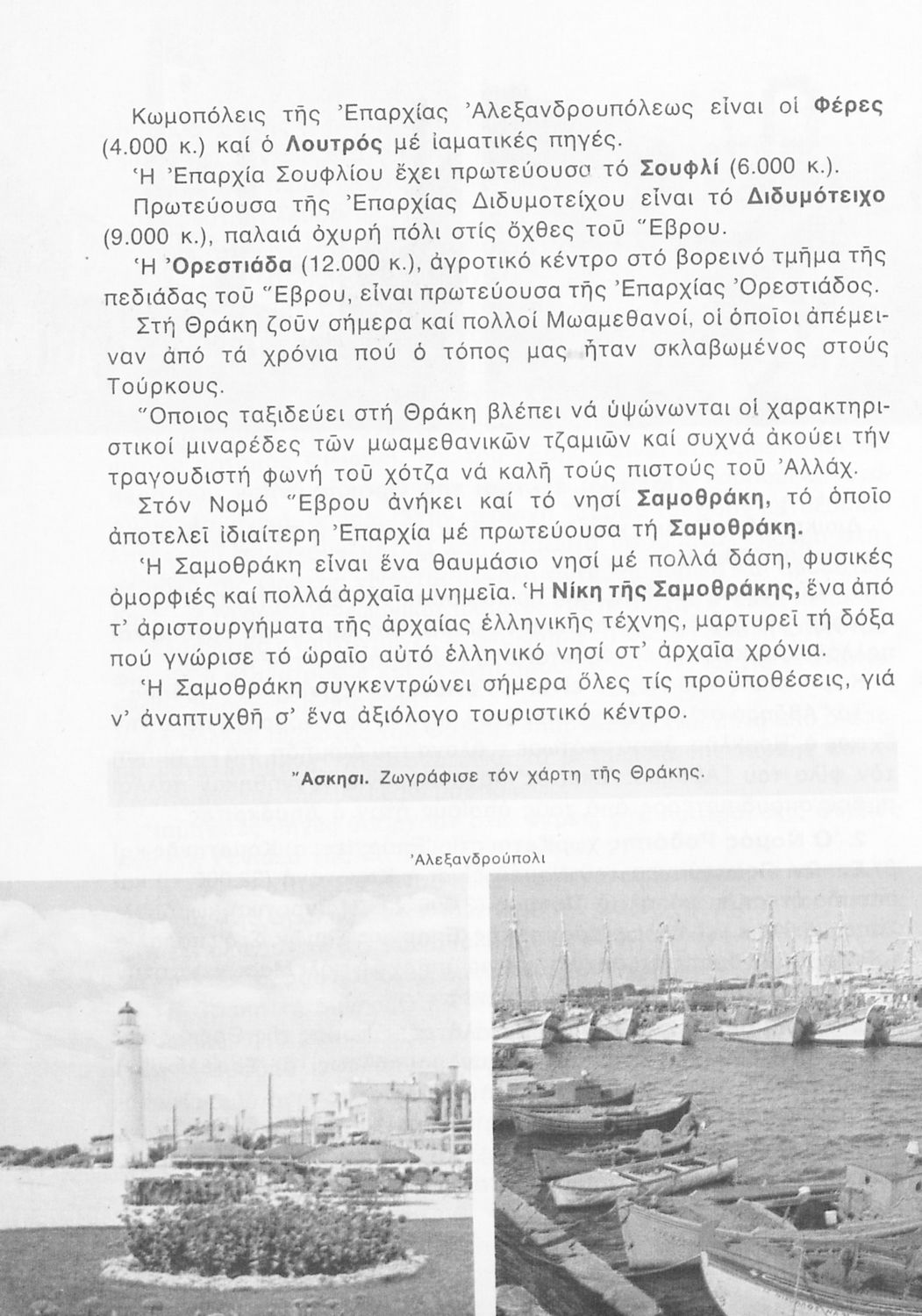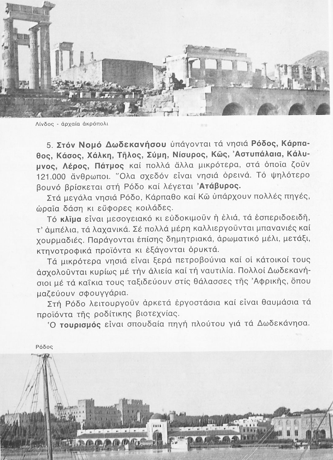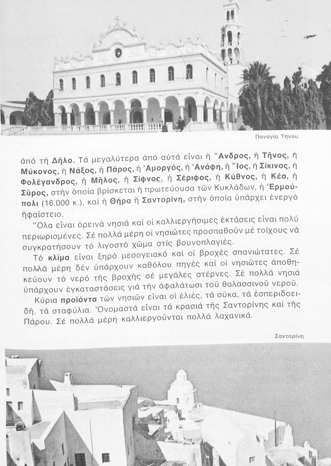 Σχολικό εγχειρίδιο Γεωγραφίας Γ ΄ και Δ' Δημοτικού. Το πρώτο μέρος του βιβλίου απευθύνεται σε μαθητές της Γ' Δημοτικού και αποτελεί μια εισαγωγή στην πατριδογνωσία με έμφαση στις παραδόσεις της ελληνικής επαρχίας. Το δεύτερο μέρος αφορά την Δ' Δημοτικού και εξετάζει την οικονομική, πολιτική και γεωφυσική γεωγραφία της Ελλάδας.