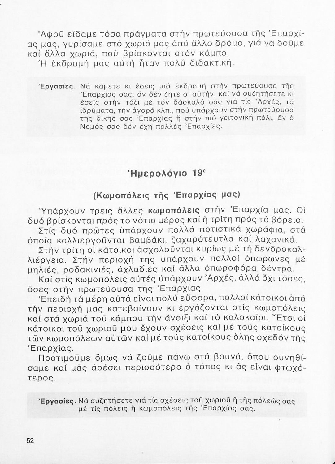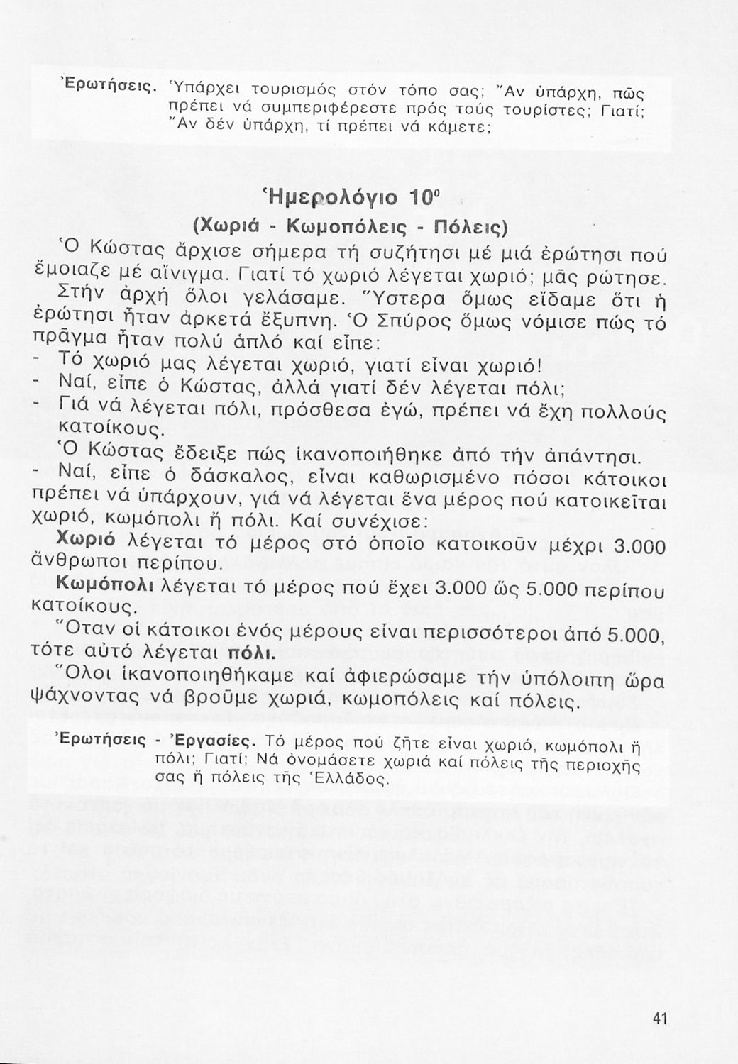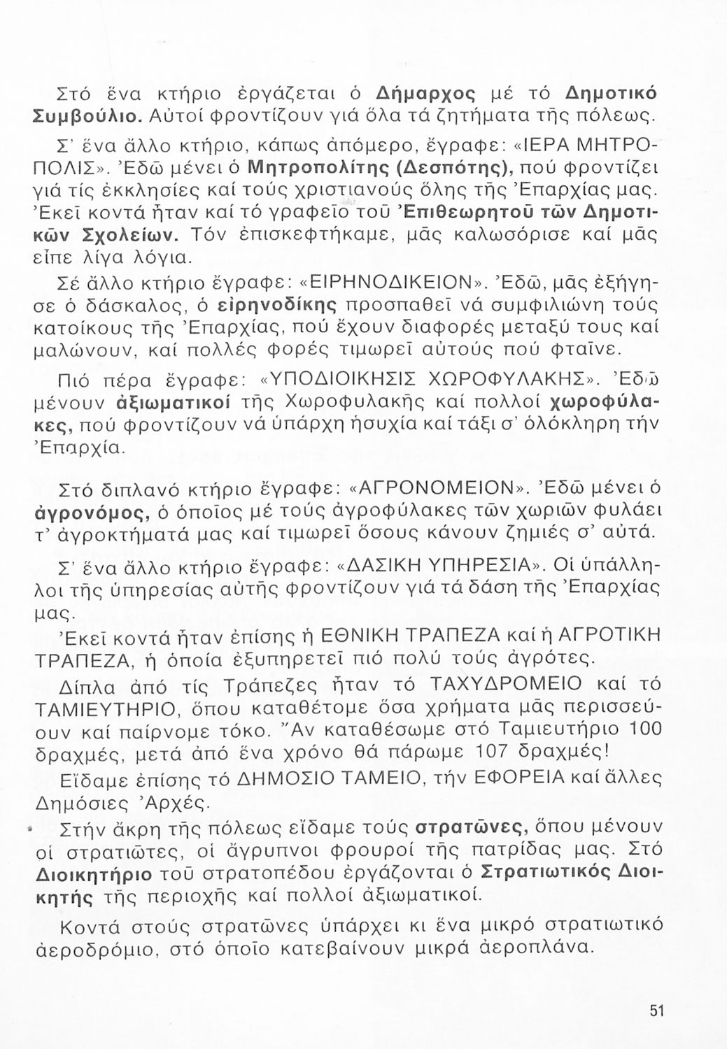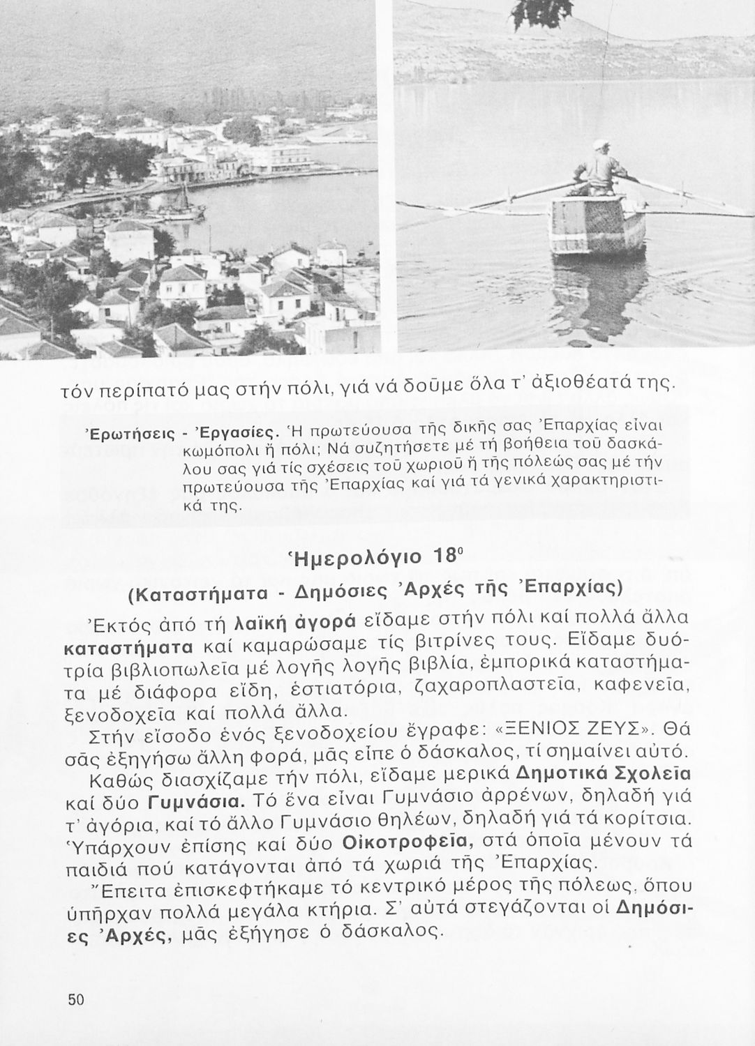 520 ## _aΣχολικό εγχειρίδιο Γεωγραφίας Γ ΄ και Δ' Δημοτικού. Το πρώτο μέρος του βιβλίου απευθύνεται σε μαθητές της Γ' Δημοτικού και αποτελεί μια εισαγωγή στην πατριδογνωσία με έμφαση στις παραδόσεις της ελληνικής επαρχίας. Το δεύτερο μέρος αφορά την Δ' Δημοτικού και εξετάζει την οικονομική, πολιτική και γεωφυσική γεωγραφία της Ελλάδας.