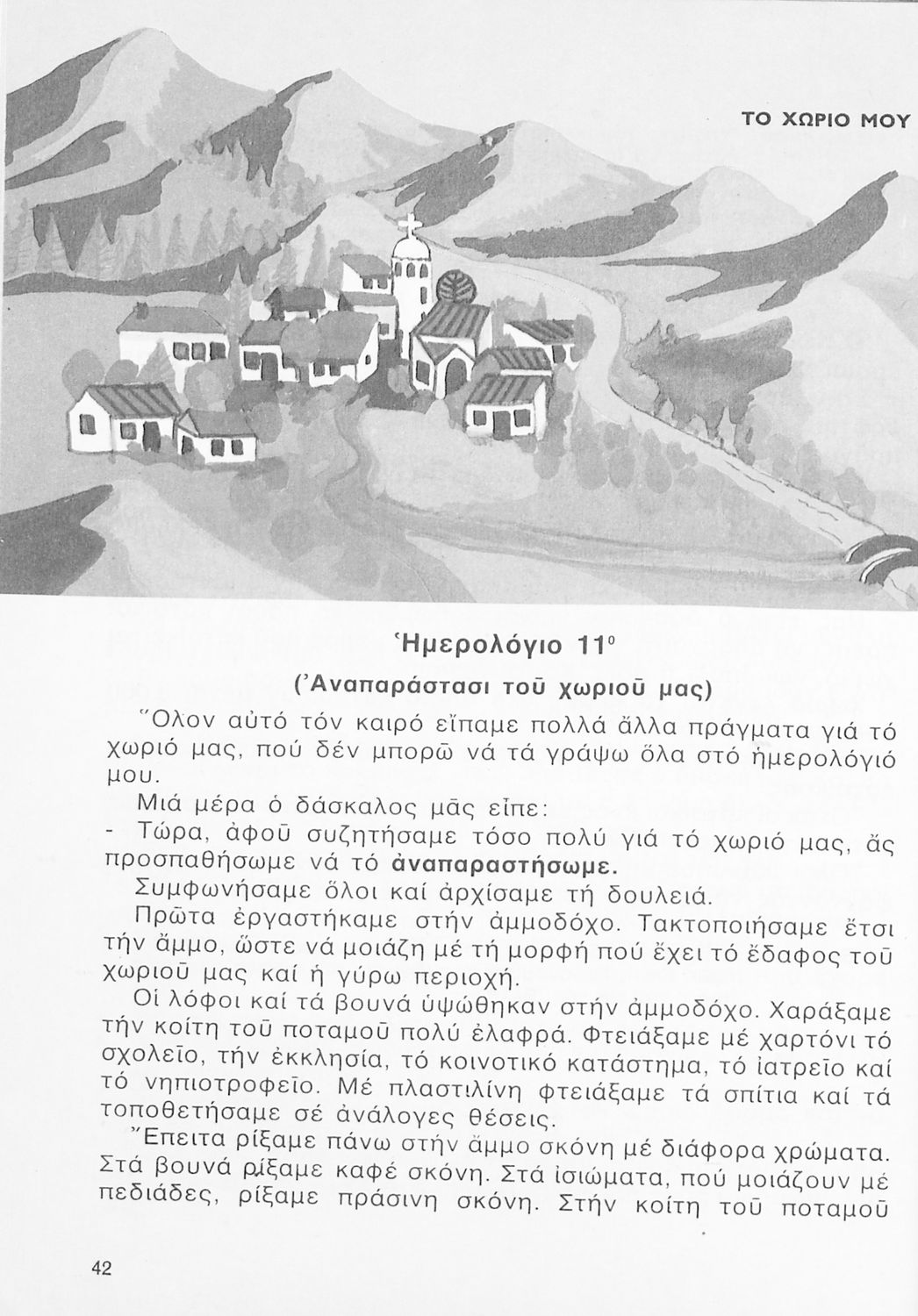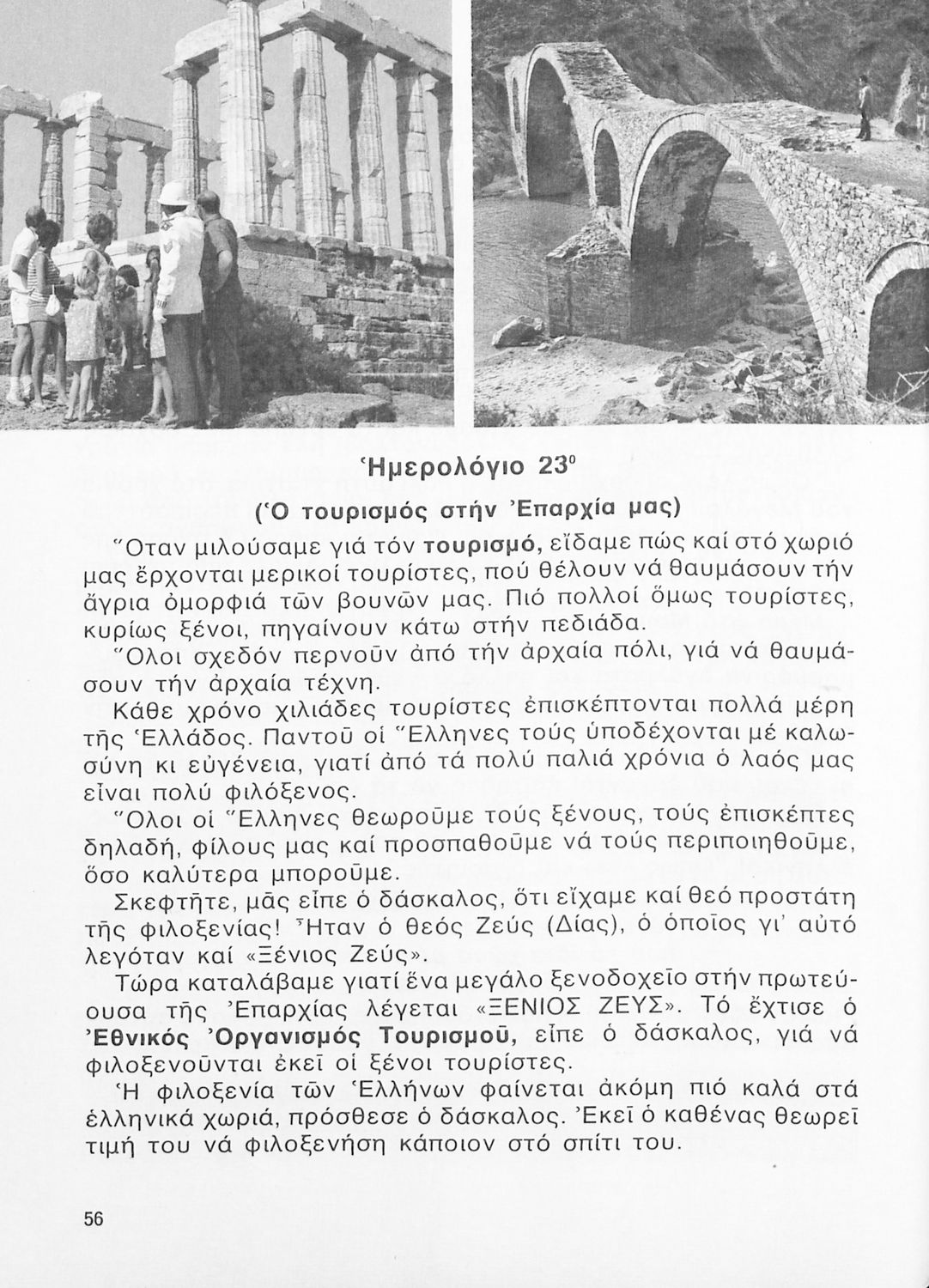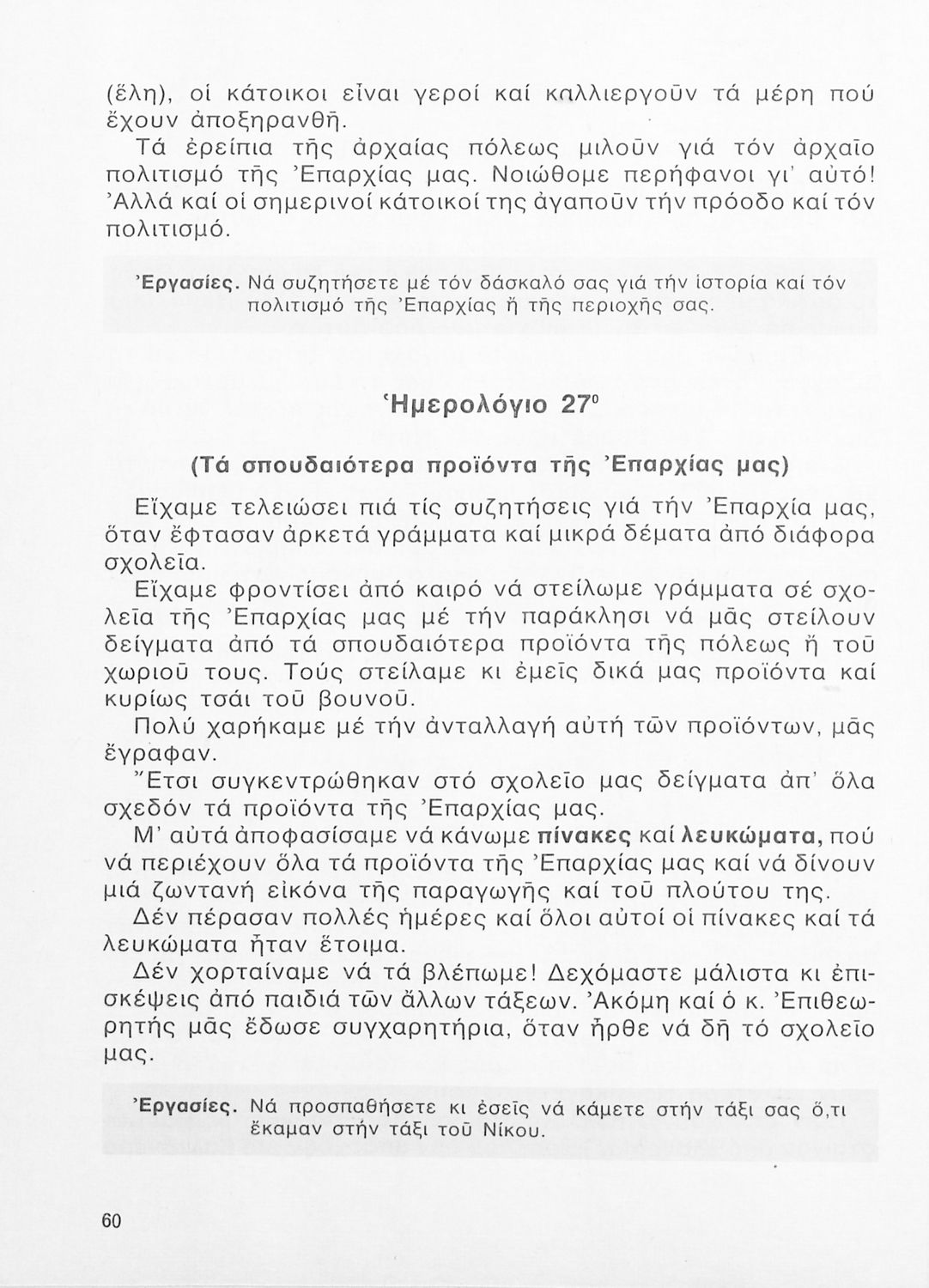 520 ## _aΣχολικό εγχειρίδιο Γεωγραφίας Γ ΄ και Δ' Δημοτικού. Το πρώτο μέρος του βιβλίου απευθύνεται σε μαθητές της Γ' Δημοτικού και αποτελεί μια εισαγωγή στην πατριδογνωσία με έμφαση στις παραδόσεις της ελληνικής επαρχίας. Το δεύτερο μέρος αφορά την Δ' Δημοτικού και εξετάζει την οικονομική, πολιτική και γεωφυσική γεωγραφία της Ελλάδας.
