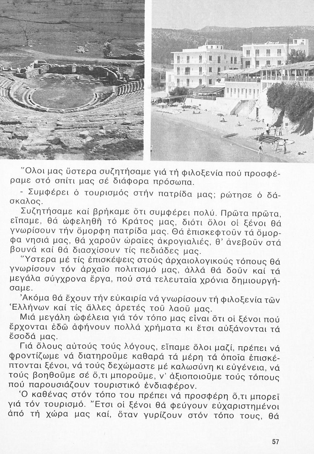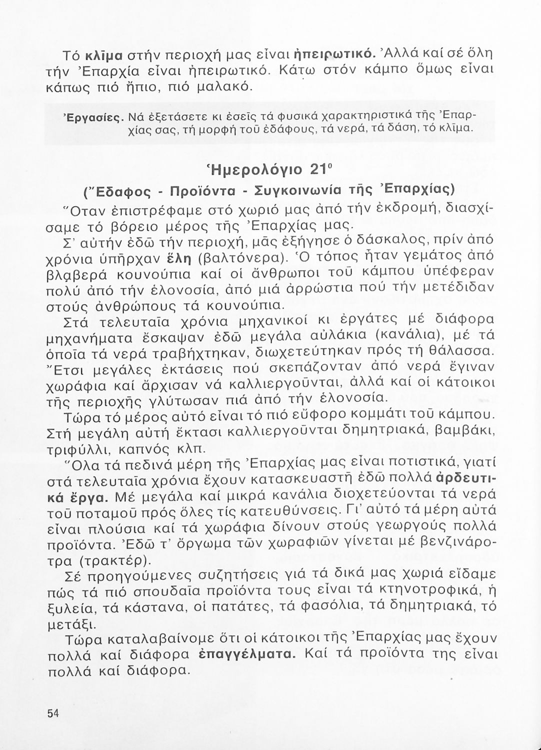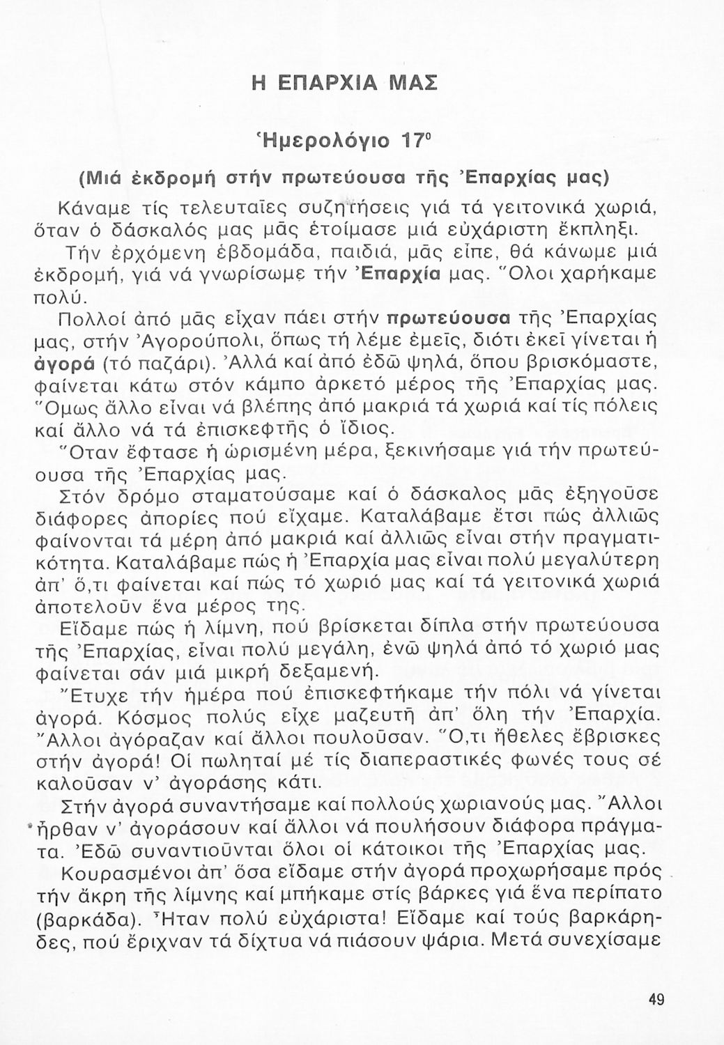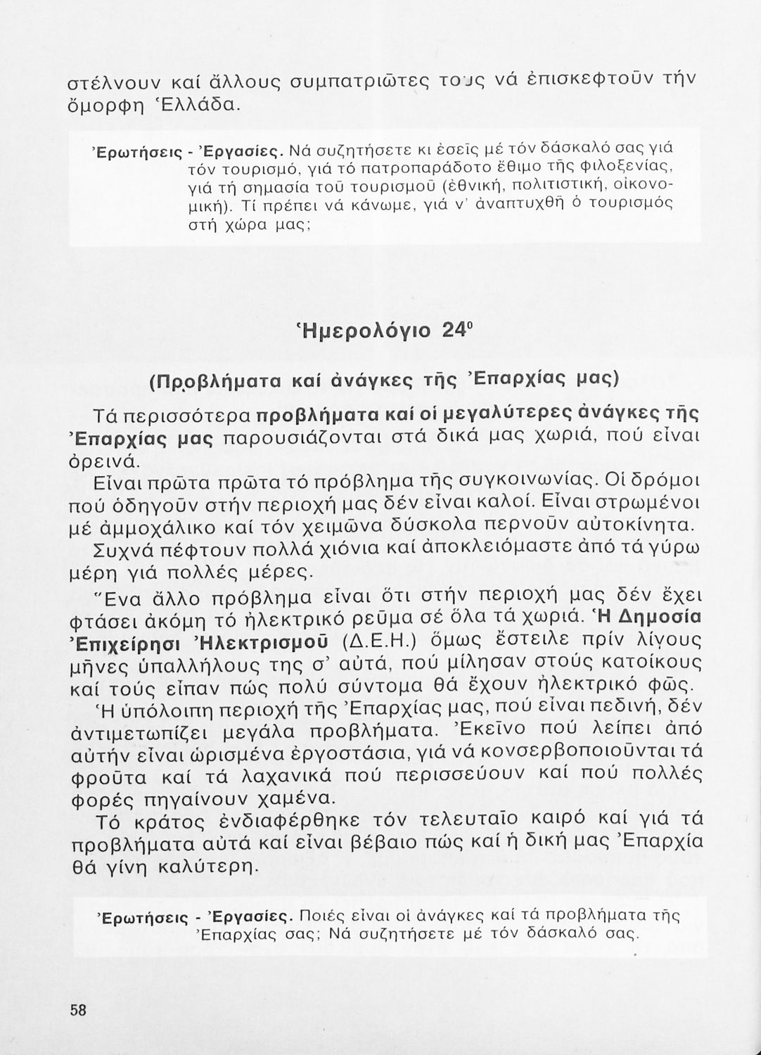 520 ## _aΣχολικό εγχειρίδιο Γεωγραφίας Γ ΄ και Δ' Δημοτικού. Το πρώτο μέρος του βιβλίου απευθύνεται σε μαθητές της Γ' Δημοτικού και αποτελεί μια εισαγωγή στην πατριδογνωσία με έμφαση στις παραδόσεις της ελληνικής επαρχίας. Το δεύτερο μέρος αφορά την Δ' Δημοτικού και εξετάζει την οικονομική, πολιτική και γεωφυσική γεωγραφία της Ελλάδας.