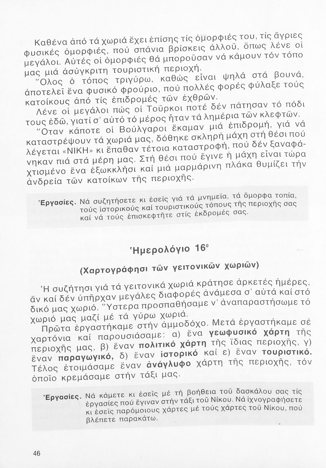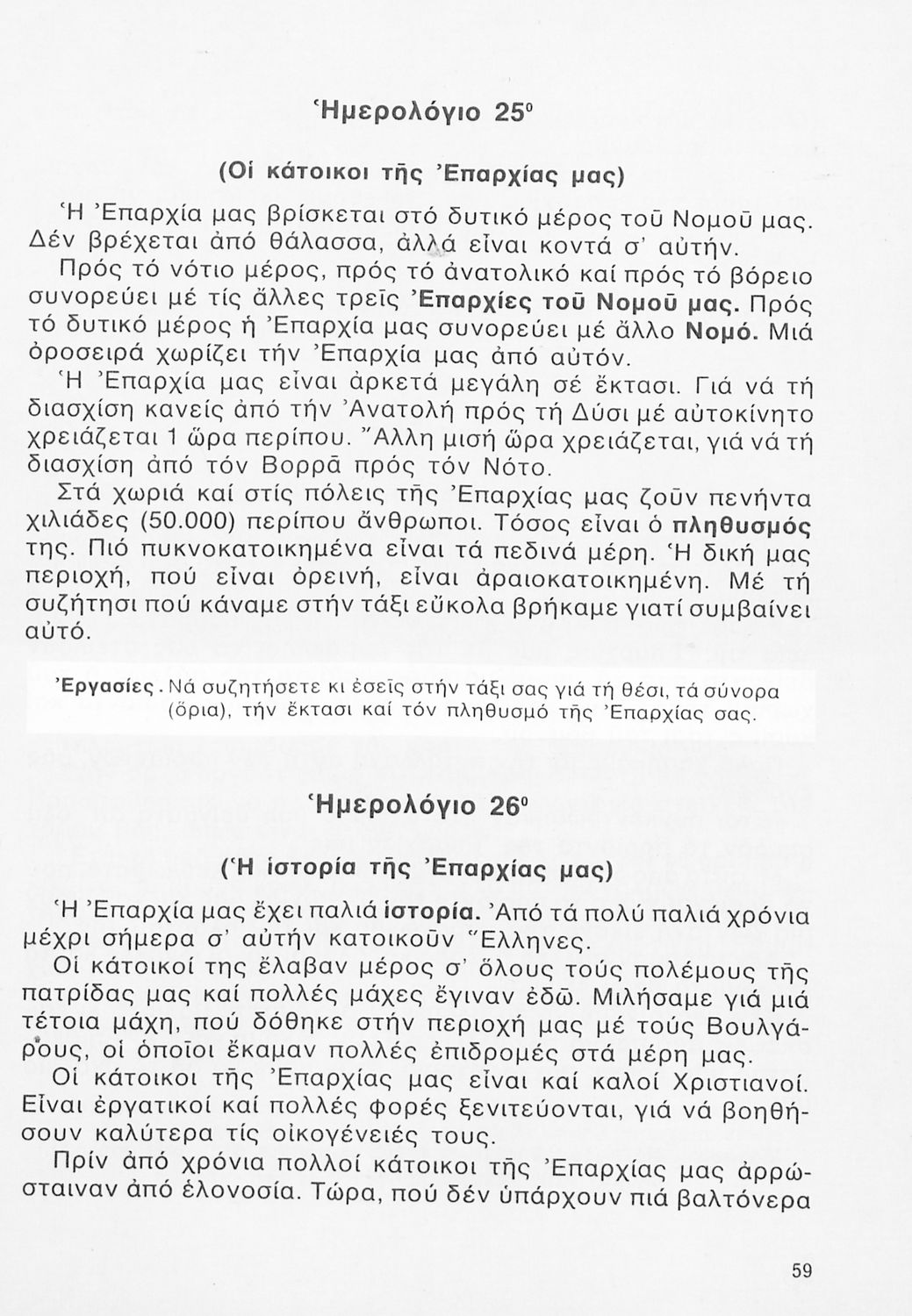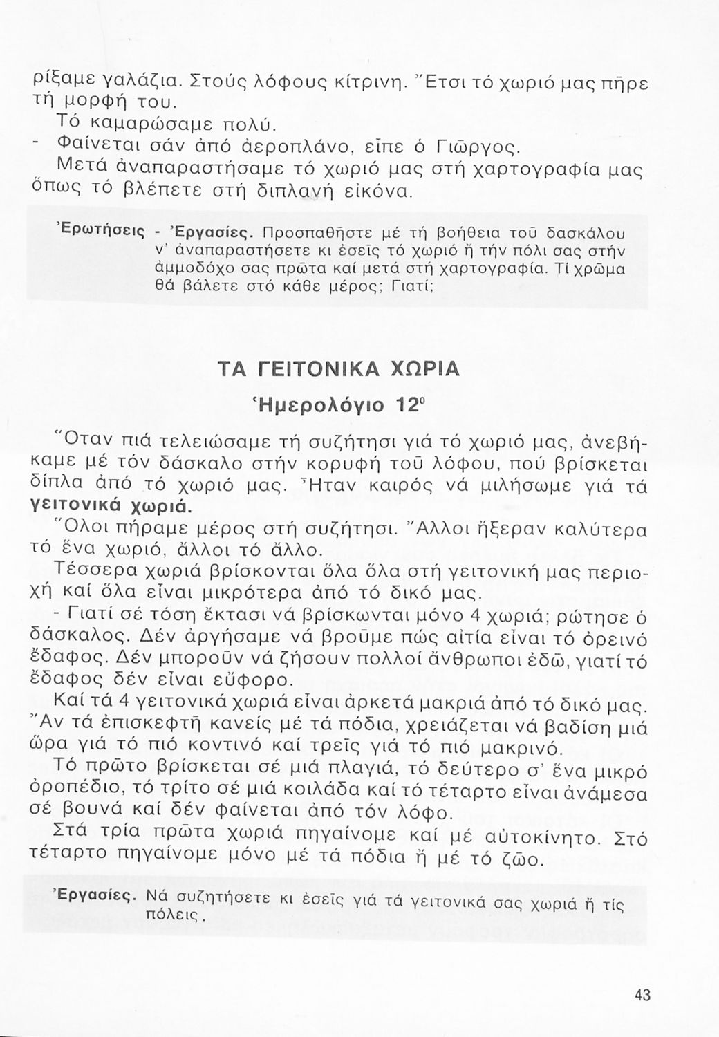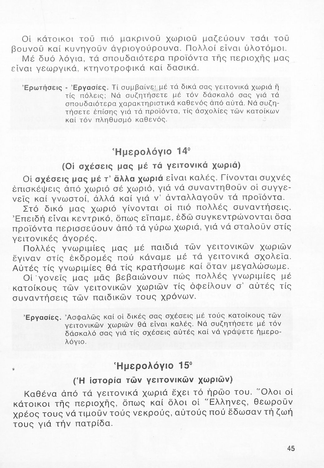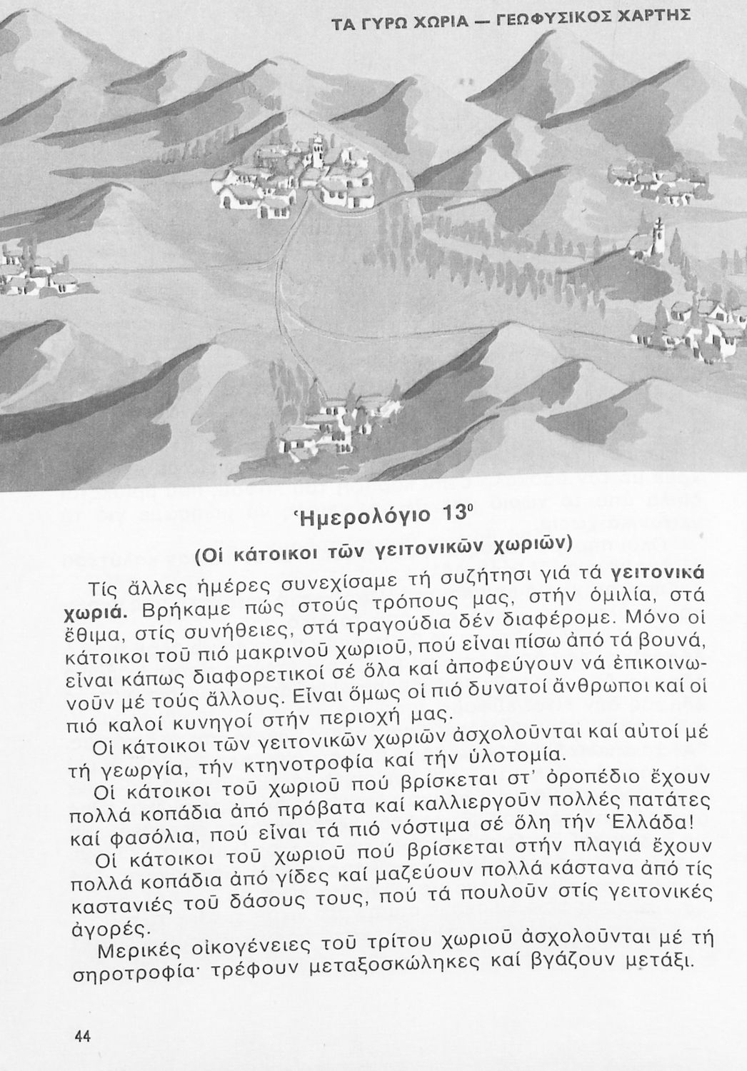 Βαθμίδα εκπαίδευσης: Πρωτοβάθμια Τάξη: Γ' Δημοτικού / Δ' Δημοτικού Μάθημα: Γεωγραφία Γλώσσα: Δημοτική Παρουσίαση περιεχομένου: Σχολικό εγχειρίδιο Γεωγραφίας Γ ΄ και Δ' Δημοτικού. Το πρώτο μέρος του βιβλίου απευθύνεται σε μαθητές της Γ' Δημοτικού και αποτελεί μια εισαγωγή στην πατριδογνωσία με έμφαση στις παραδόσεις της ελληνικής επαρχίας. Το δεύτερο μέρος αφορά την Δ' Δημοτικού και εξετάζει την οικονομική, πολιτική και γεωφυσική γεωγραφία της Ελλάδας. |