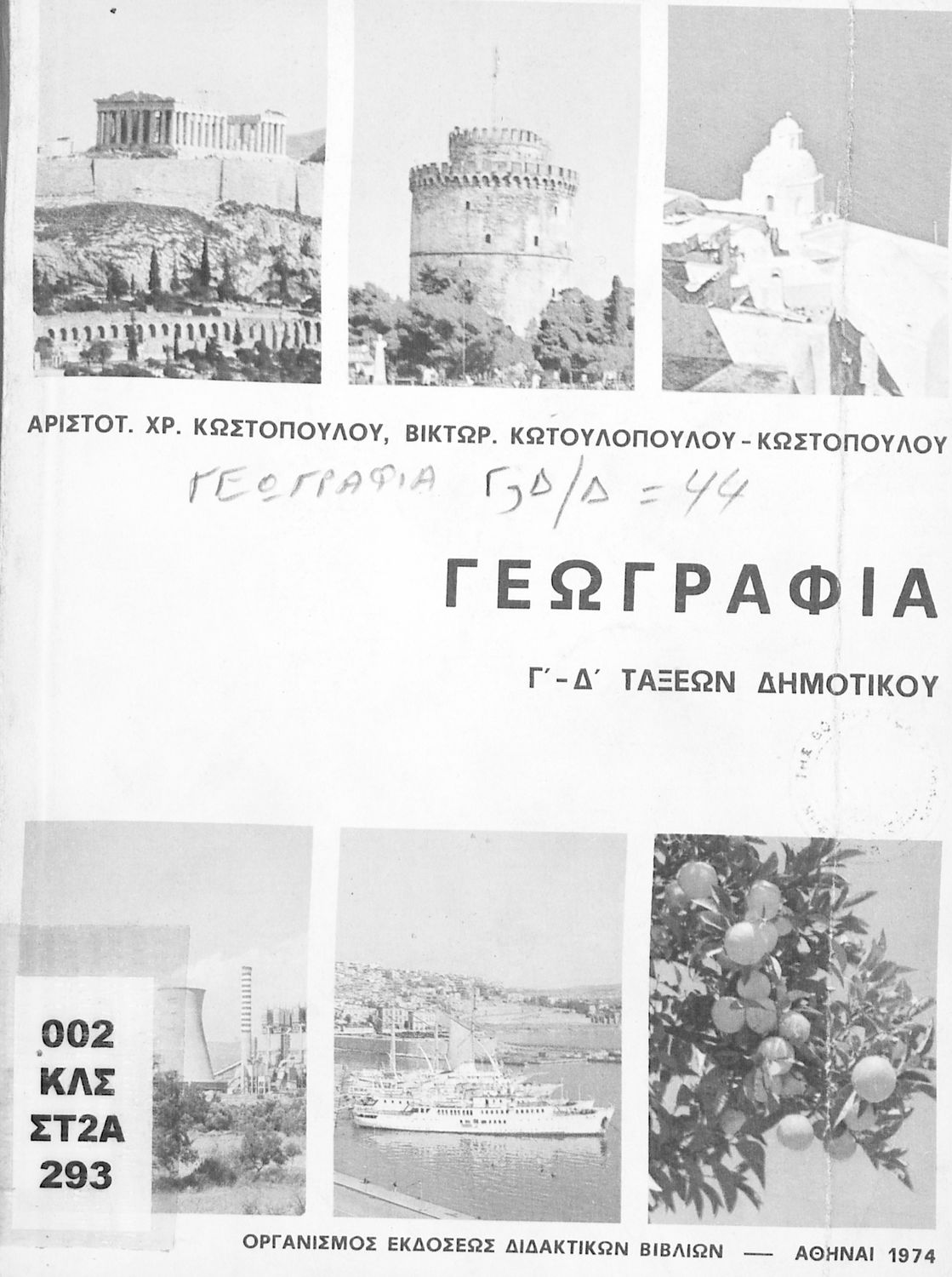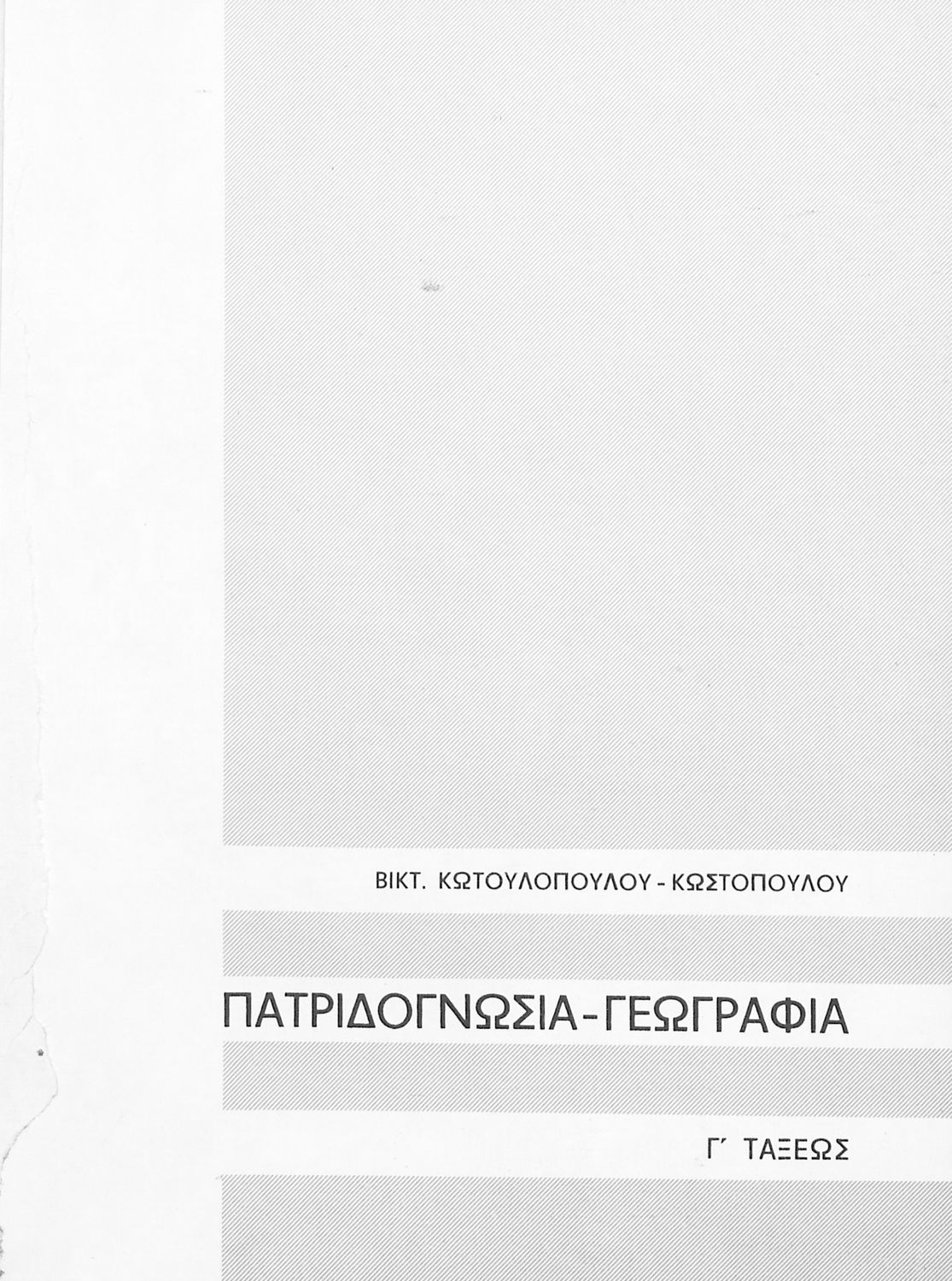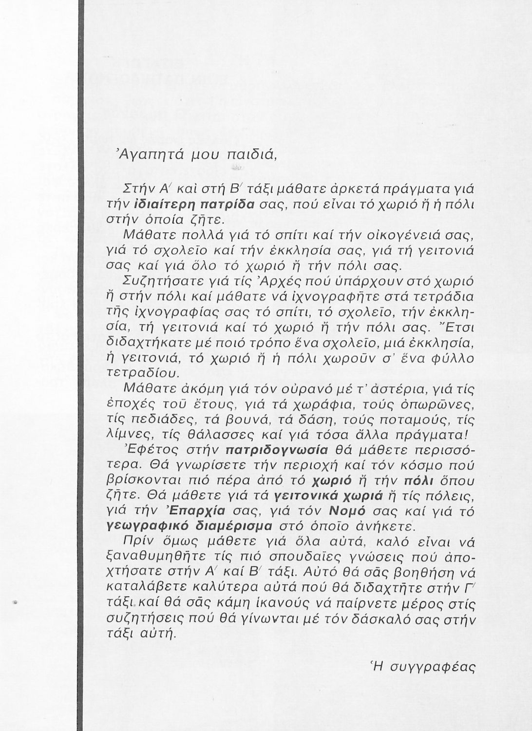 Σχολικό εγχειρίδιο Γεωγραφίας Γ ΄ και Δ' Δημοτικού. Το πρώτο μέρος του βιβλίου απευθύνεται σε μαθητές της Γ' Δημοτικού και αποτελεί μια εισαγωγή στην πατριδογνωσία με έμφαση στις παραδόσεις της ελληνικής ...