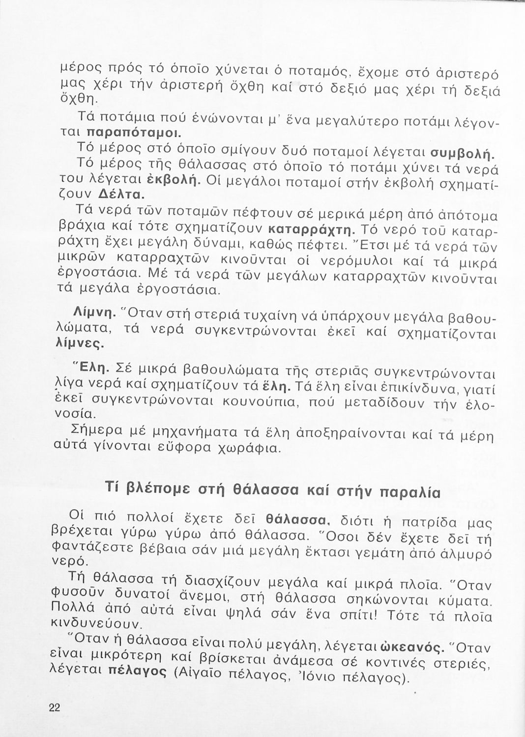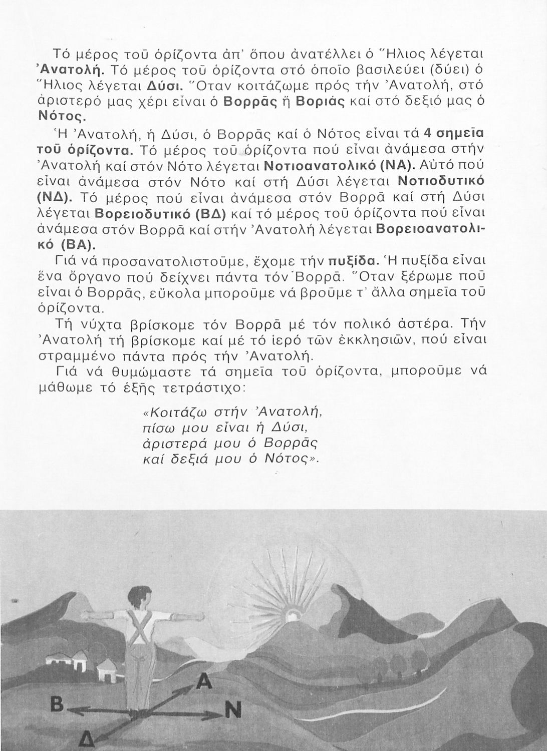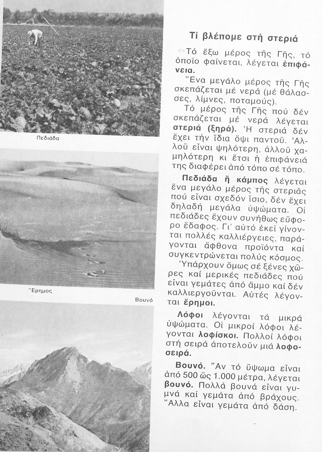 Παρουσίαση περιεχομένου: Σχολικό εγχειρίδιο Γεωγραφίας Γ ΄ και Δ' Δημοτικού. Το πρώτο μέρος του βιβλίου απευθύνεται σε μαθητές της Γ' Δημοτικού και αποτελεί μια εισαγωγή στην πατριδογνωσία με έμφαση στις παραδόσεις της ελληνικής επαρχίας. Το δεύτερο μέρος αφορά την Δ' Δημοτικού και εξετάζει την οικονομική, πολιτική και γεωφυσική γεωγραφία της Ελλάδας.