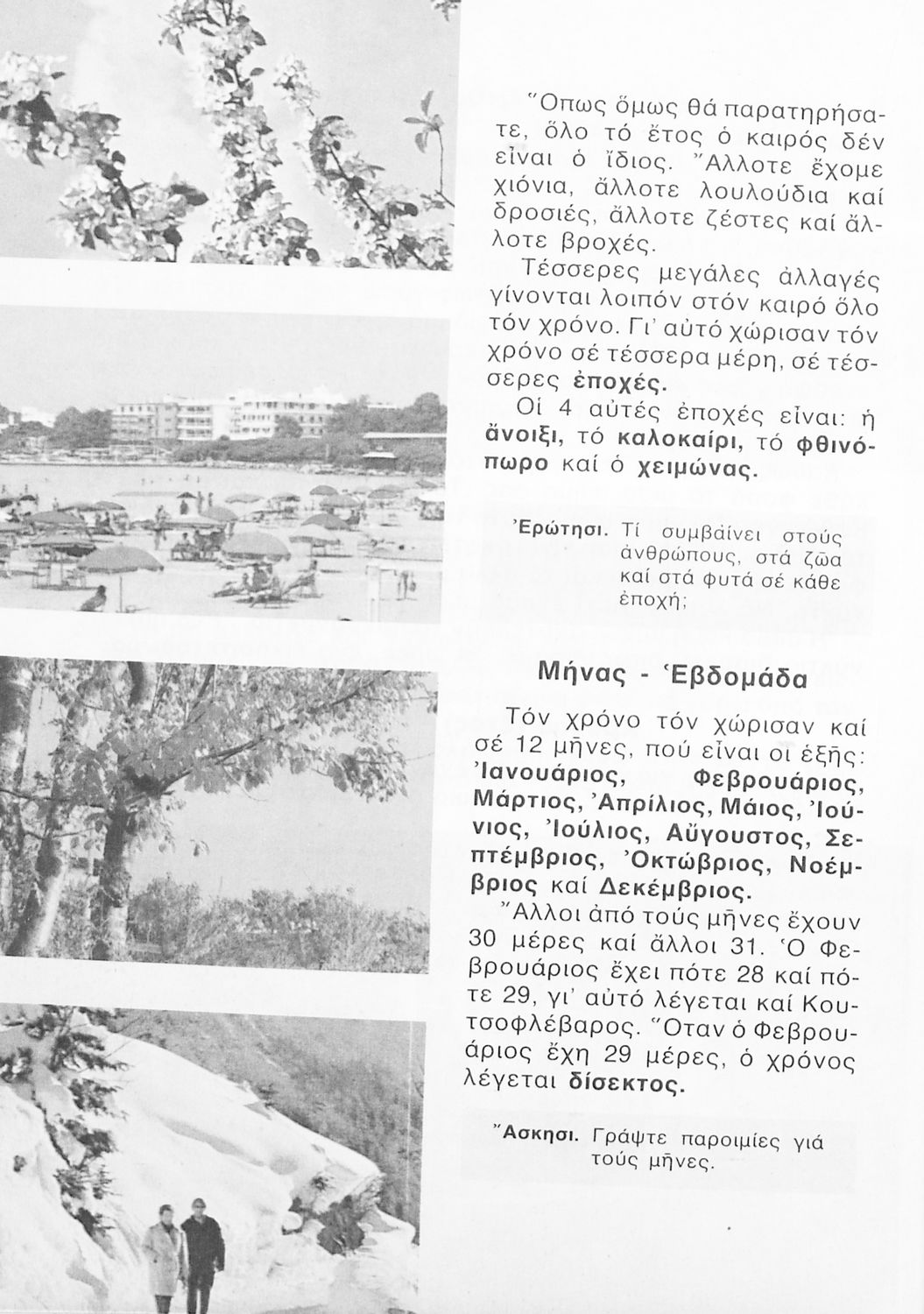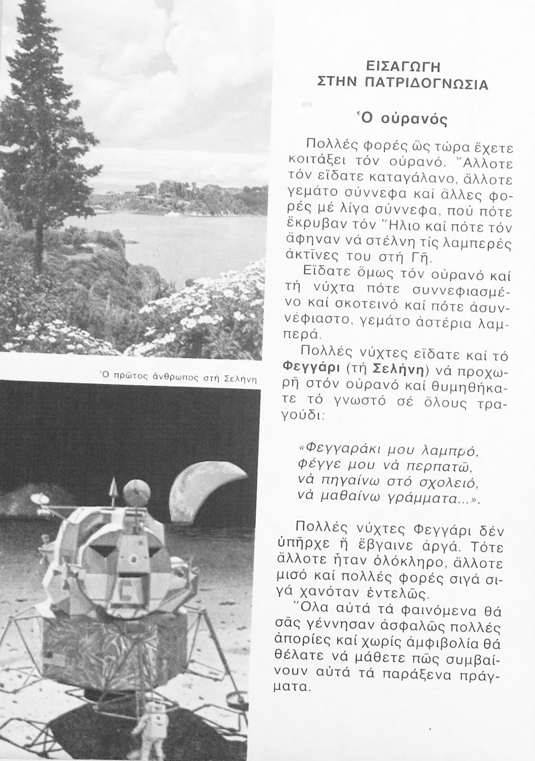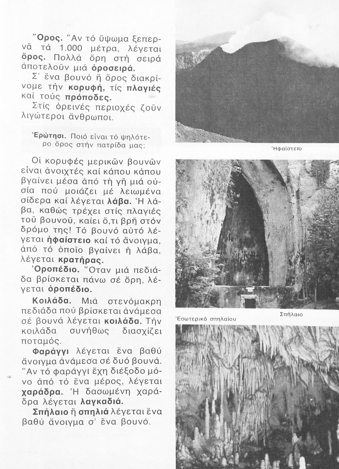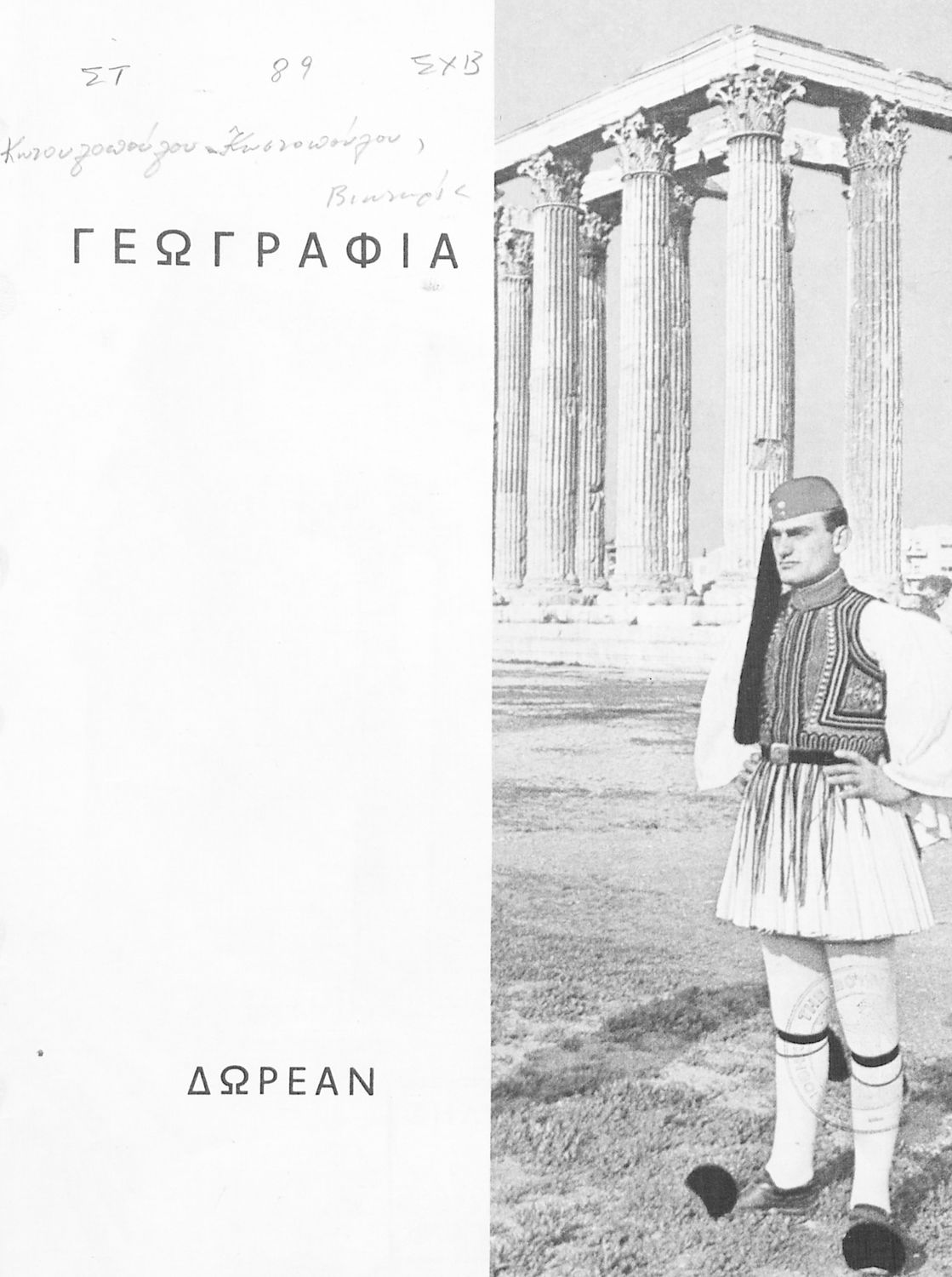 Σχολικό εγχειρίδιο Γεωγραφίας Γ ΄ και Δ' Δημοτικού. Το πρώτο μέρος του βιβλίου απευθύνεται σε μαθητές της Γ' Δημοτικού και αποτελεί μια εισαγωγή στην πατριδογνωσία με έμφαση στις παραδόσεις της ελληνικής επαρχίας. Το δεύτερο μέρος αφορά την Δ' Δημοτικού και εξετάζει την οικονομική, πολιτική και γεωφυσική γεωγραφία της Ελλάδας.