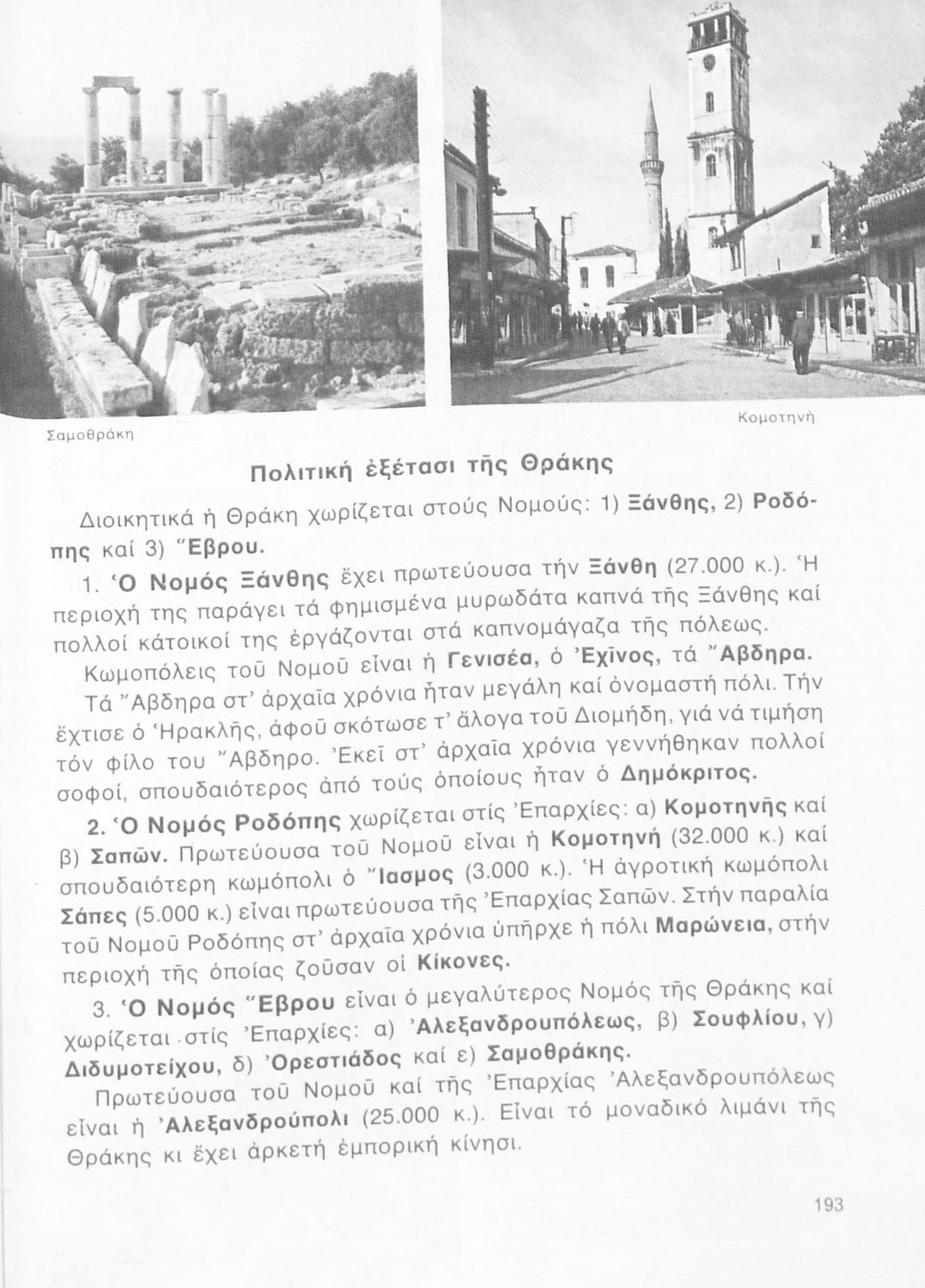 Βαθμίδα εκπαίδευσης: Πρωτοβάθμια Τάξη: Γ' Δημοτικού / Δ' Δημοτικού Μάθημα: Γεωγραφία Γλώσσα: Δημοτική Παρουσίαση περιεχομένου: Σχολικό εγχειρίδιο Γεωγραφίας Γ ΄ και Δ' Δημοτικού. Το πρώτο μέρος του βιβλίου απευθύνεται σε μαθητές της Γ' Δημοτικού και αποτελεί μια εισαγωγή στην έννοια της πατριδογνωσίας μέσα από τις παραδόσεις της ελληνικής επαρχίας. Το δεύτερο μέρος αφορά τη Δ' Δημοτικού και εξετάζει την οικονομική, πολιτική και γεωφυσική γεωγραφία της Ελλάδας. |