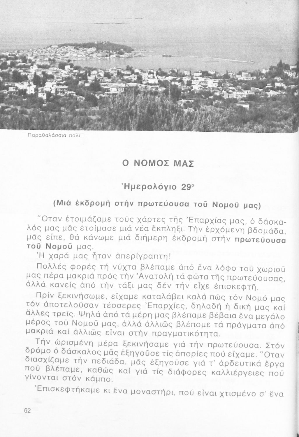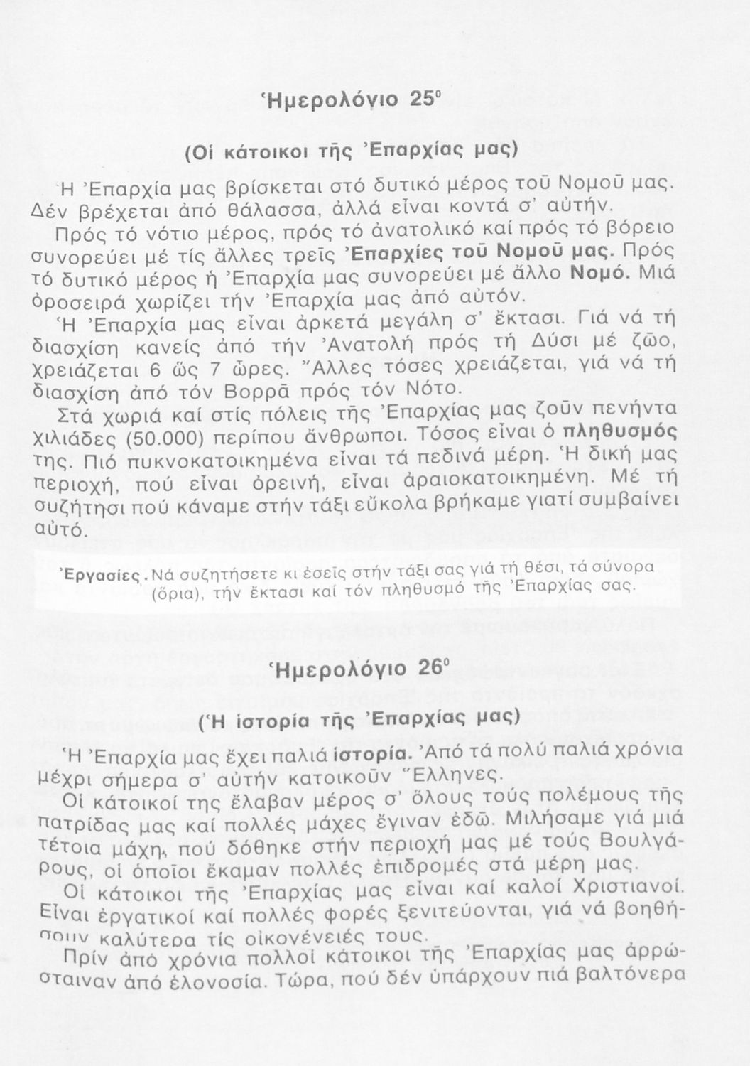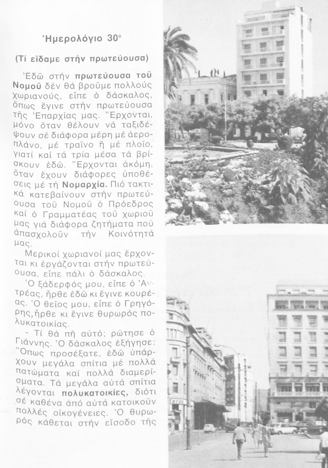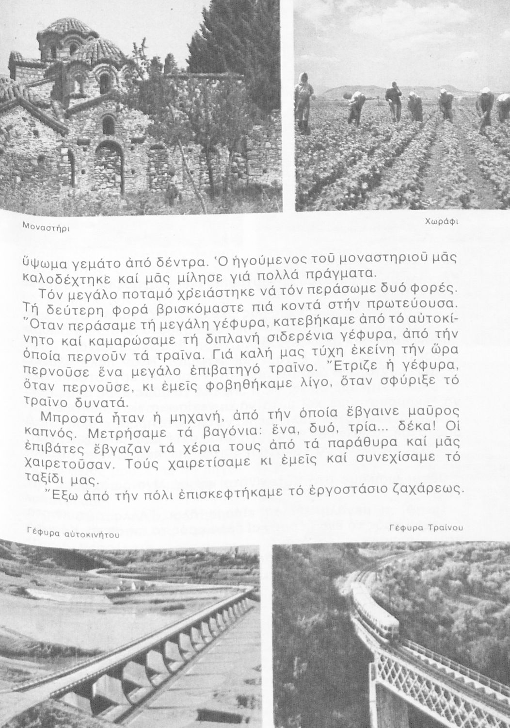 Σχολικό εγχειρίδιο Γεωγραφίας Γ ΄ και Δ' Δημοτικού. Το πρώτο μέρος του βιβλίου απευθύνεται σε μαθητές της Γ' Δημοτικού και αποτελεί μια εισαγωγή στην έννοια της πατριδογνωσίας μέσα από τις παραδόσεις της ελληνικής επαρχίας. Το δεύτερο μέρος αφορά τη Δ' Δημοτικού και εξετάζει την οικονομική, πολιτική και γεωφυσική γεωγραφία της Ελλάδας.