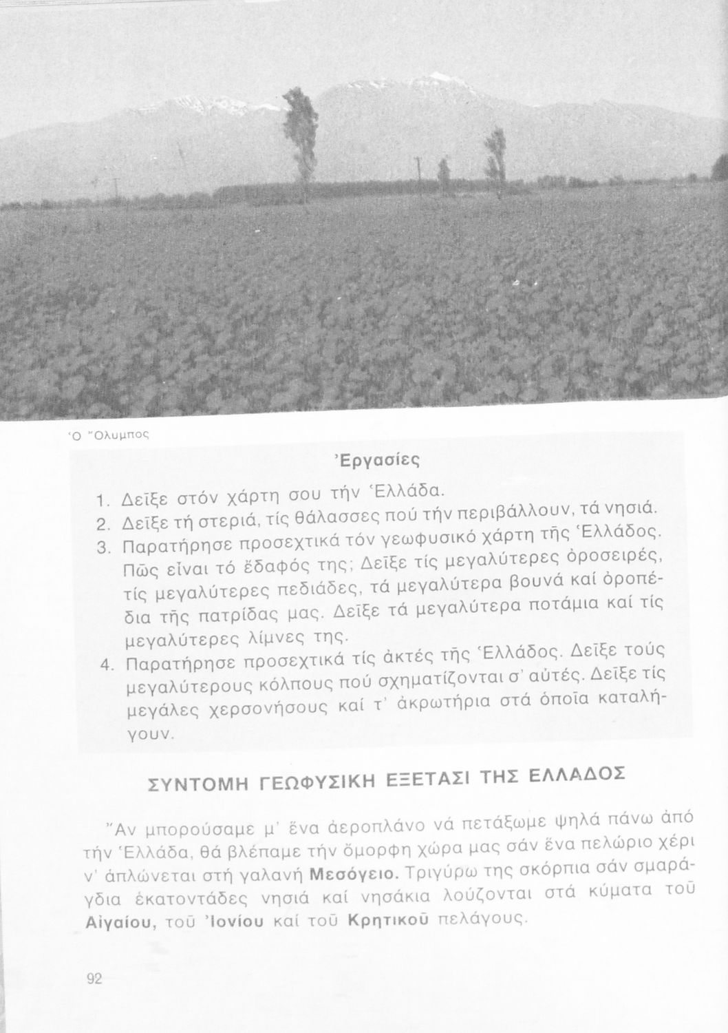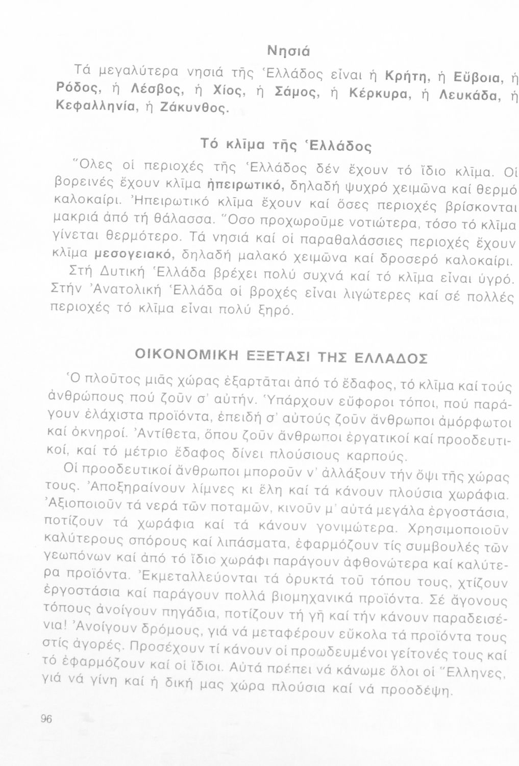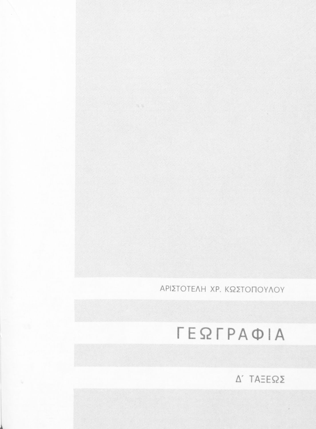 Βαθμίδα εκπαίδευσης: Πρωτοβάθμια Τάξη: Γ' Δημοτικού / Δ' Δημοτικού Μάθημα: Γεωγραφία Γλώσσα: Δημοτική Παρουσίαση περιεχομένου: Σχολικό εγχειρίδιο Γεωγραφίας Γ ΄ και Δ' Δημοτικού. Το πρώτο μέρος του βιβλίου απευθύνεται σε μαθητές της Γ' Δημοτικού και αποτελεί μια εισαγωγή στην έννοια της πατριδογνωσίας μέσα από τις παραδόσεις της ελληνικής επαρχίας. Το δεύτερο μέρος αφορά τη Δ' Δημοτικού και εξετάζει την οικονομική, πολιτική και γεωφυσική γεωγραφία της Ελλάδας. |