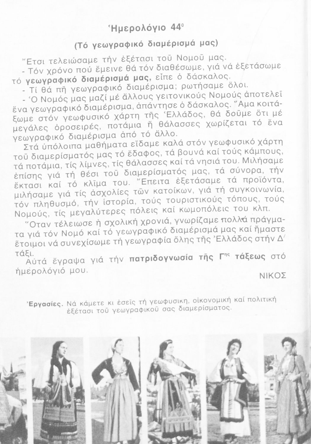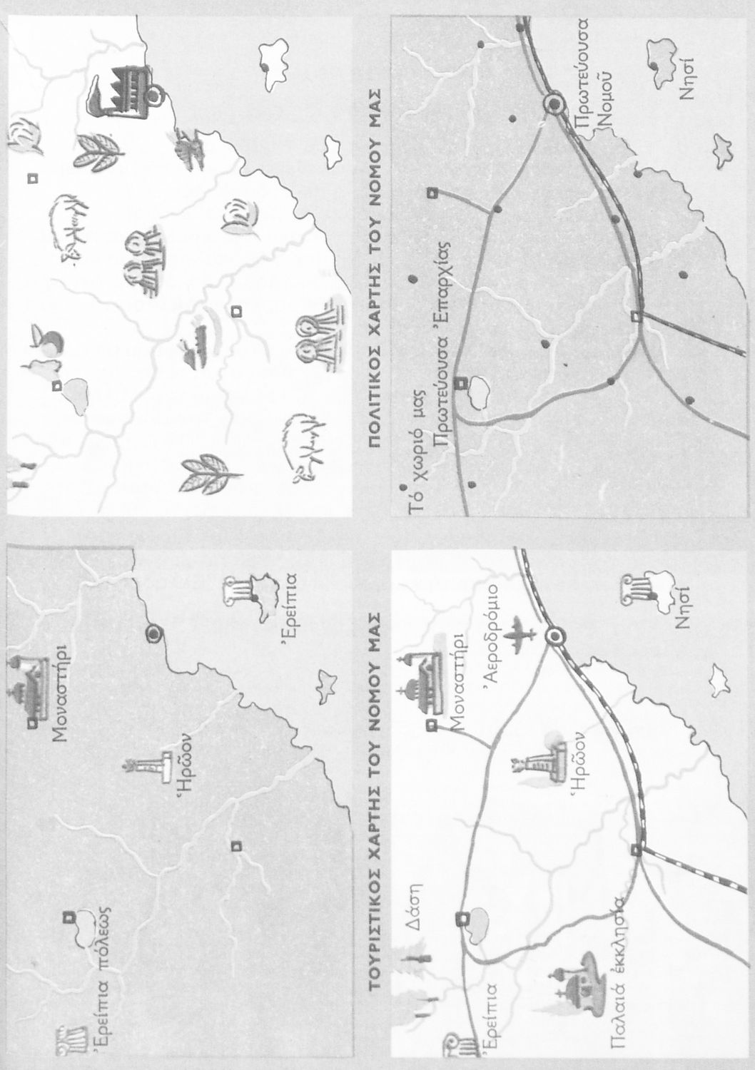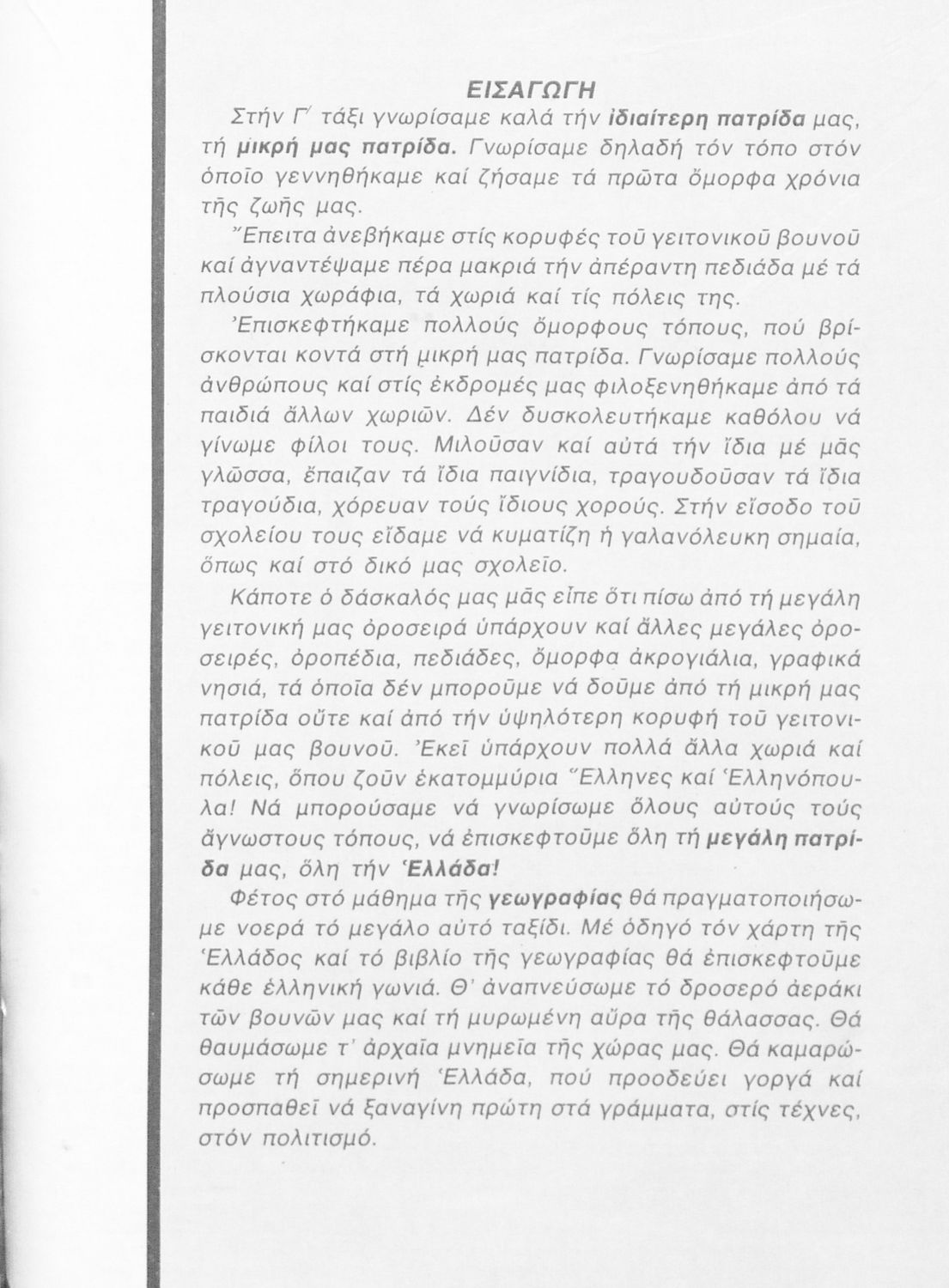 Σχολικό εγχειρίδιο Γεωγραφίας Γ ΄ και Δ' Δημοτικού. Το πρώτο μέρος του βιβλίου απευθύνεται σε μαθητές της Γ' Δημοτικού και αποτελεί μια εισαγωγή στην έννοια της πατριδογνωσίας μέσα από τις παραδόσεις της ελληνικής επαρχίας. Το δεύτερο μέρος αφορά τη Δ' Δημοτικού και εξετάζει την οικονομική, πολιτική και γεωφυσική γεωγραφία της Ελλάδας.
