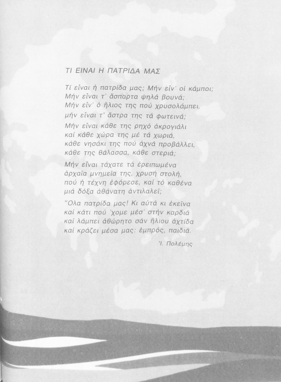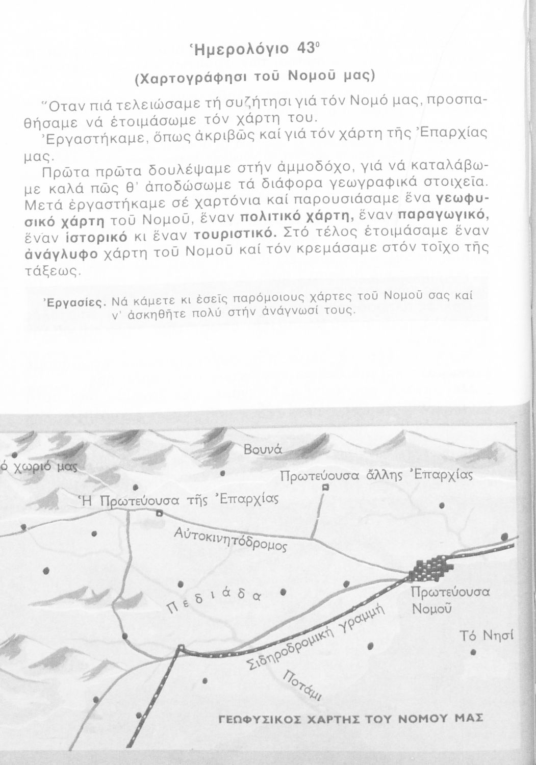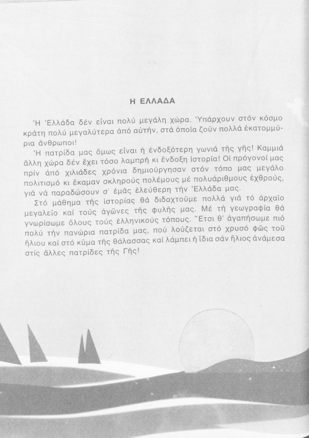Σχολικό εγχειρίδιο Γεωγραφίας Γ ΄ και Δ' Δημοτικού. Το πρώτο μέρος του βιβλίου απευθύνεται σε μαθητές της Γ' Δημοτικού και αποτελεί μια εισαγωγή στην έννοια της πατριδογνωσίας μέσα από τις παραδόσεις της ελληνικής επαρχίας. Το δεύτερο μέρος αφορά τη Δ' Δημοτικού και εξετάζει την οικονομική, πολιτική και γεωφυσική γεωγραφία της Ελλάδας.