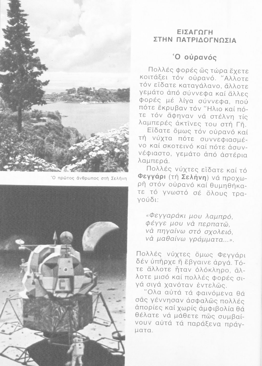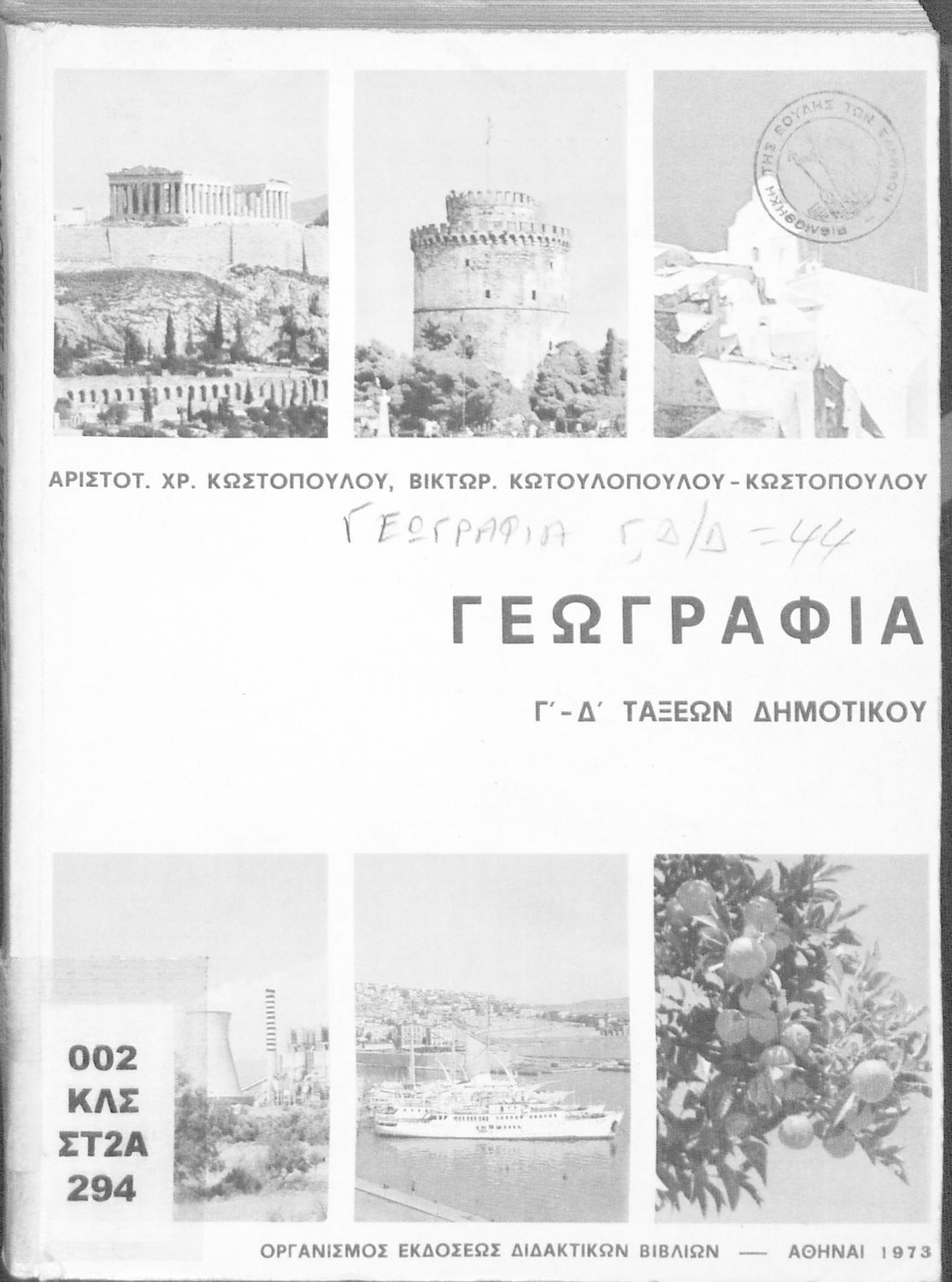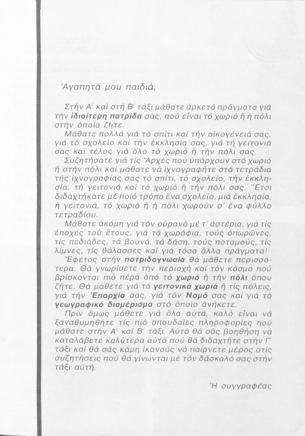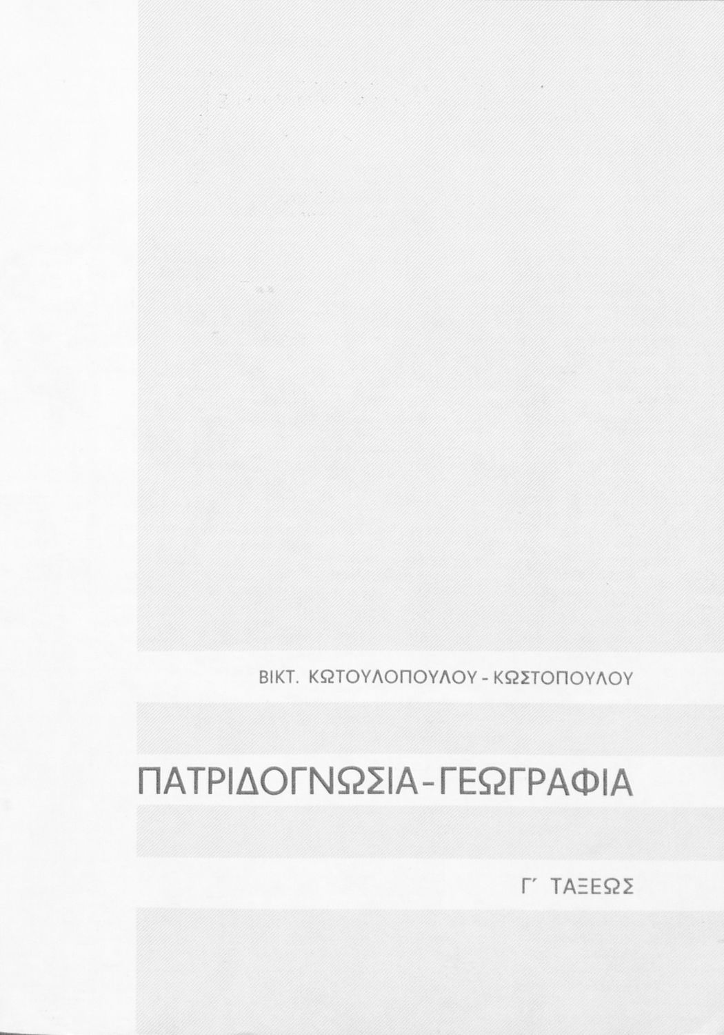 Σχολικό εγχειρίδιο Γεωγραφίας Γ ΄ και Δ' Δημοτικού. Το πρώτο μέρος του βιβλίου απευθύνεται σε μαθητές της Γ' Δημοτικού και αποτελεί μια εισαγωγή στην πατριδογνωσία με έμφαση στις παραδόσεις της ελληνικής ...