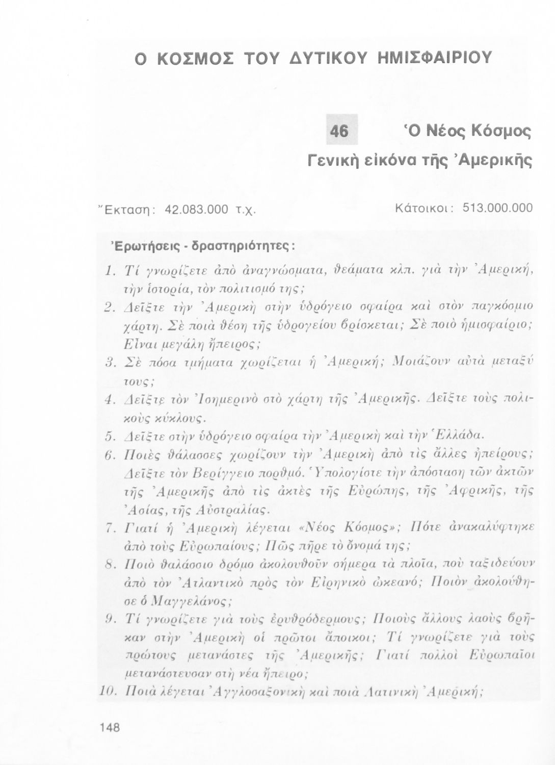 Σχολικό εγχειρίδιο Γεωγραφίας Ε΄ Δημοτικού που περιλαμβάνει εισαγωγή στη φυσική γεωγραφία εξετάζει την Ελλάδα και ενδεικτικές χώρες και περιοχές από τις πέντε ηπείρους, εκτός της Ευρώπης, από γεωφυσική και πολιτική άποψη.