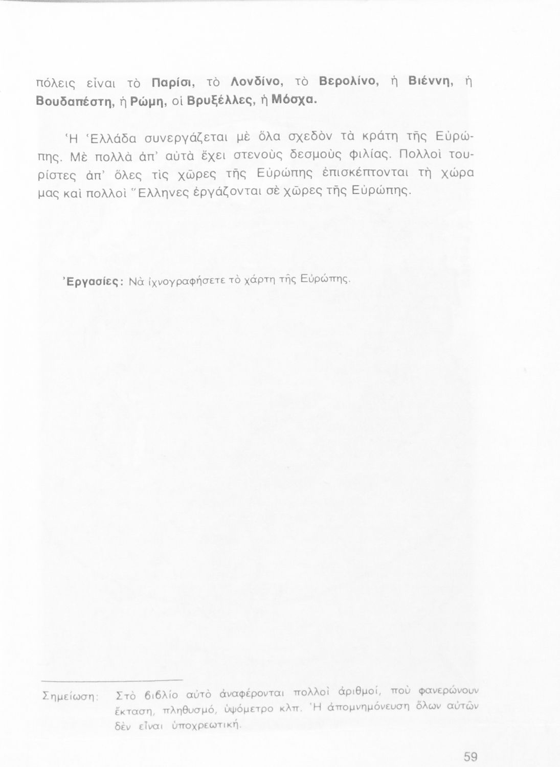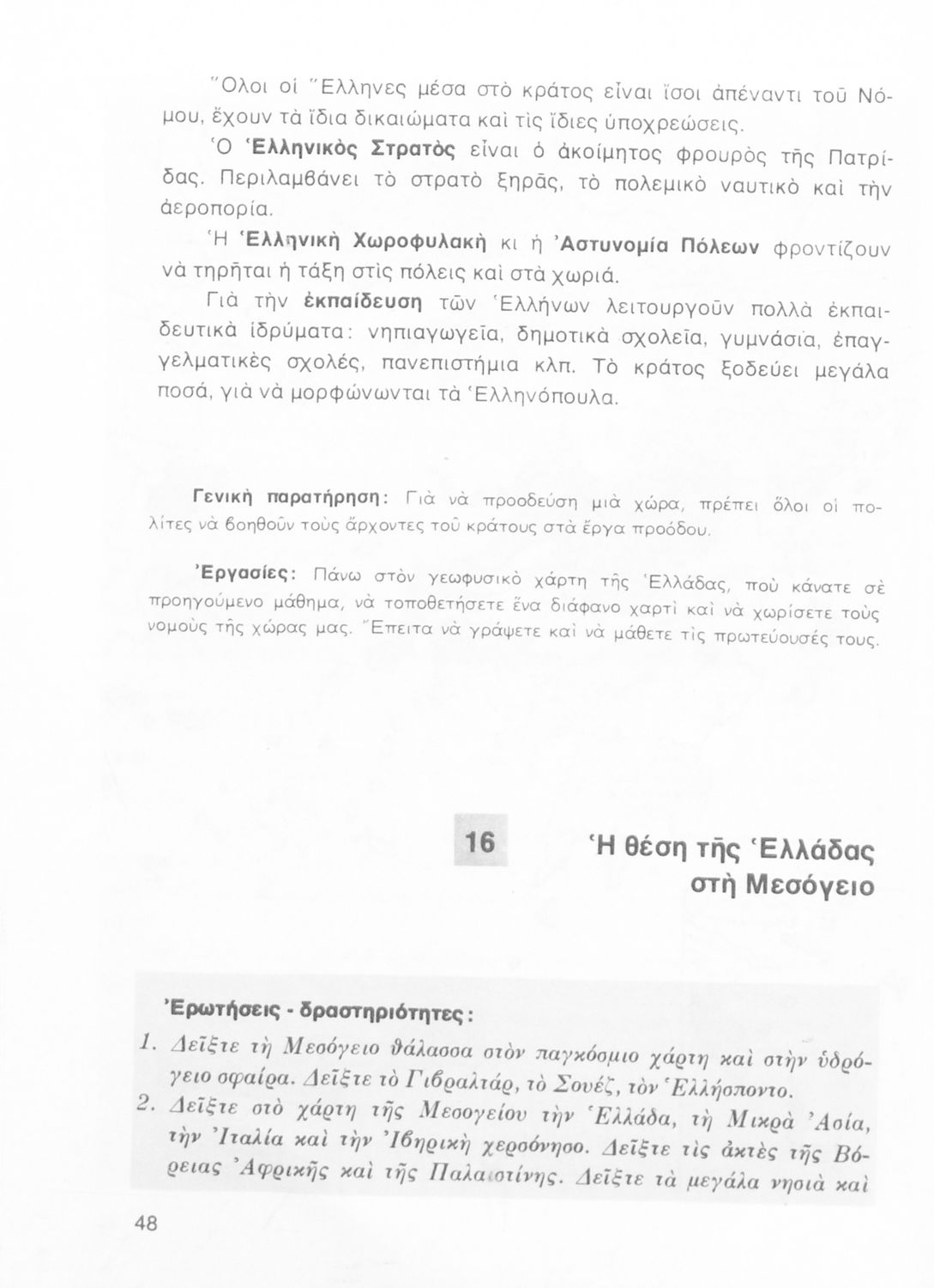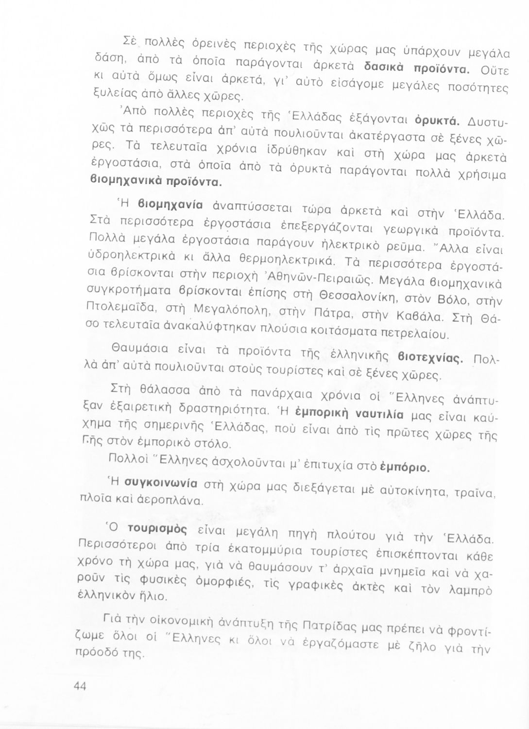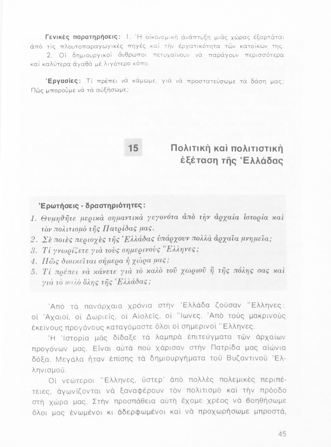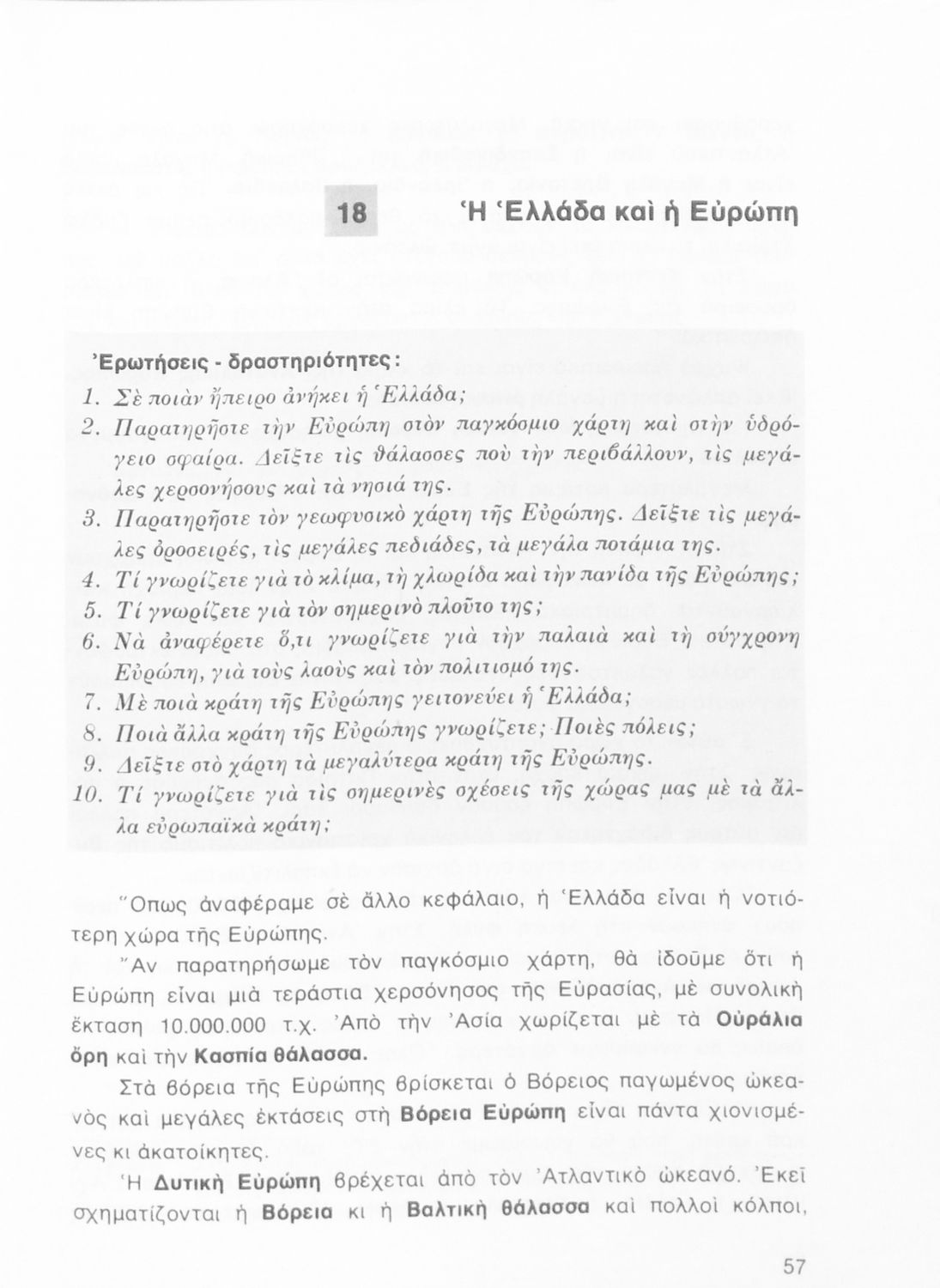 Σχολικό εγχειρίδιο Γεωγραφίας Ε΄ Δημοτικού που περιλαμβάνει εισαγωγή στη φυσική γεωγραφία εξετάζει την Ελλάδα και ενδεικτικές χώρες και περιοχές από τις πέντε ηπείρους, εκτός της Ευρώπης, από γεωφυσική και πολιτική άποψη.