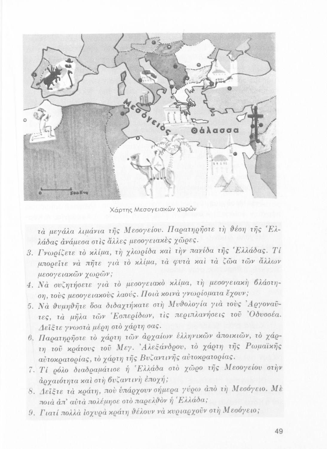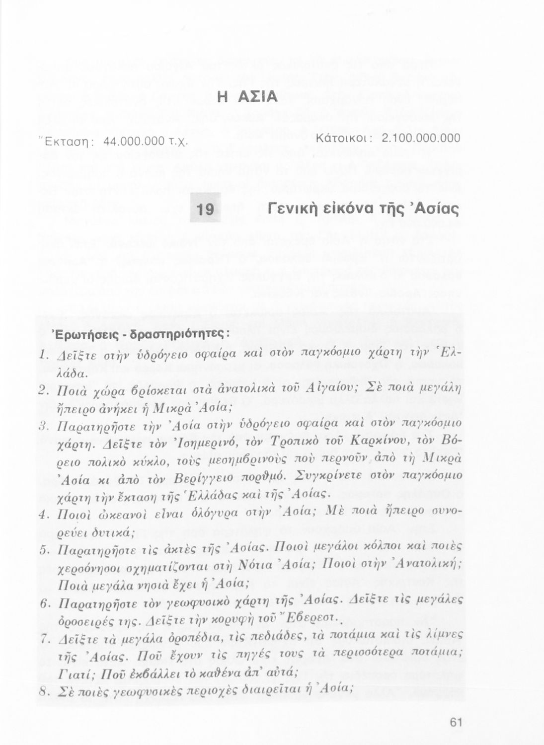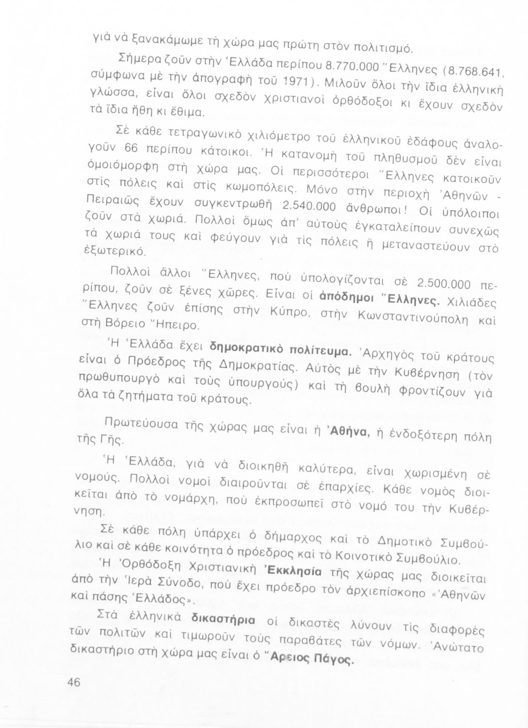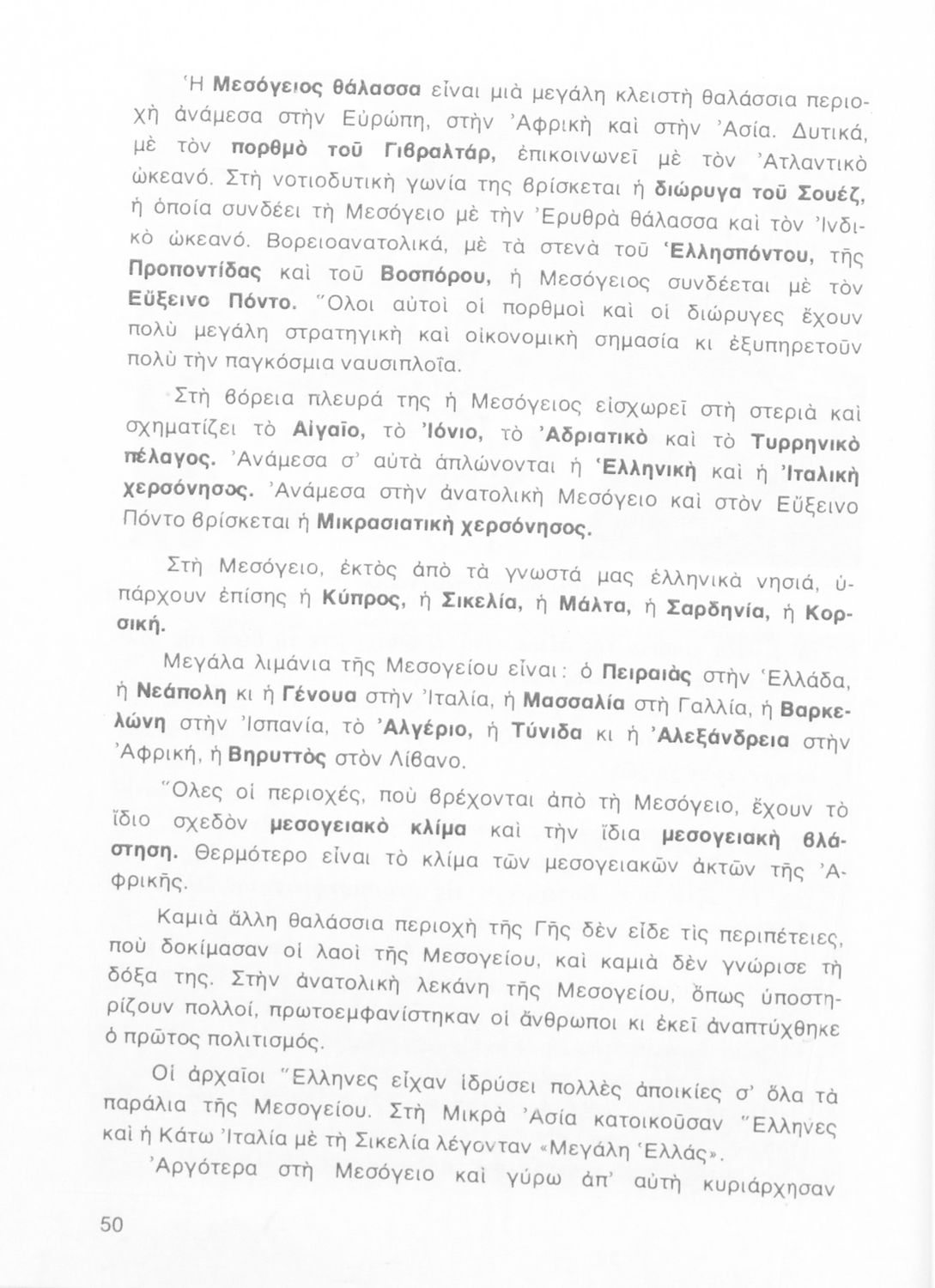 Σχολικό εγχειρίδιο Γεωγραφίας Ε΄ Δημοτικού που περιλαμβάνει εισαγωγή στη φυσική γεωγραφία εξετάζει την Ελλάδα και ενδεικτικές χώρες και περιοχές από τις πέντε ηπείρους, εκτός της Ευρώπης, από γεωφυσική και πολιτική άποψη.