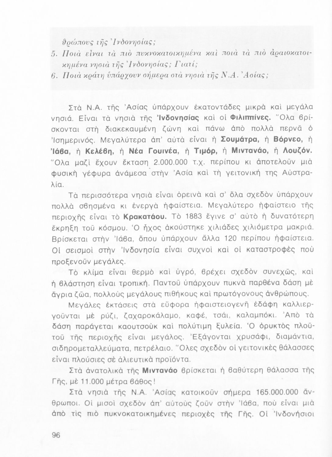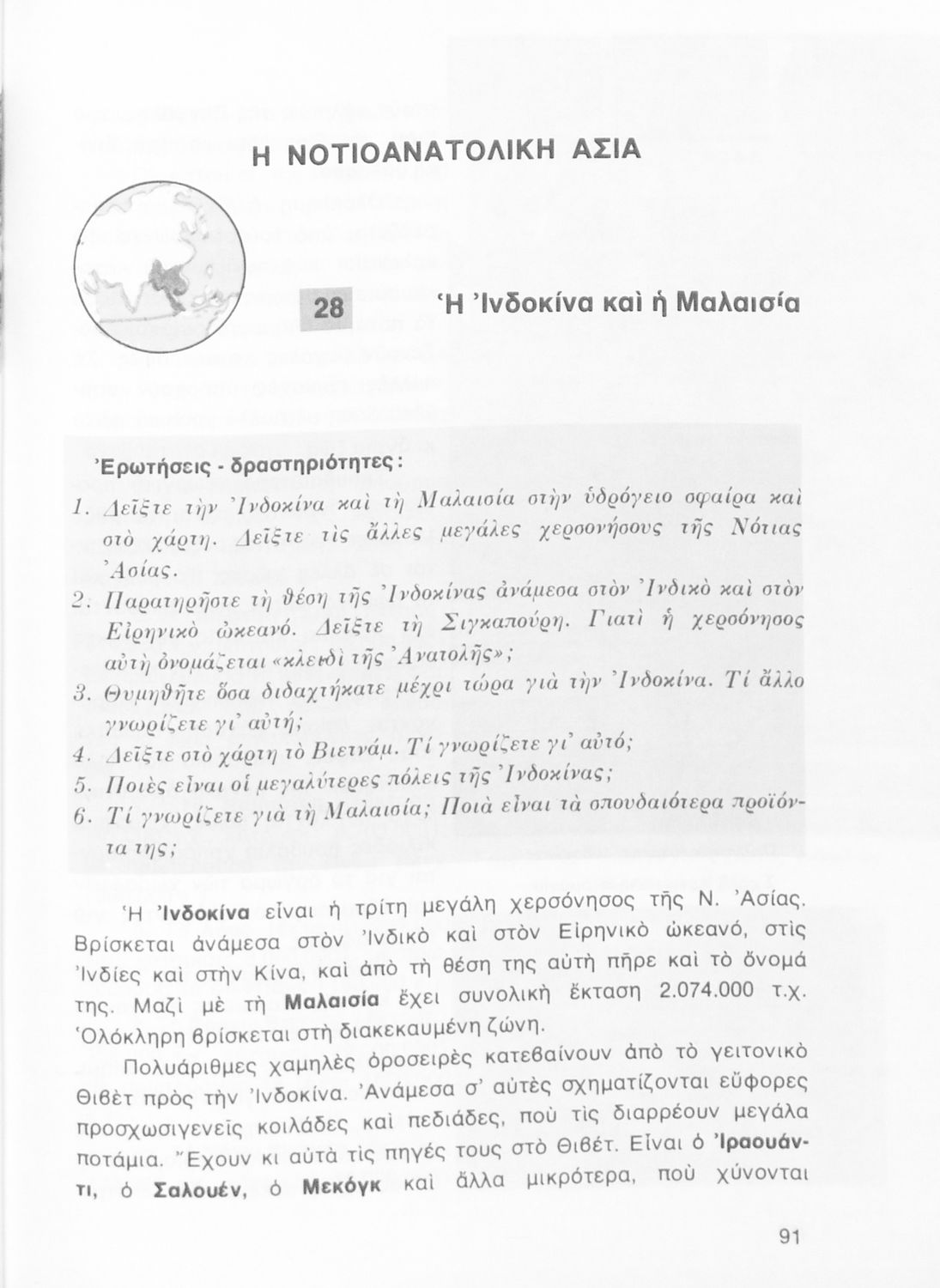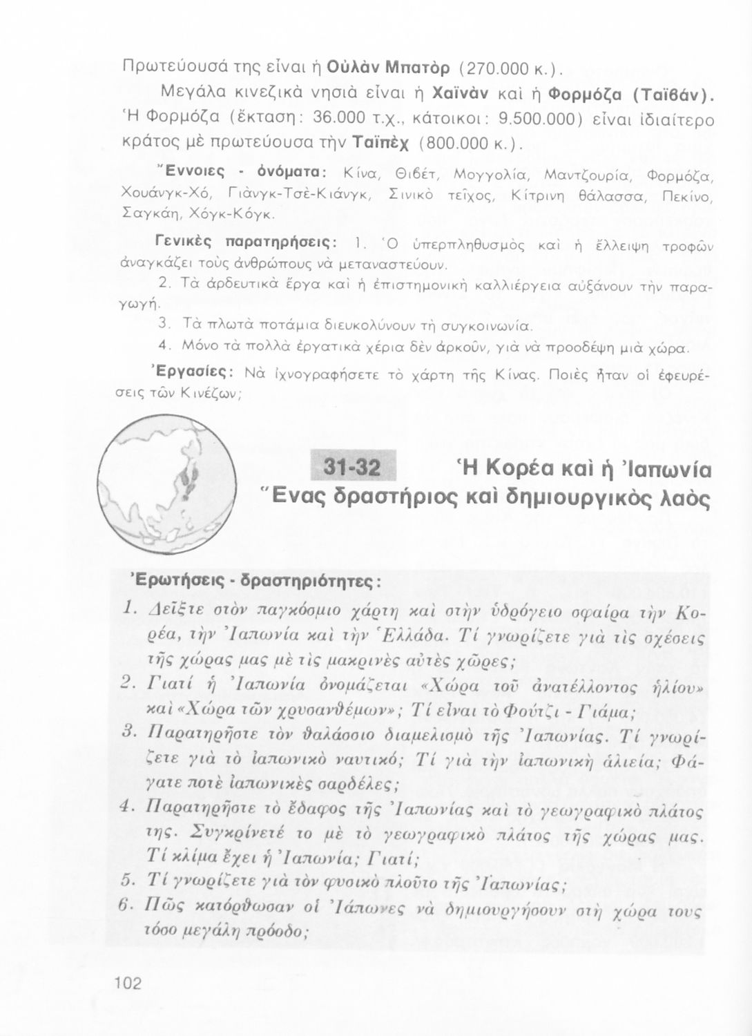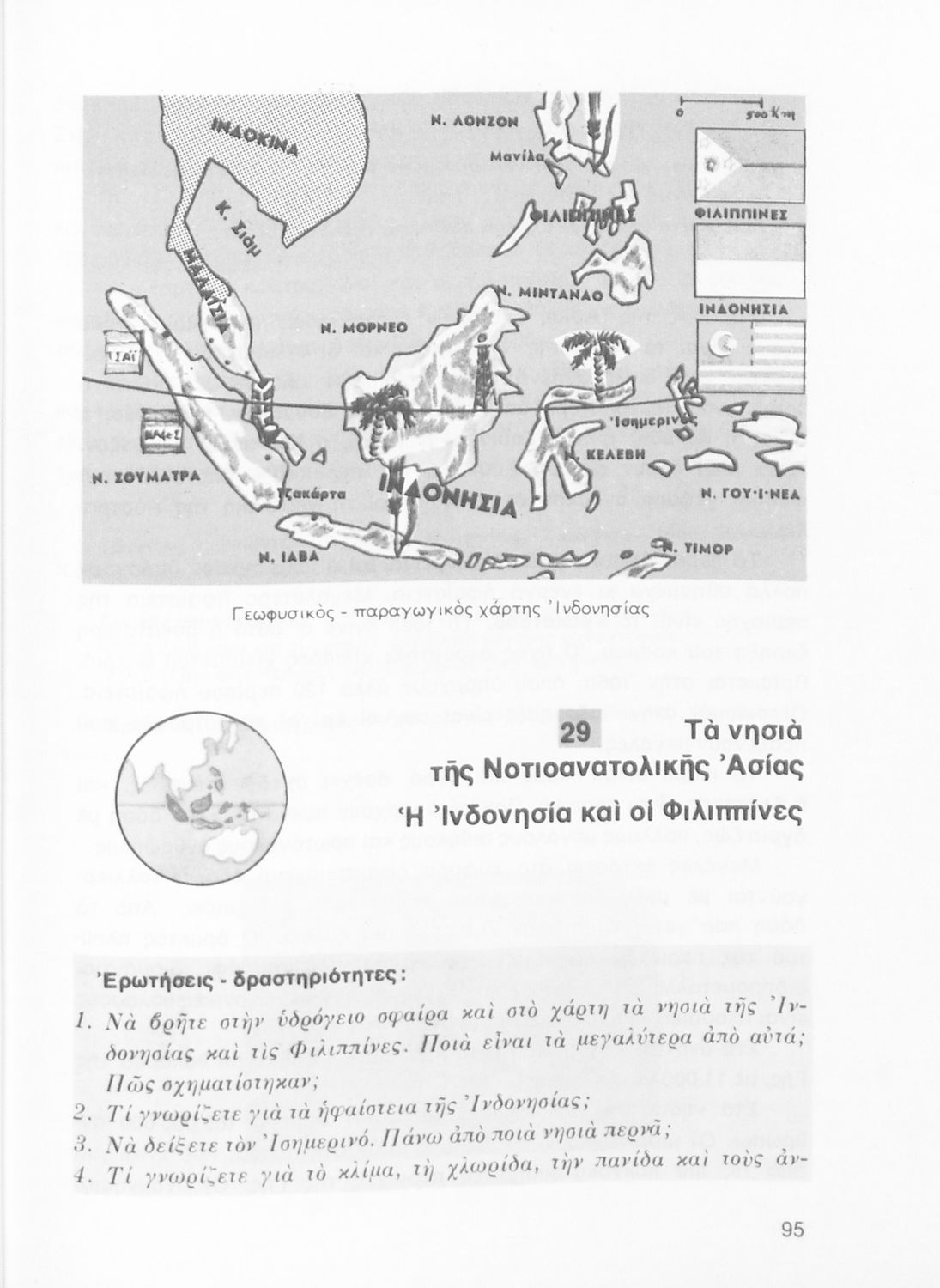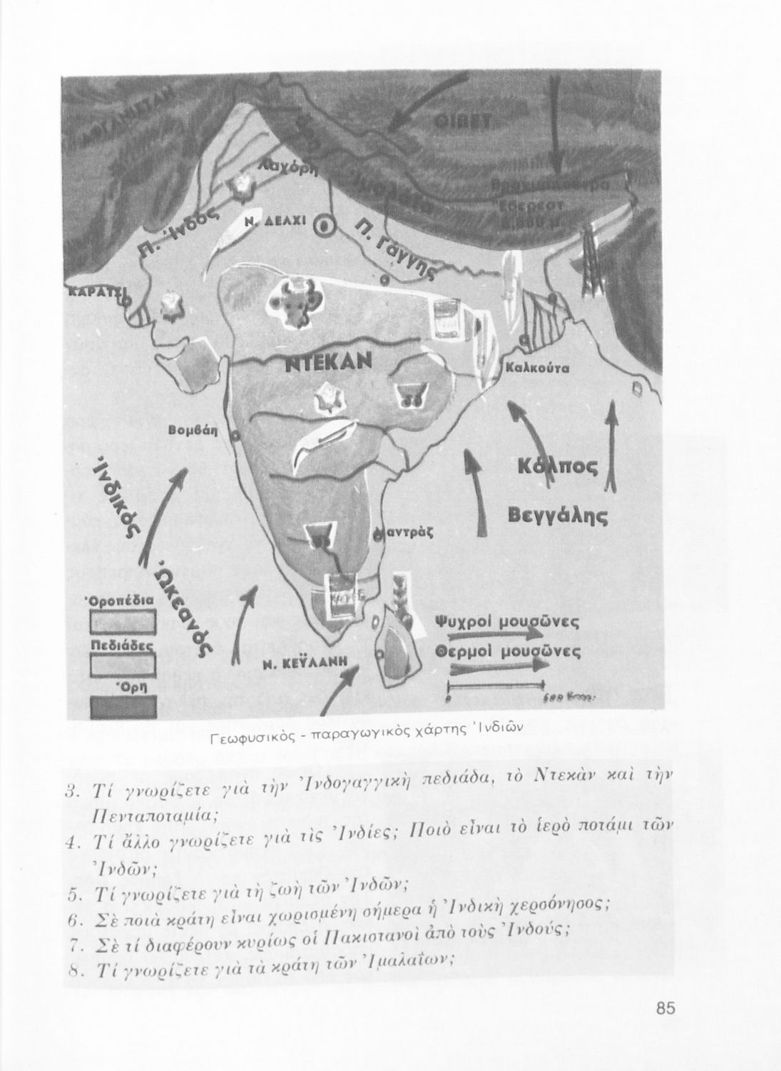 Σχολικό εγχειρίδιο Γεωγραφίας Ε΄ Δημοτικού που περιλαμβάνει εισαγωγή στη φυσική γεωγραφία εξετάζει την Ελλάδα και ενδεικτικές χώρες και περιοχές από τις πέντε ηπείρους, εκτός της Ευρώπης, από γεωφυσική και πολιτική άποψη.