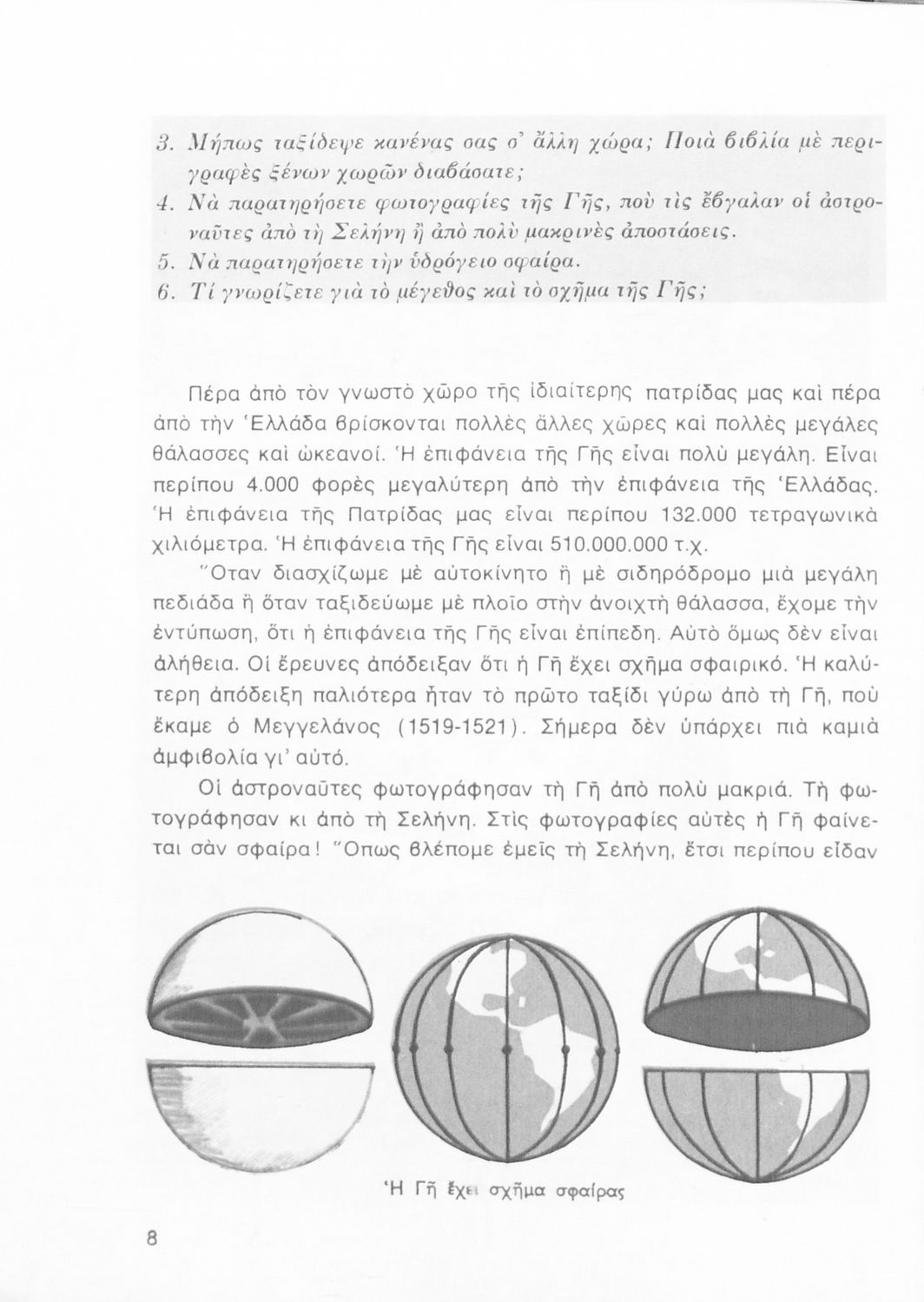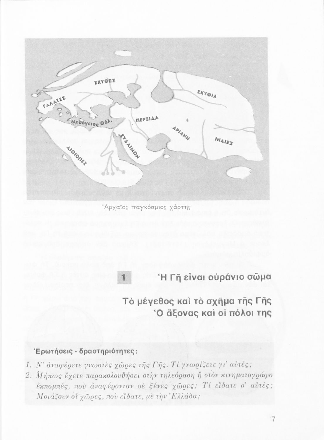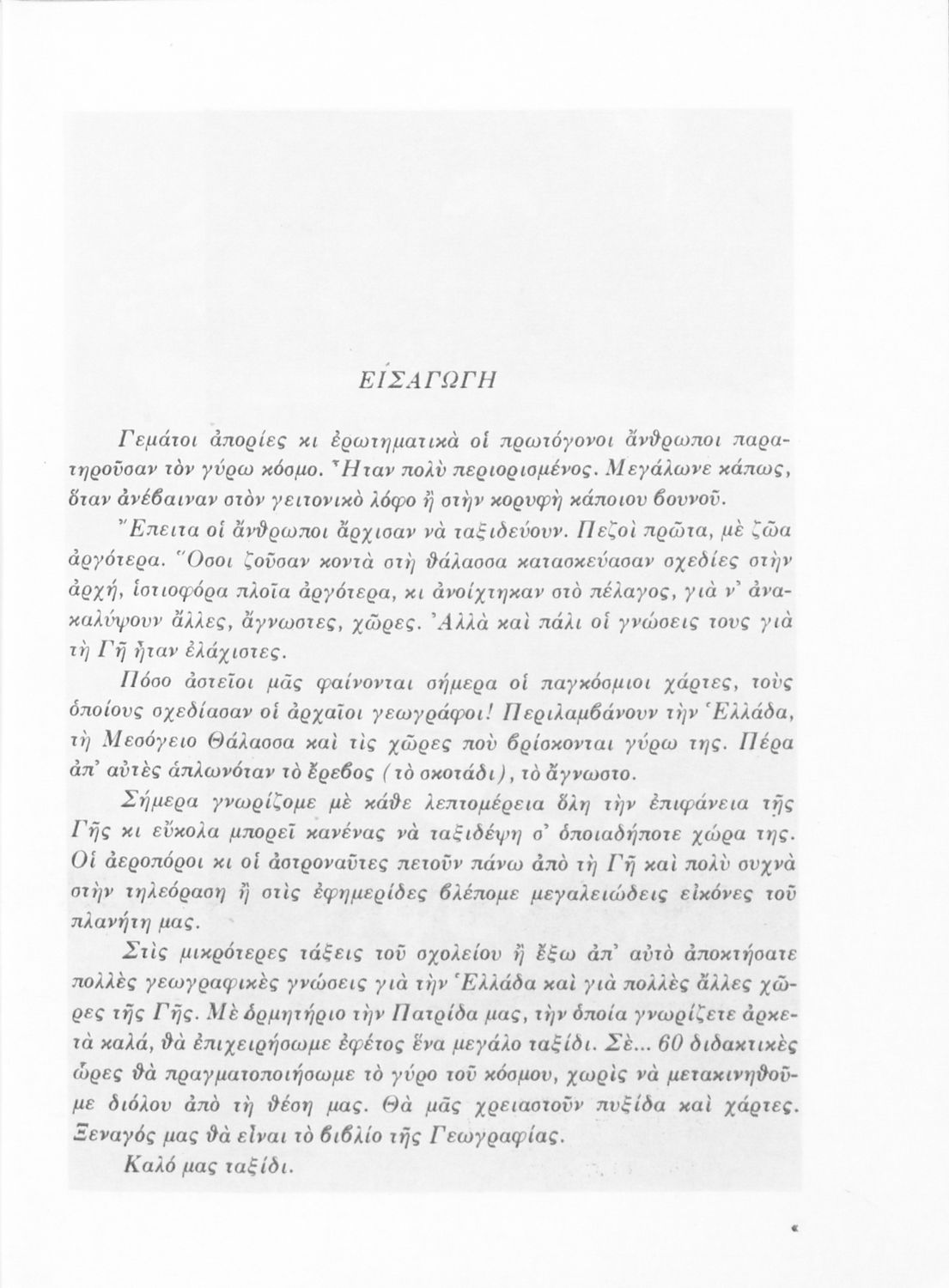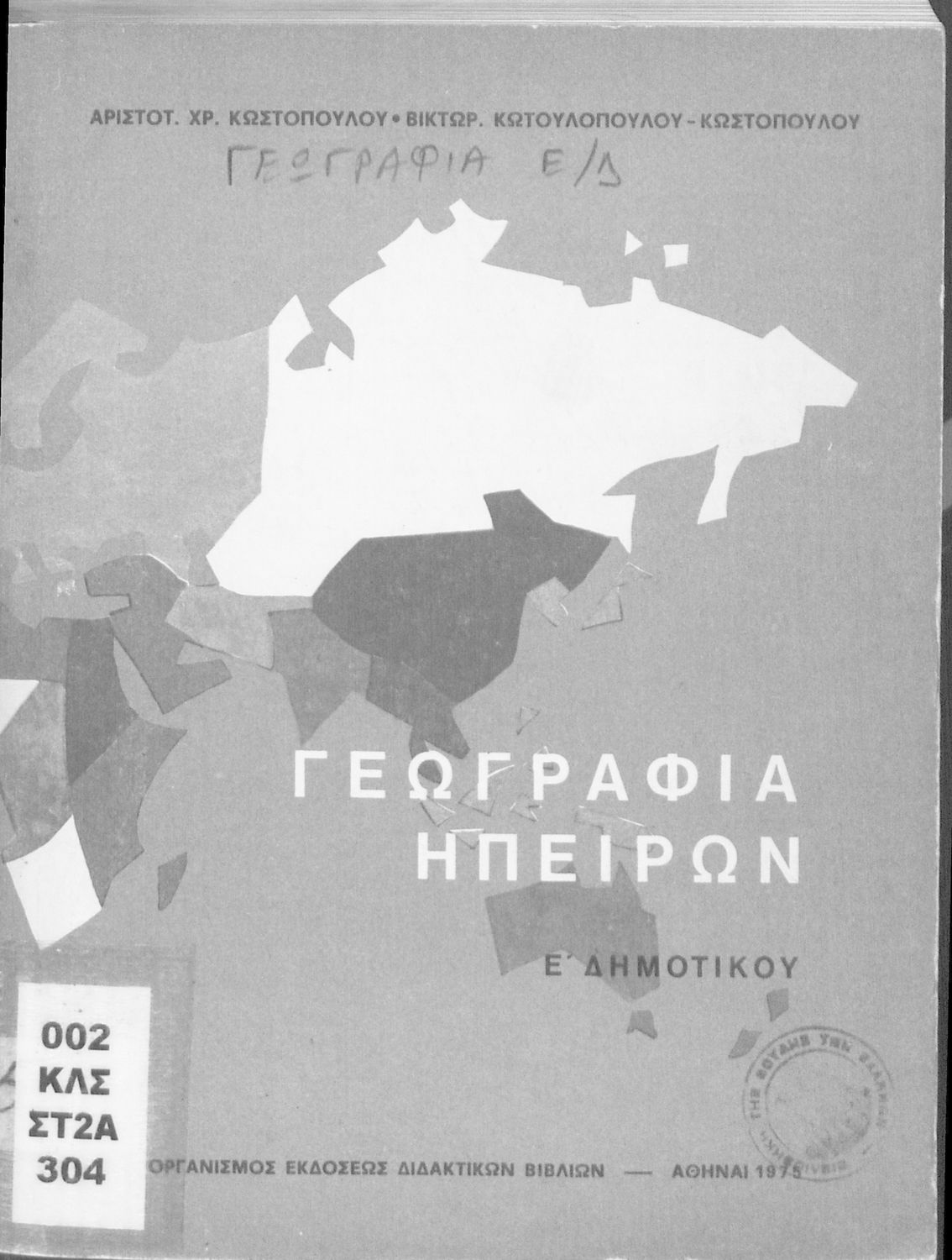 Σχολικό εγχειρίδιο Γεωγραφίας Ε΄ Δημοτικού που περιλαμβάνει εισαγωγή στη φυσική γεωγραφία εξετάζει την Ελλάδα και ενδεικτικές χώρες και περιοχές από τις πέντε ηπείρους, εκτός της Ευρώπης, από γεωφυσική και πολιτική άποψη.