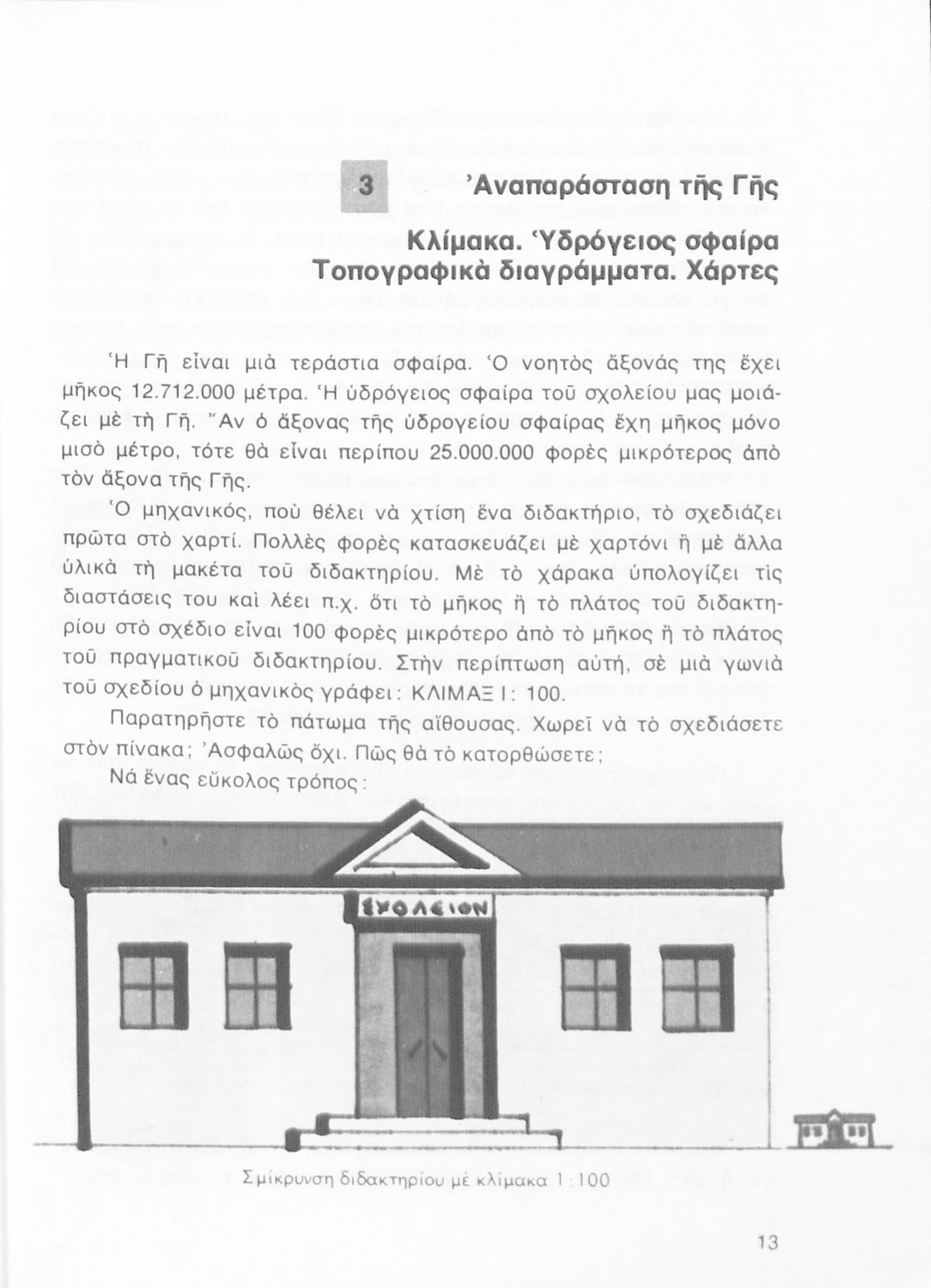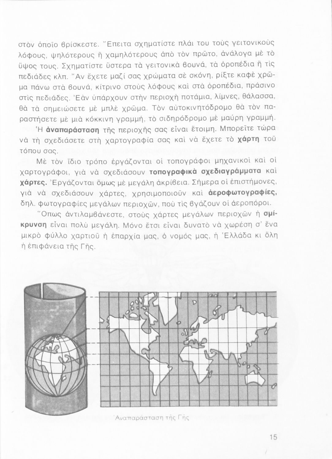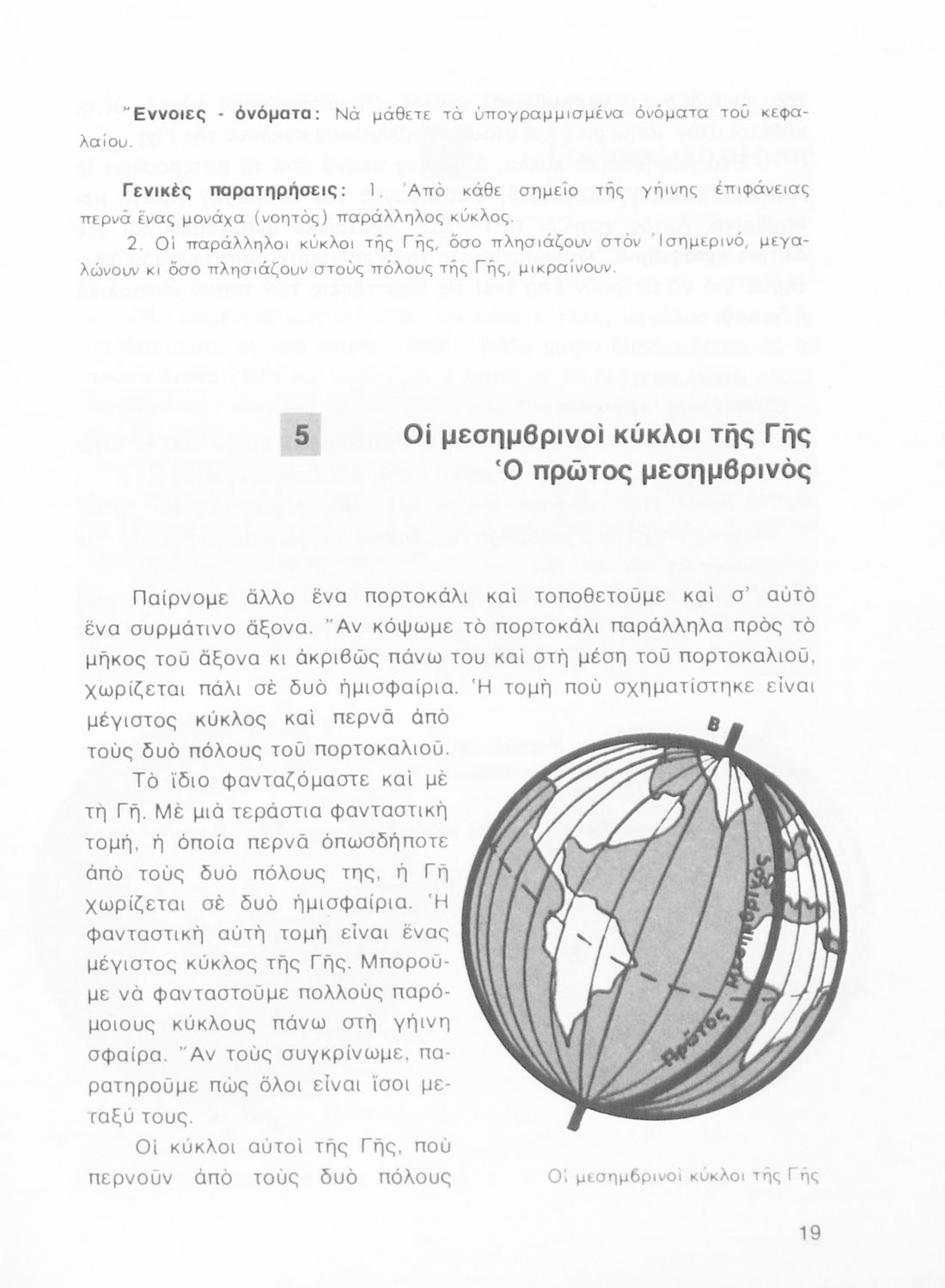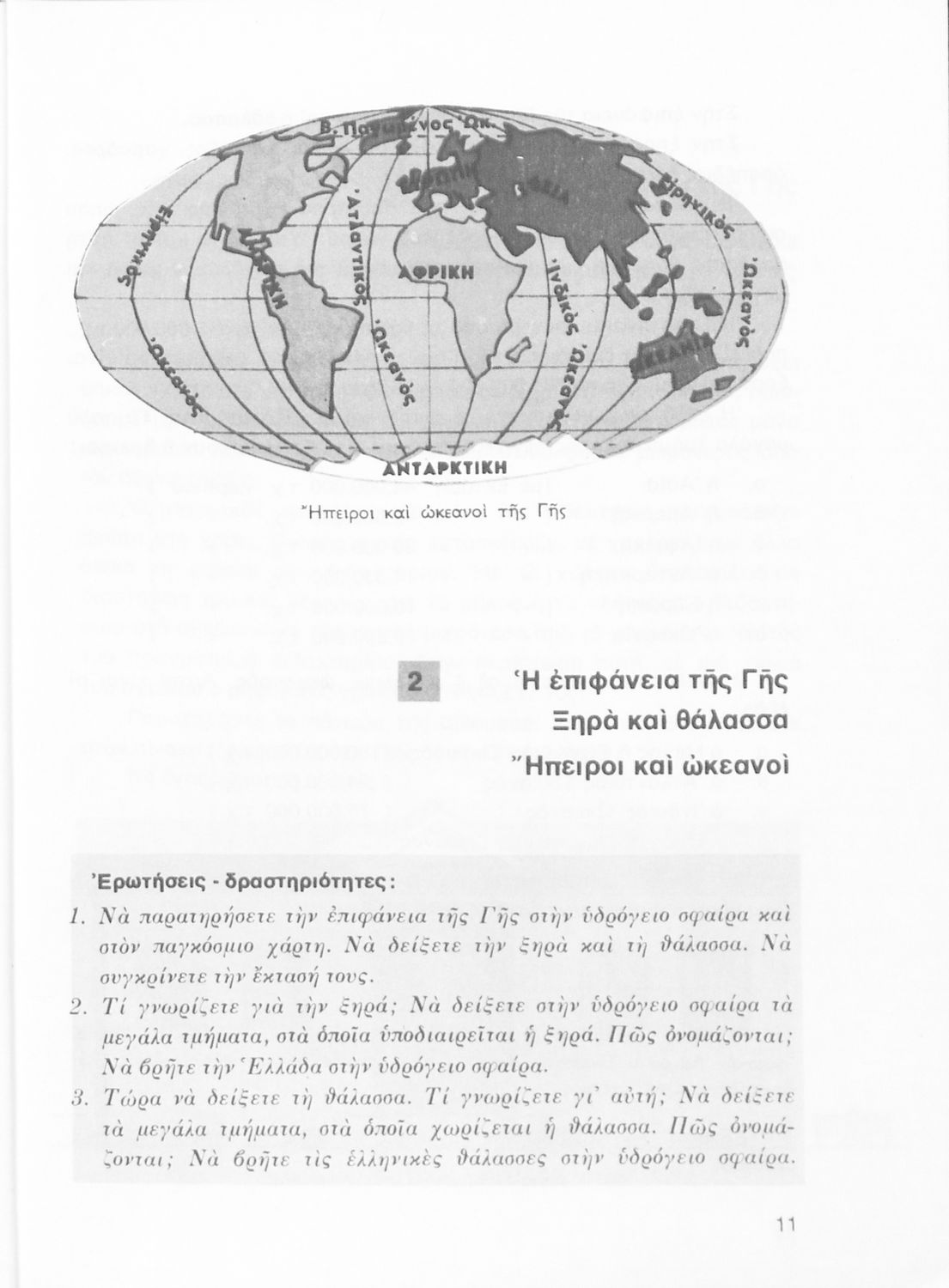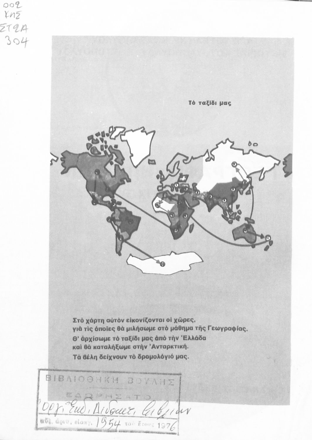 Σχολικό εγχειρίδιο Γεωγραφίας Ε΄ Δημοτικού που περιλαμβάνει εισαγωγή στη φυσική γεωγραφία εξετάζει την Ελλάδα και ενδεικτικές χώρες και περιοχές από τις πέντε ηπείρους, εκτός της Ευρώπης, από γεωφυσική και πολιτική άποψη.
