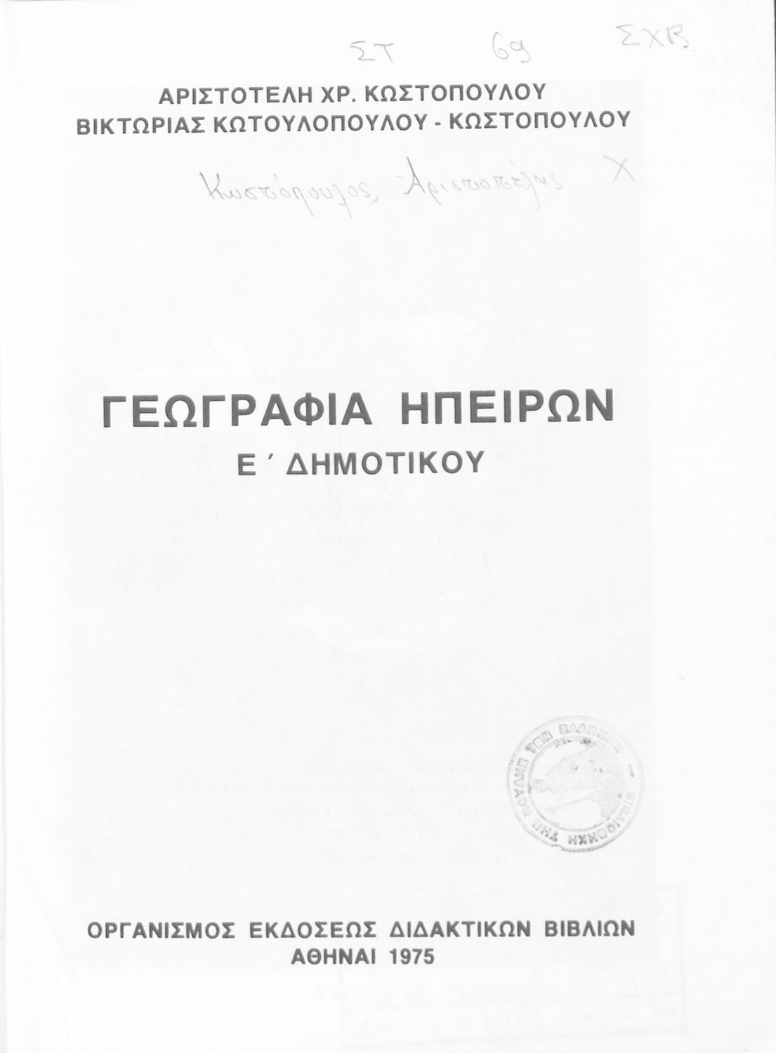 Βαθμίδα εκπαίδευσης: Πρωτοβάθμια Τάξη: Ε' Δημοτικού Μάθημα: Γεωγραφία Γλώσσα: Δημοτική Παρουσίαση περιεχομένου: Σχολικό εγχειρίδιο Γεωγραφίας Ε΄ Δημοτικού που περιλαμβάνει εισαγωγή στη φυσική γεωγραφία εξετάζει την Ελλάδα και ενδεικτικές χώρες και περιοχές από τις πέντε ηπείρους, εκτός της Ευρώπης, από γεωφυσική και πολιτική άποψη. |