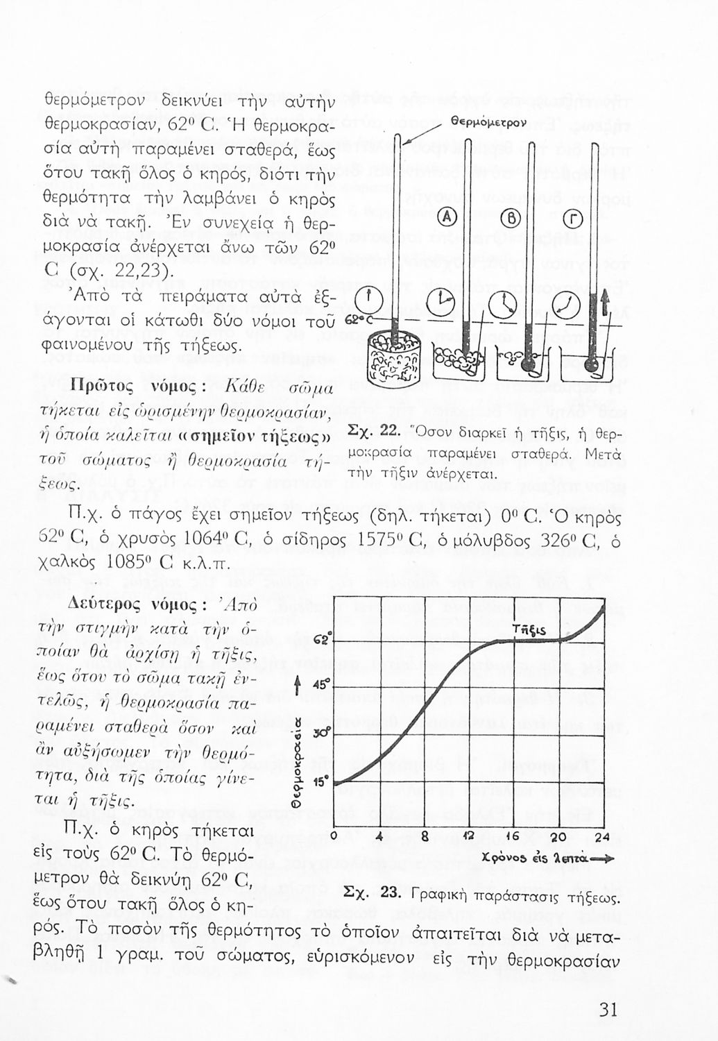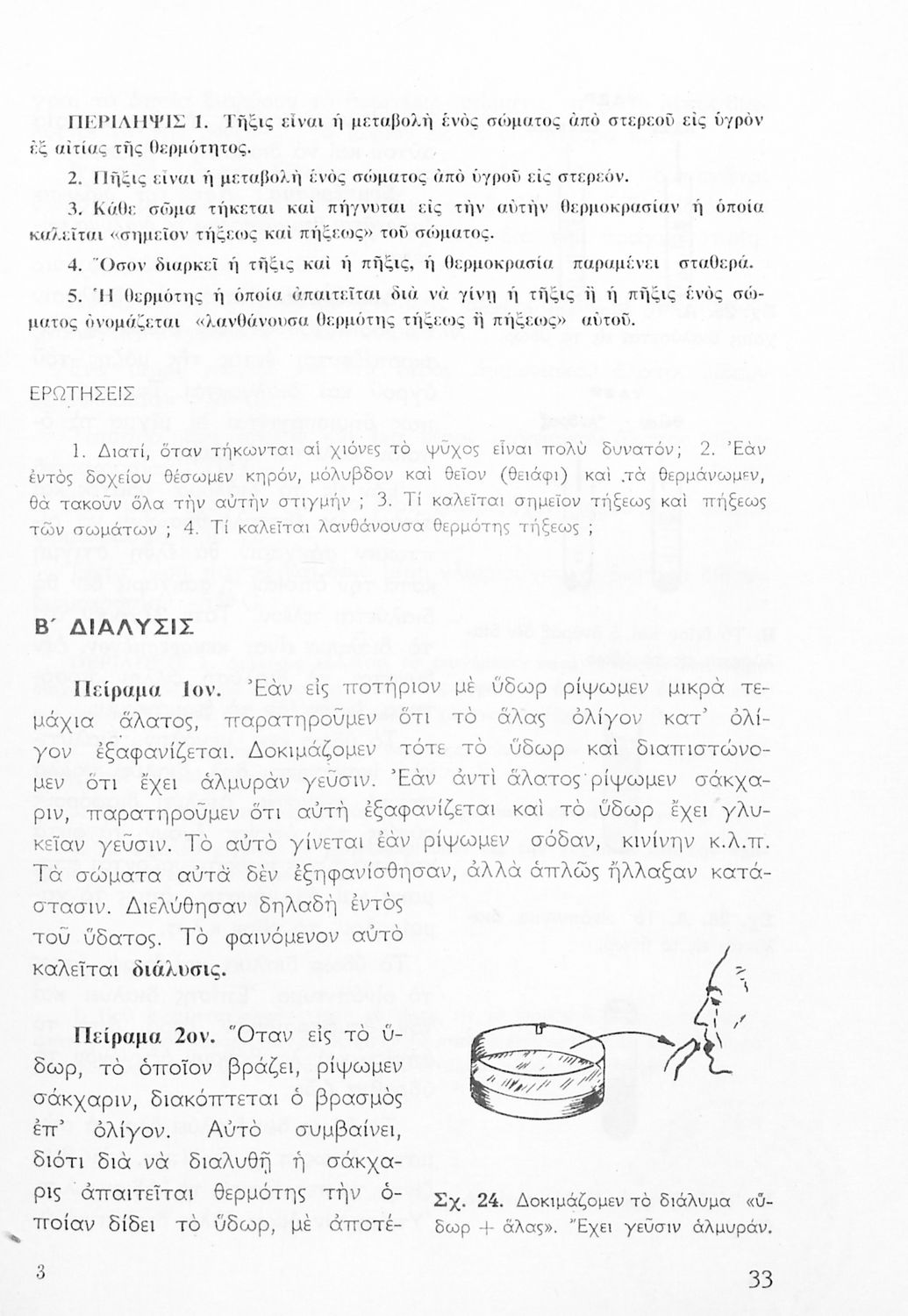 Σχολικό εγχειρίδιο Φυσικής και Χημείας της Ε' Δημοτικού. Το βιβλίο ξεκινά με μια γενική επισκόπηση στις ιδιότητες της ύλης όπως τα μόρια και τα άτομα. Στη συνέχεια χωρίζεται σε κεφάλαια που αναλύουν θεματικές όπως η θερμότητα, η μηχανική, η υδροστατική και η αεροστατική. Στα κεφάλαια αυτά αναλύονται ο ρόλος της θερμότητας και η επίδραση που έχει στη δομή των σωμάτων, η βαρύτητα και τα στοιχεία ισορροπίας καθώς και ζητήματα ατμοσφαιρικής πίεσης. Στην ενότητα της χημείας γίνεται παρουσίαση των χημικών στοιχείων και των χημικών ενώσεων και γίνεται αναφορά στην ατομική θεωρία.