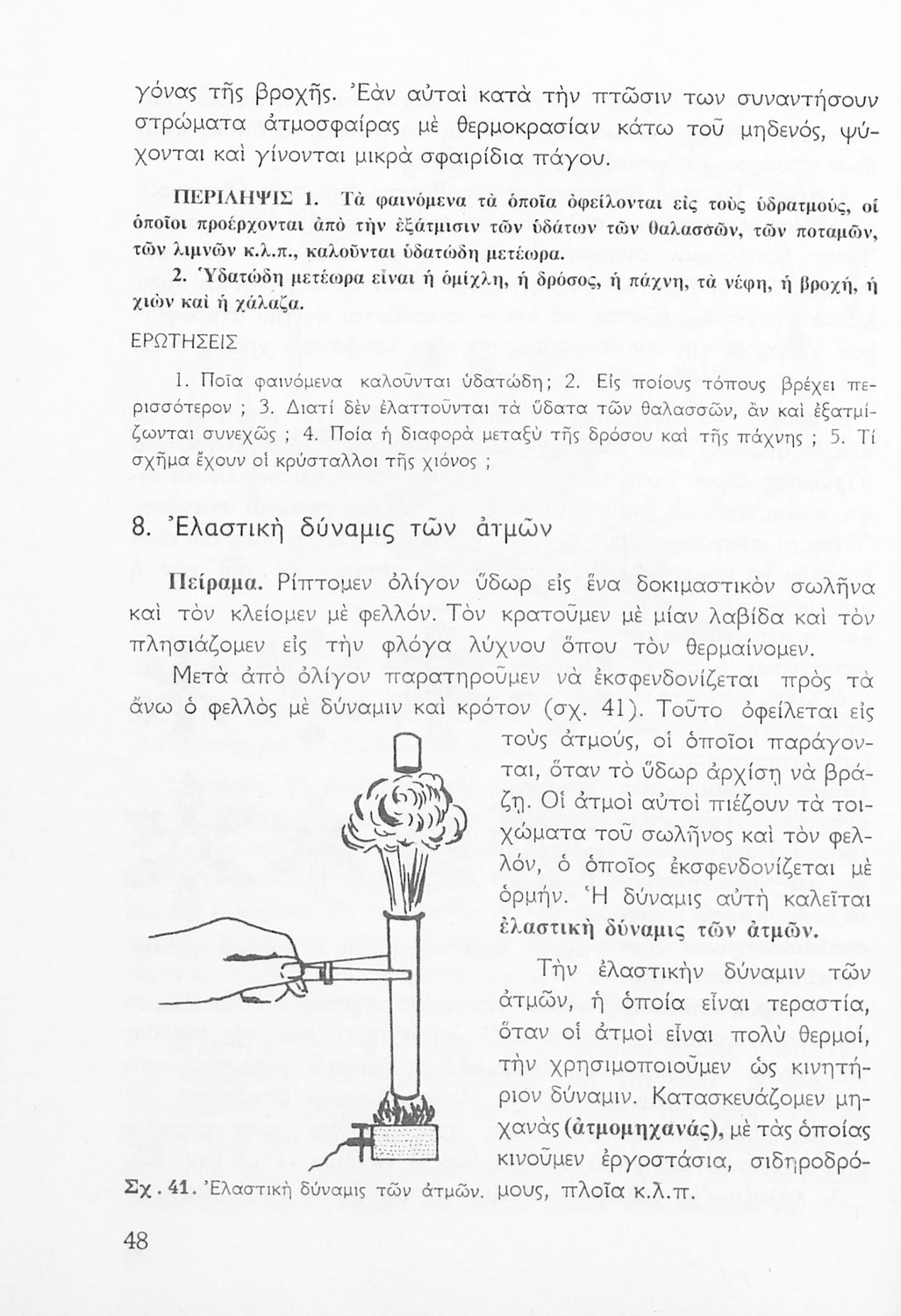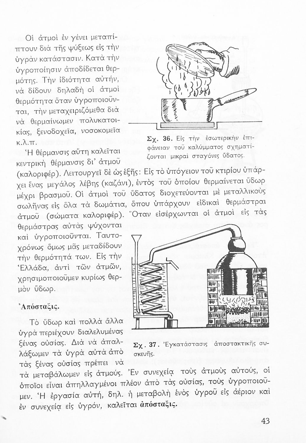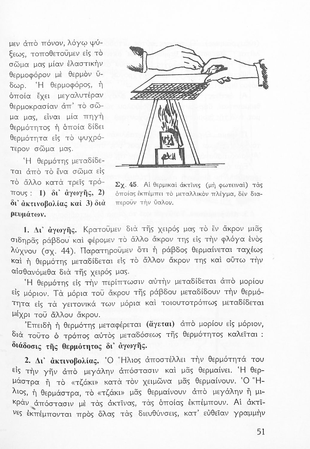 Σχολικό εγχειρίδιο Φυσικής και Χημείας της Ε' Δημοτικού. Το βιβλίο ξεκινά με μια γενική επισκόπηση στις ιδιότητες της ύλης όπως τα μόρια και τα άτομα. Στη συνέχεια χωρίζεται σε κεφάλαια που αναλύουν θεματικές όπως η θερμότητα, η μηχανική, η υδροστατική και η αεροστατική. Στα κεφάλαια αυτά αναλύονται ο ρόλος της θερμότητας και η επίδραση που έχει στη δομή των σωμάτων, η βαρύτητα και τα στοιχεία ισορροπίας καθώς και ζητήματα ατμοσφαιρικής πίεσης. Στην ενότητα της χημείας γίνεται παρουσίαση των χημικών στοιχείων και των χημικών ενώσεων και γίνεται αναφορά στην ατομική θεωρία.