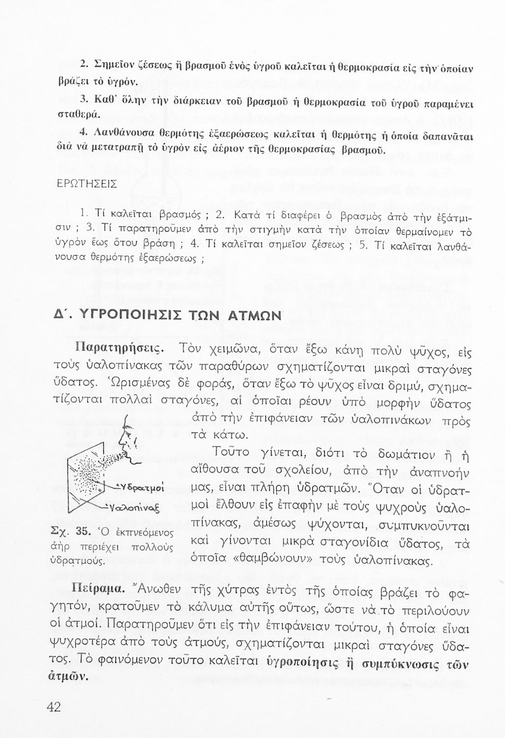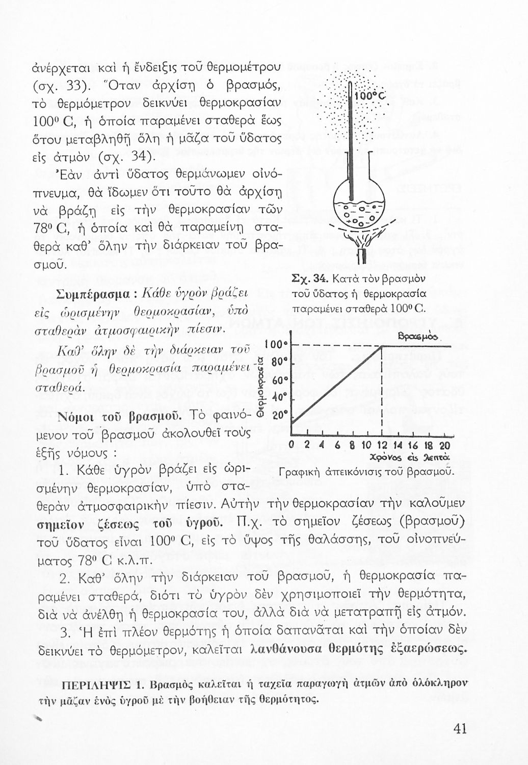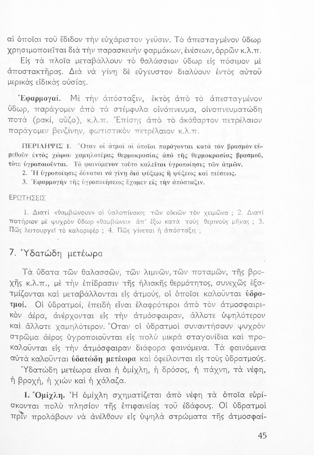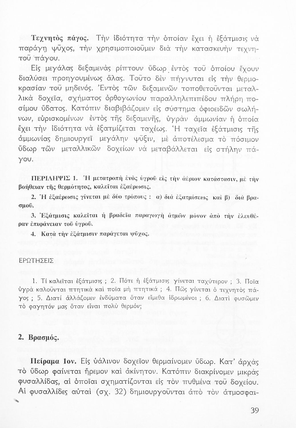 Σχολικό εγχειρίδιο Φυσικής και Χημείας της Ε' Δημοτικού. Το βιβλίο ξεκινά με μια γενική επισκόπηση στις ιδιότητες της ύλης όπως τα μόρια και τα άτομα. Στη συνέχεια χωρίζεται σε κεφάλαια που αναλύουν θεματικές όπως η θερμότητα, η μηχανική, η υδροστατική και η αεροστατική. Στα κεφάλαια αυτά αναλύονται ο ρόλος της θερμότητας και η επίδραση που έχει στη δομή των σωμάτων, η βαρύτητα και τα στοιχεία ισορροπίας καθώς και ζητήματα ατμοσφαιρικής πίεσης. Στην ενότητα της χημείας γίνεται παρουσίαση των χημικών στοιχείων και των χημικών ενώσεων και γίνεται αναφορά στην ατομική θεωρία.