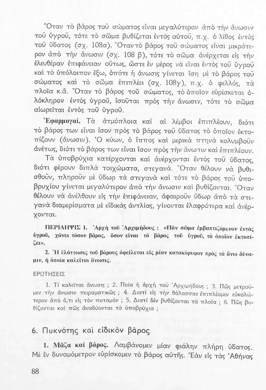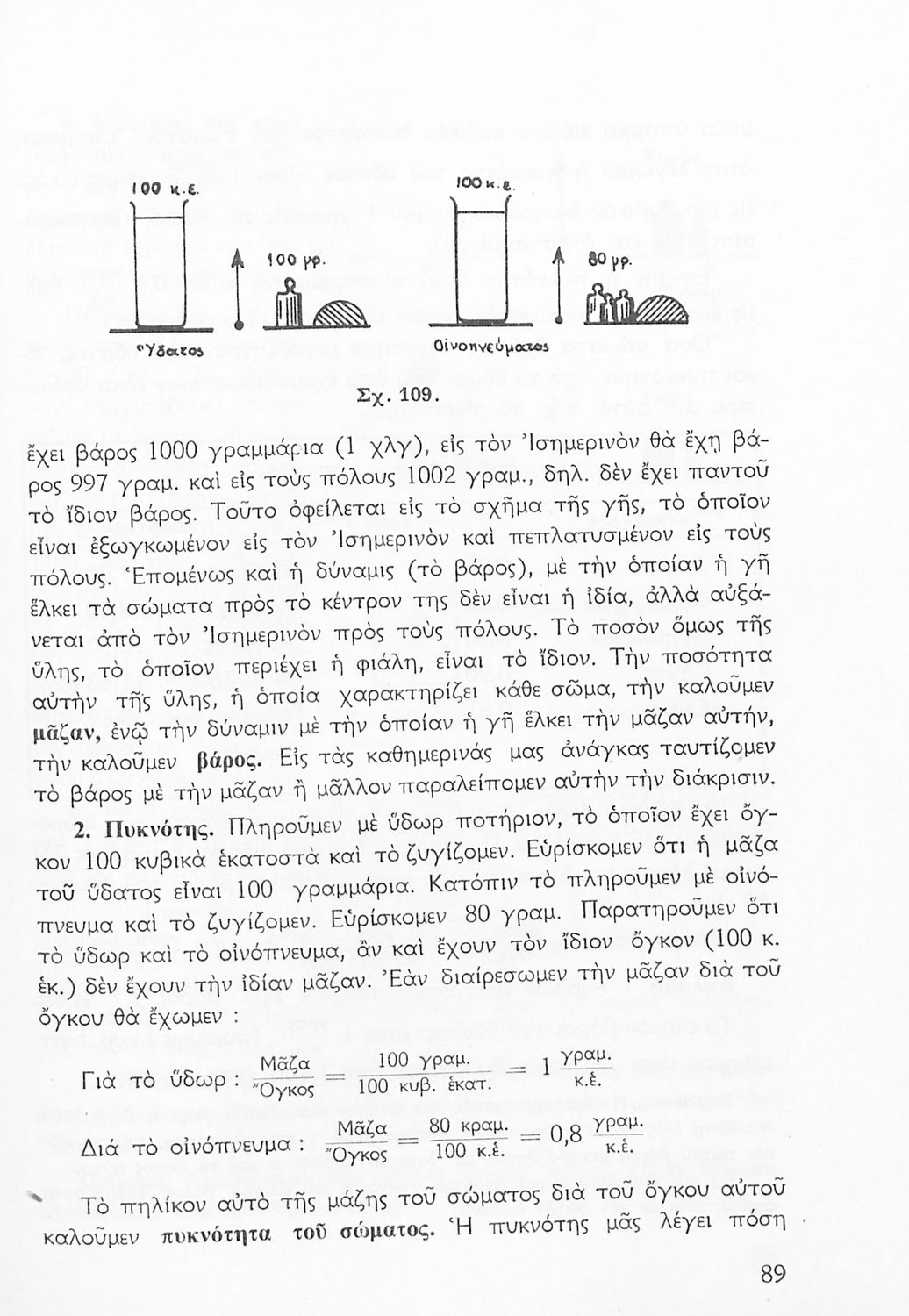 Σχολικό εγχειρίδιο Φυσικής και Χημείας της Ε' Δημοτικού. Το βιβλίο ξεκινά με μια γενική επισκόπηση στις ιδιότητες της ύλης όπως τα μόρια και τα άτομα. Στη συνέχεια χωρίζεται σε κεφάλαια που αναλύουν θεματικές όπως η θερμότητα, η μηχανική, η υδροστατική και η αεροστατική. Στα κεφάλαια αυτά αναλύονται ο ρόλος της θερμότητας και η επίδραση που έχει στη δομή των σωμάτων, η βαρύτητα και τα στοιχεία ισορροπίας καθώς και ζητήματα ατμοσφαιρικής πίεσης. Στην ενότητα της χημείας γίνεται παρουσίαση των χημικών στοιχείων και των χημικών ενώσεων και γίνεται αναφορά στην ατομική θεωρία.
