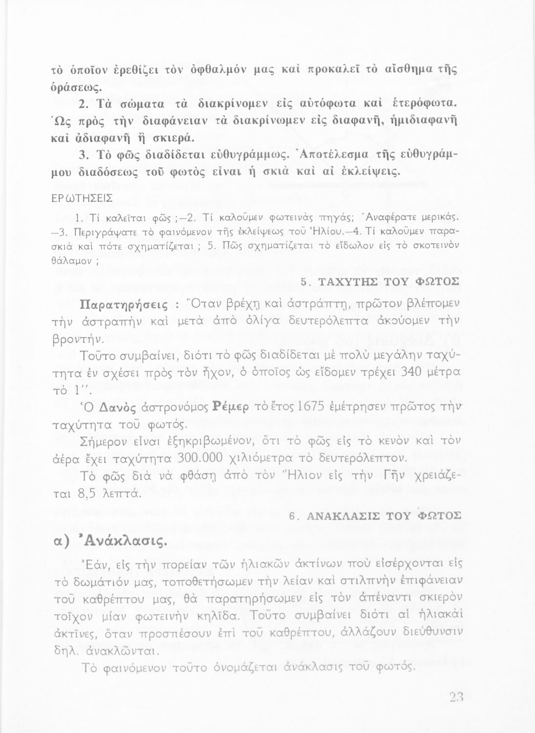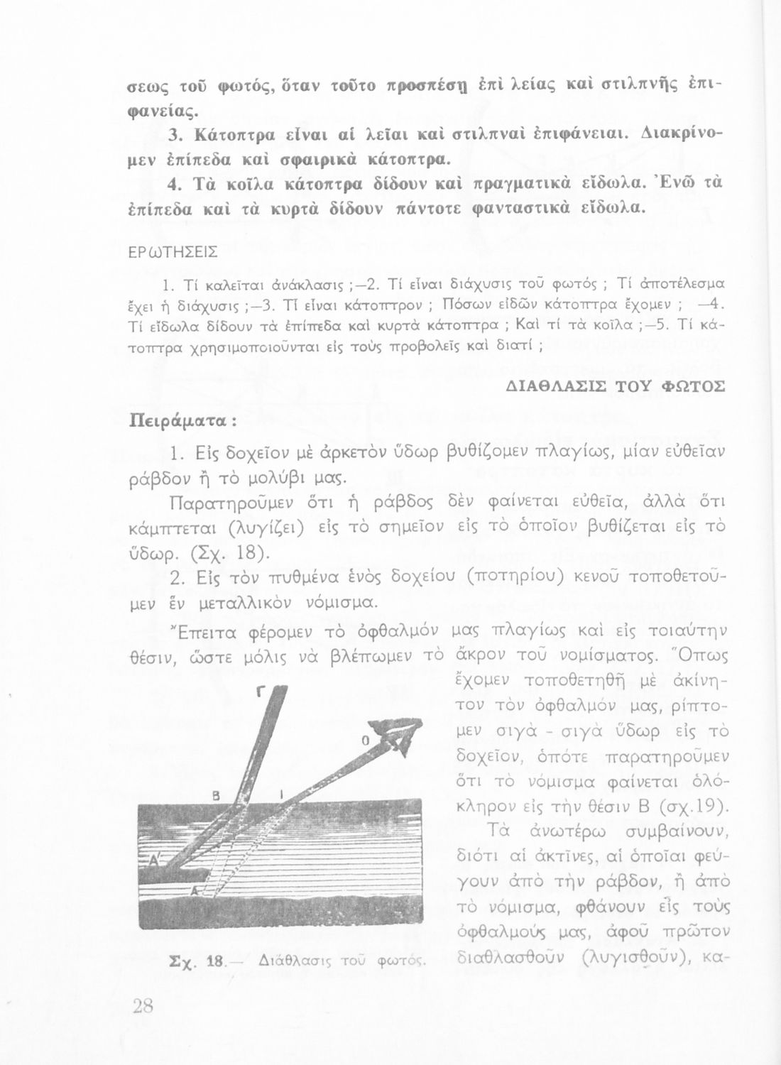 Σχολικό εγχειρίδιο Φυσικής Πειραματικής ΣΤ΄ Δημοτικού που εστιάζει στα φυσικά φαινόμενα (ακουστική, οπτική, μαγνητισμός και ηλεκτρισμός) και στα χημικά φαινόμενα (είδη του άνθρακα, παραγωγή πίσσας, ναφθαλίνης,