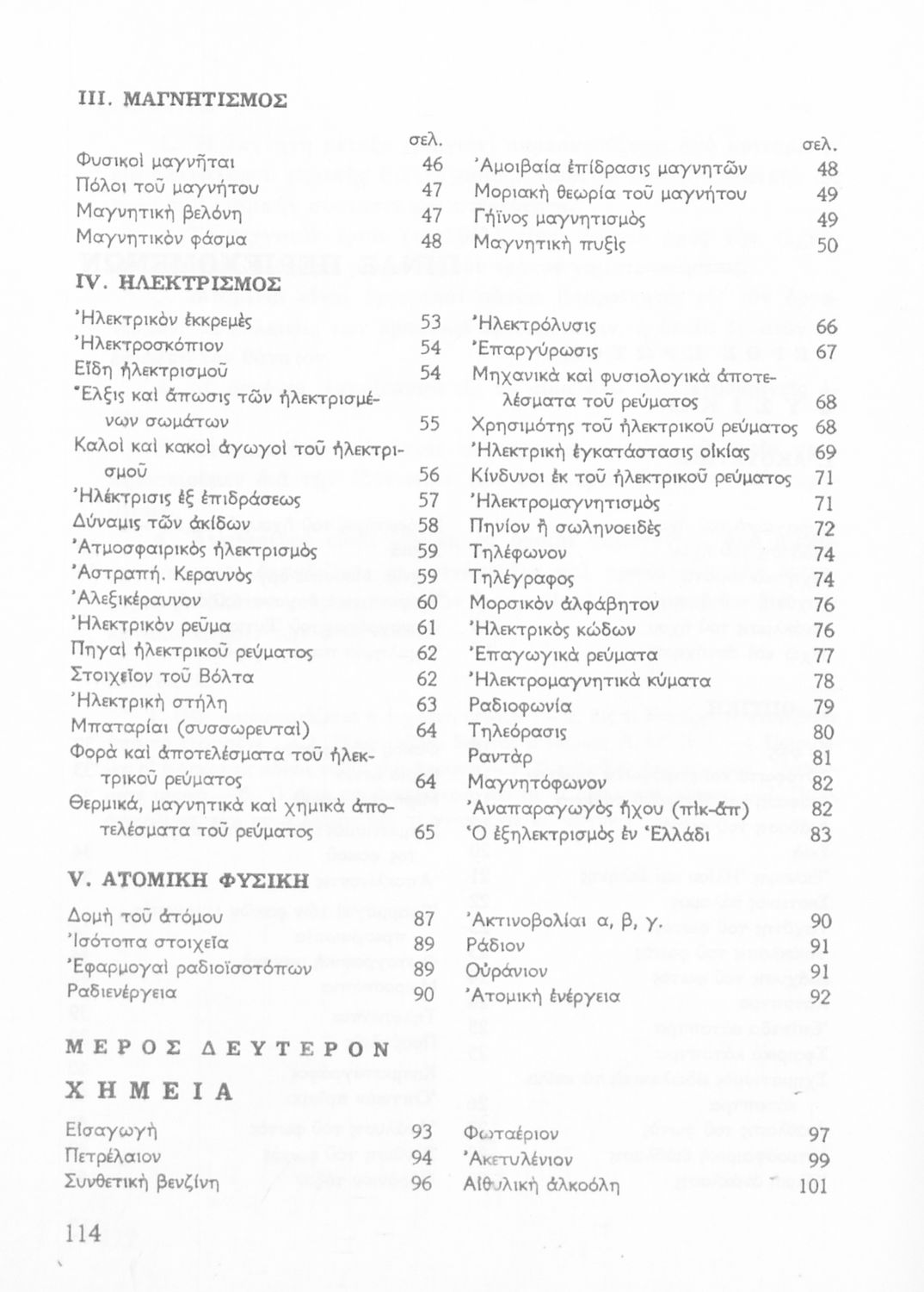 Βαθμίδα εκπαίδευσης: Πρωτοβάθμια Τάξη: ΣΤ' Δημοτικού Γλώσσα: Καθαρεύουσα Παρουσίαση περιεχομένου: Σχολικό εγχειρίδιο Φυσικής και Χημείας της ΣΤ΄ Δημοτικού. Περιέχει βασικές αρχές ακουστικής, οπτικής, ηλεκτρομαγνητισμού καθώς και της ατομικής και πυρηνικής ενέργειας. Τέλος, περιλαμβάνει βασικές έννοιες οργανικής και ανόργανης Χημείας. |