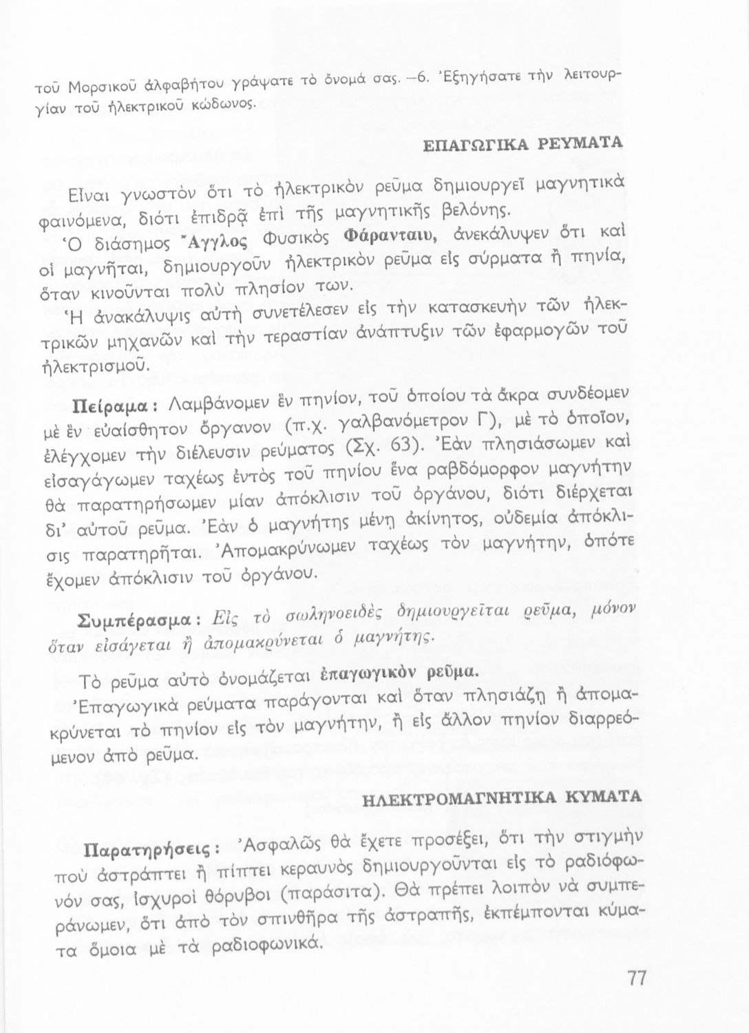 Σχολικό εγχειρίδιο Φυσικής και Χημείας της ΣΤ΄ Δημοτικού. Περιέχει βασικές αρχές ακουστικής, οπτικής, ηλεκτρομαγνητισμού καθώς και της ατομικής και πυρηνικής ενέργειας. Τέλος, περιλαμβάνει βασικές έννοιες οργανικής και ανόργανης Χημείας.