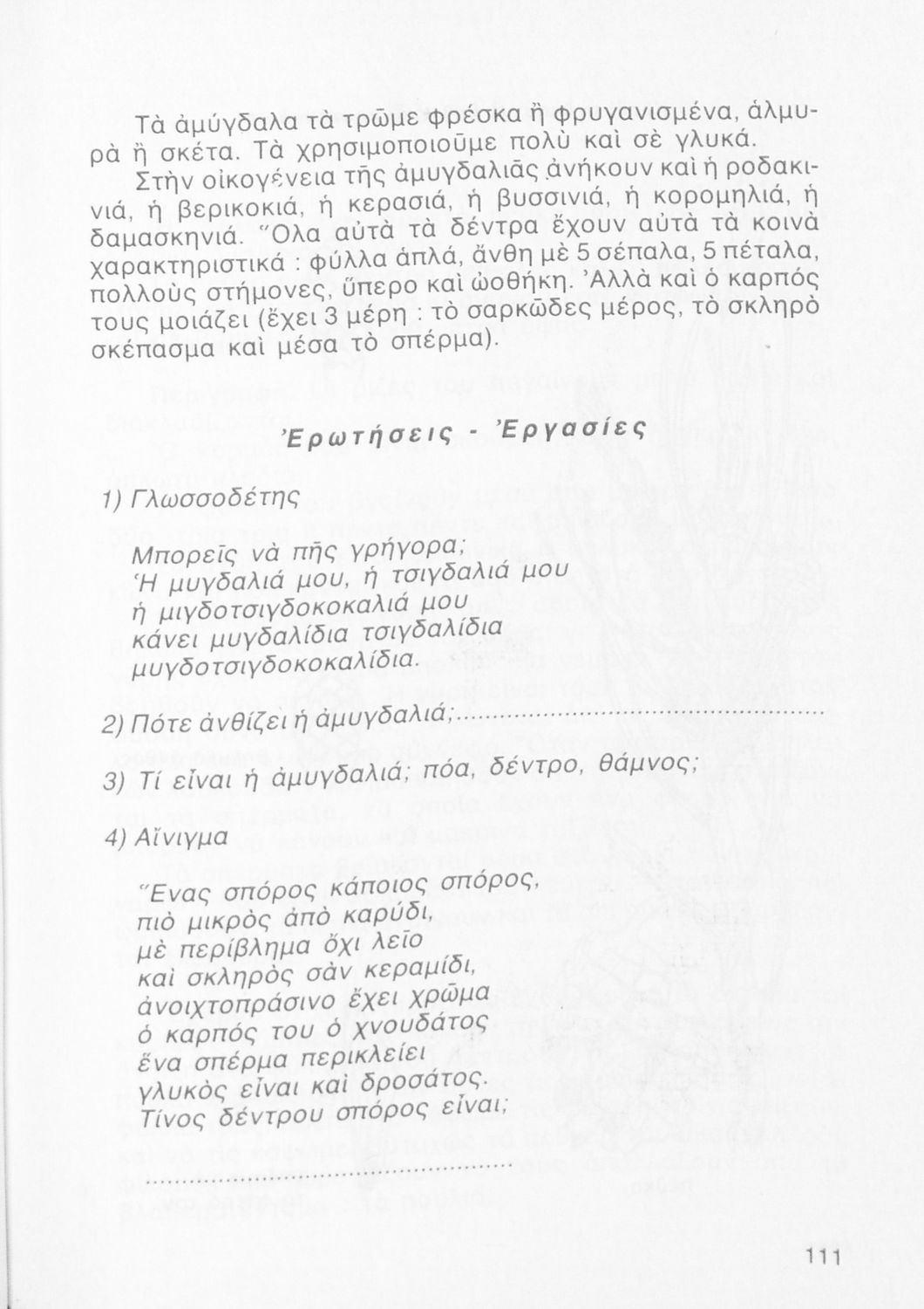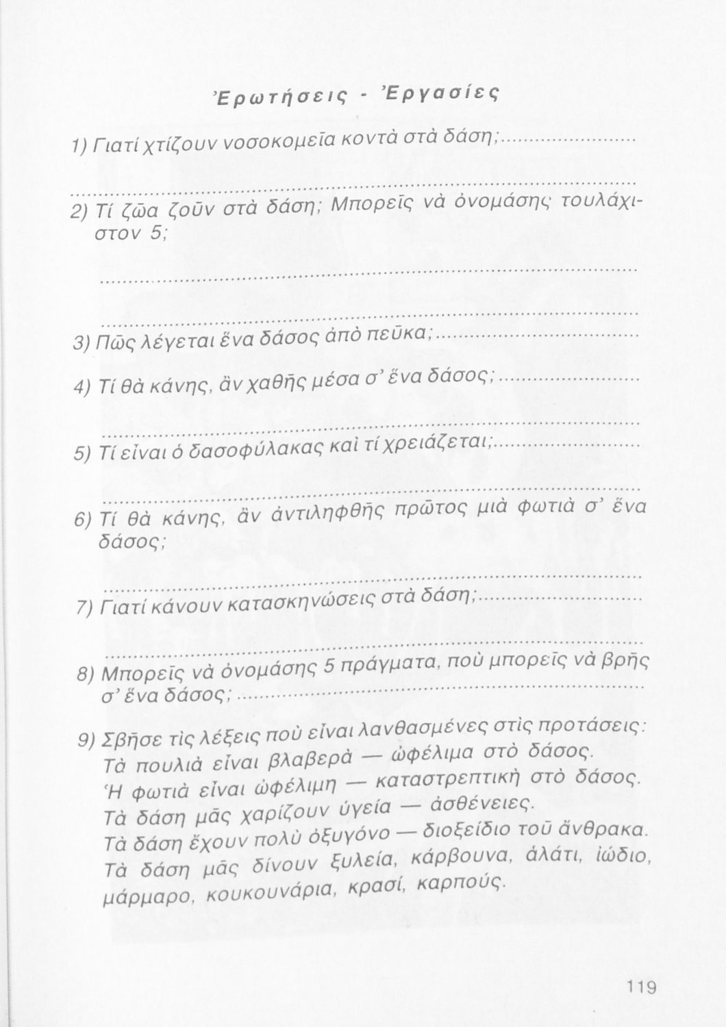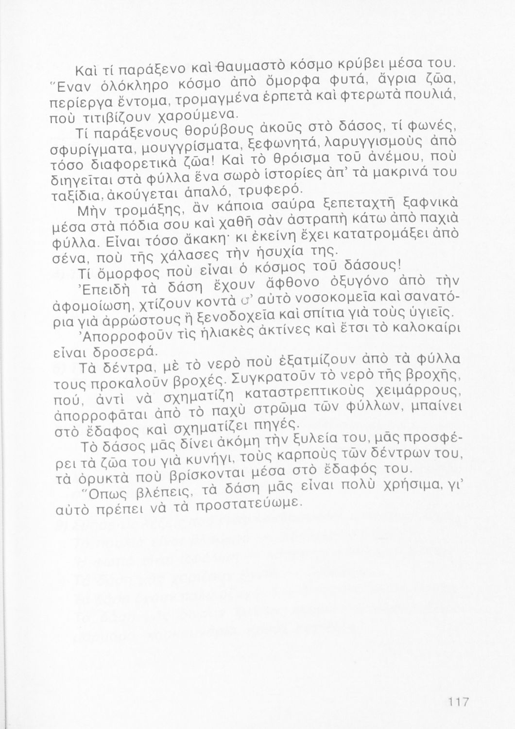 Σχολικό εγχειρίδιο της Γ ΄ Δημοτικού. Στο βιβλίο παρουσιάζονται τα διαφορετικά μέρη των φυτών και τις ιδιότητες του καθενός. Μέσα από παραδείγματα περιγράφεται ο τρόπος γονιμοποίησης και αποθήκευσης τροφής των φυτών καθώς και προφύλαξης τους από πιθανές απειλές. Το δεύτερο μέρος του βιβλίο αφορά τη ζωολογία και κάνει μια κατηγοριοποίηση των ζώων με βάση το φυσικό τους περιβάλλον, όπως ζώα της θάλασσας, του δάσους και ζώα του σπιτιού.