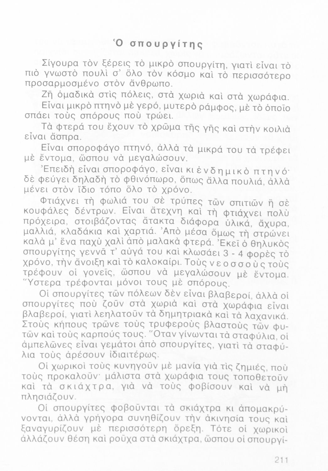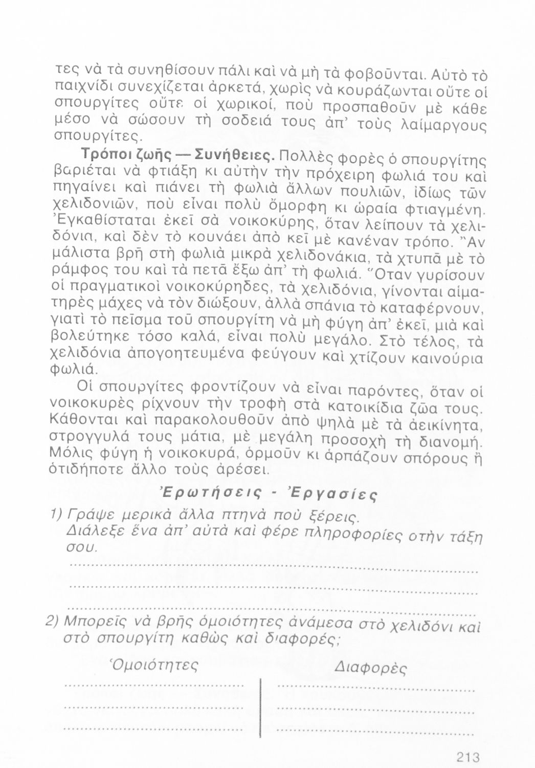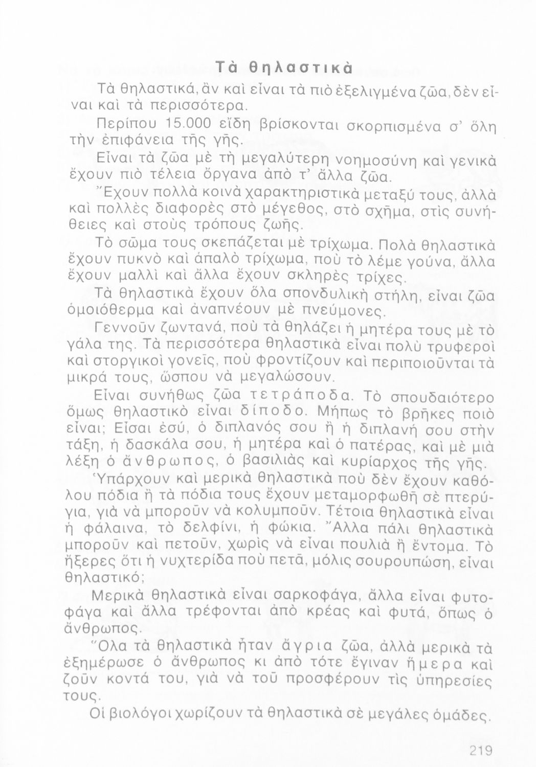 520 ## _aΣχολικό εγχειρίδιο της Γ ΄ Δημοτικού. Στο βιβλίο παρουσιάζονται τα διαφορετικά μέρη των φυτών και τις ιδιότητες του καθενός. Μέσα από παραδείγματα περιγράφεται ο τρόπος γονιμοποίησης και αποθήκευσης τροφής των φυτών καθώς και προφύλαξης τους από πιθανές απειλές. Το δεύτερο μέρος του βιβλίο αφορά τη ζωολογία και κάνει μια κατηγοριοποίηση των ζώων με βάση το φυσικό τους περιβάλλον, όπως ζώα της θάλασσας, του δάσους και ζώα του σπιτιού.