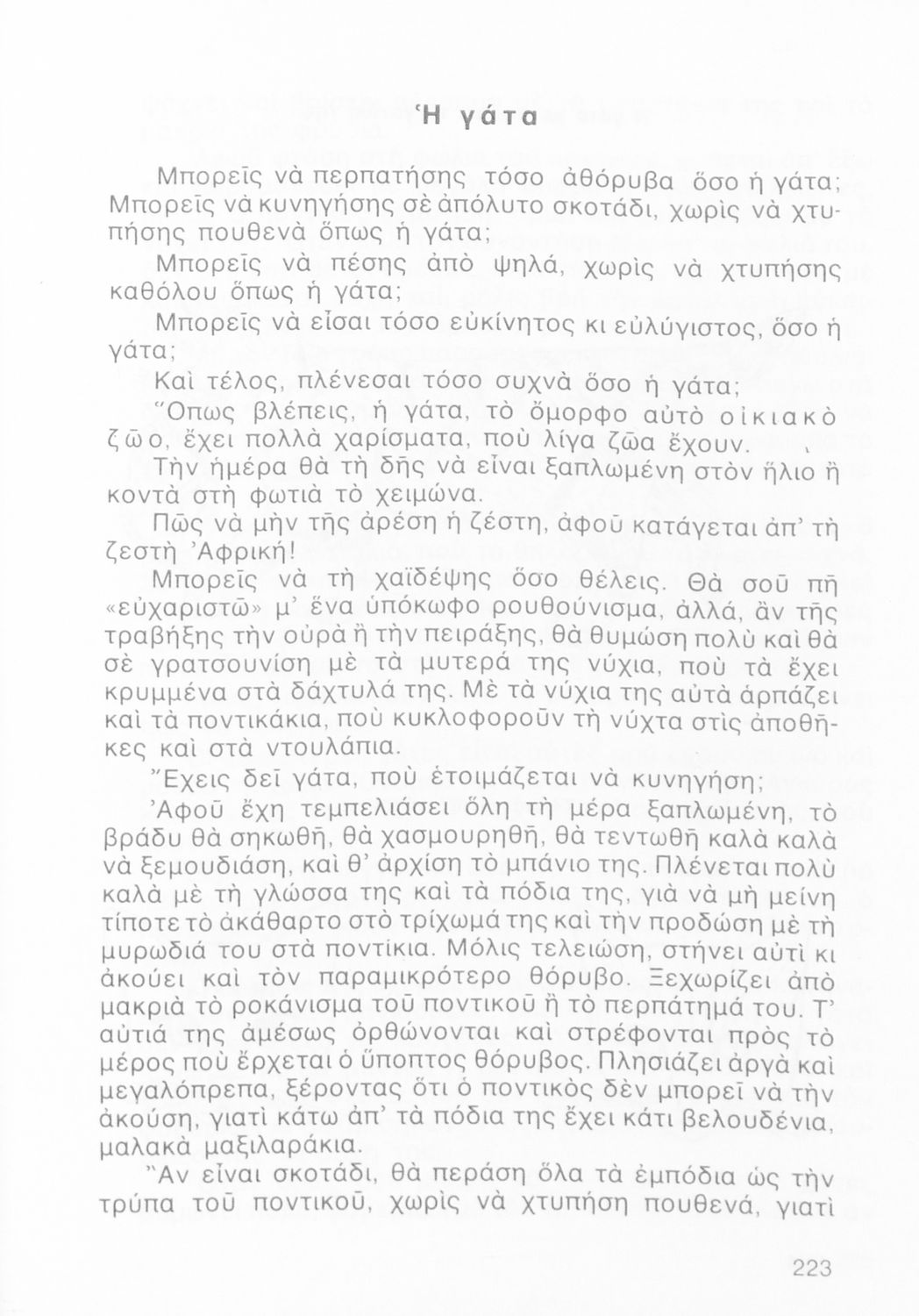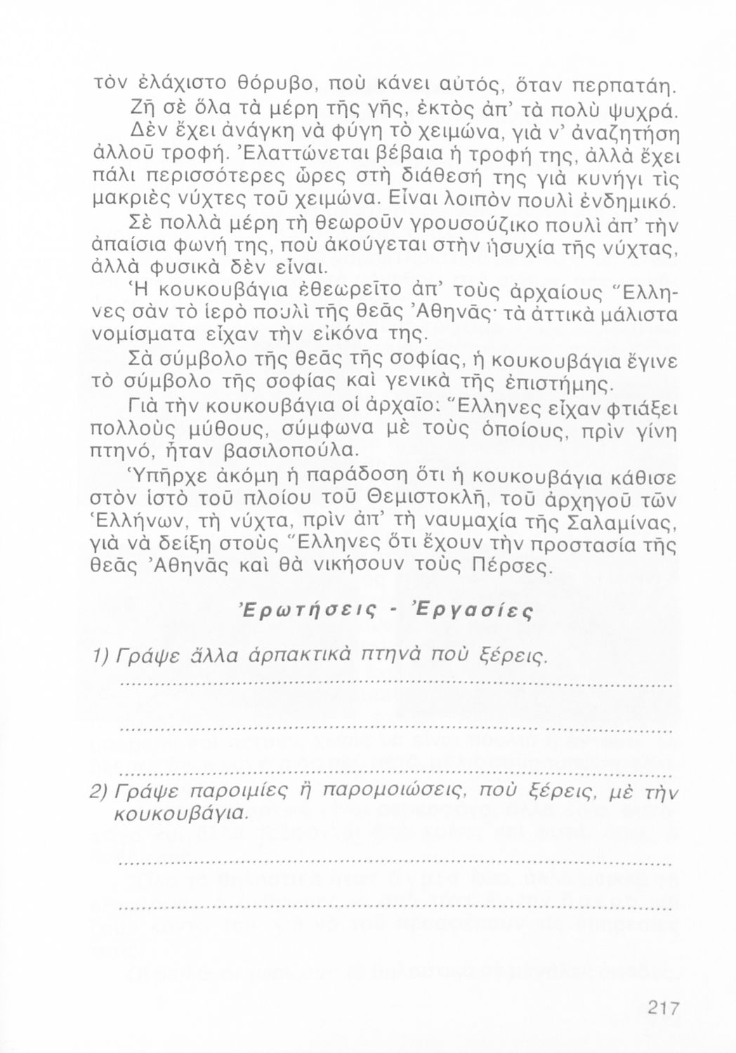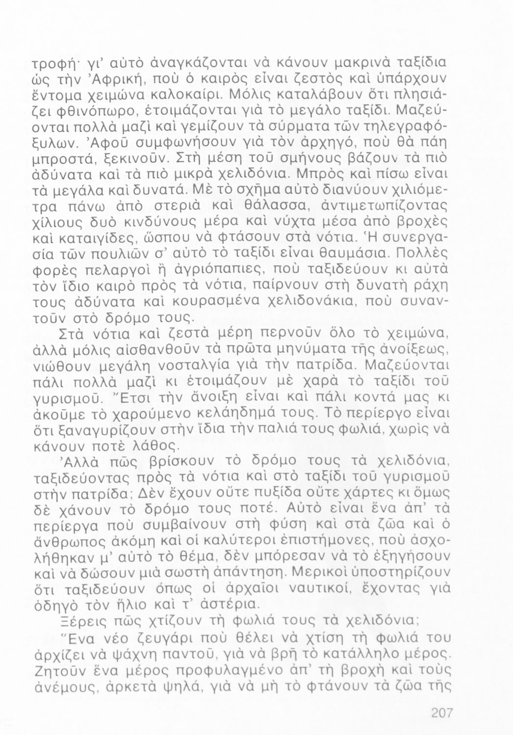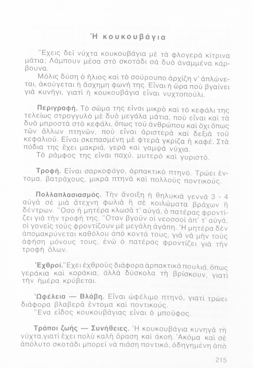 520 ## _aΣχολικό εγχειρίδιο της Γ ΄ Δημοτικού. Στο βιβλίο παρουσιάζονται τα διαφορετικά μέρη των φυτών και τις ιδιότητες του καθενός. Μέσα από παραδείγματα περιγράφεται ο τρόπος γονιμοποίησης και αποθήκευσης τροφής των φυτών καθώς και προφύλαξης τους από πιθανές απειλές. Το δεύτερο μέρος του βιβλίο αφορά τη ζωολογία και κάνει μια κατηγοριοποίηση των ζώων με βάση το φυσικό τους περιβάλλον, όπως ζώα της θάλασσας, του δάσους και ζώα του σπιτιού.