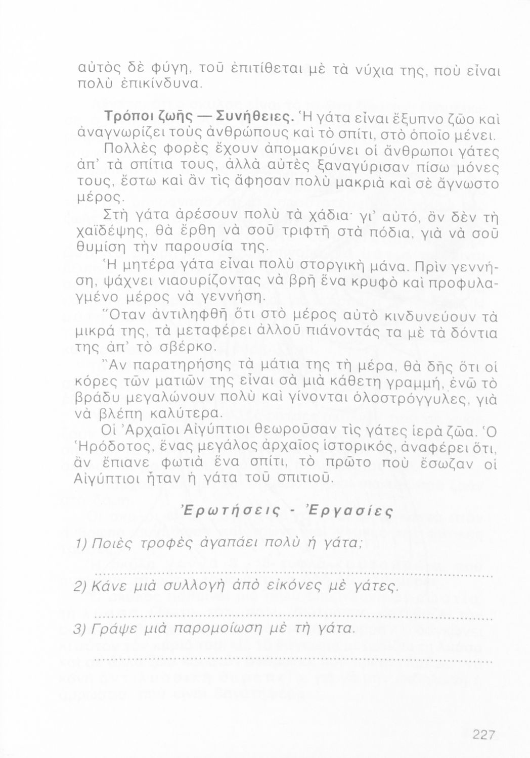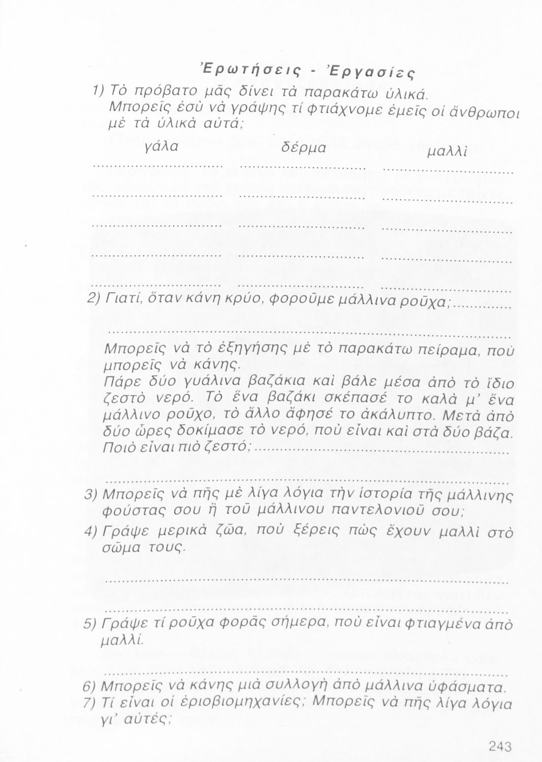 Σχολικό εγχειρίδιο της Γ ΄ Δημοτικού. Στο βιβλίο παρουσιάζονται τα διαφορετικά μέρη των φυτών και τις ιδιότητες του καθενός. Μέσα από παραδείγματα περιγράφεται ο τρόπος γονιμοποίησης και αποθήκευσης τροφής των φυτών καθώς και προφύλαξης τους από πιθανές απειλές. Το δεύτερο μέρος του βιβλίο αφορά τη ζωολογία και κάνει μια κατηγοριοποίηση των ζώων με βάση το φυσικό τους περιβάλλον, όπως ζώα της θάλασσας, του δάσους και ζώα του σπιτιού.