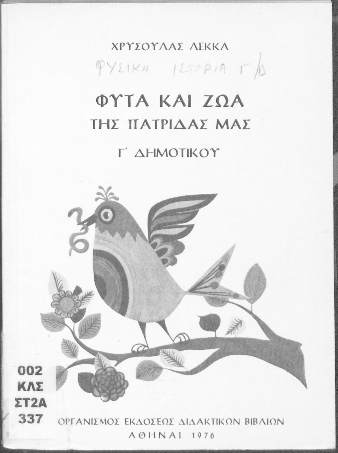 Σχολικό εγχειρίδιο Φυτολογίας και Ζωολογίας της Γ ΄ Δημοτικού. Παρουσιάζει στοιχεία και χαρακτηριστικά των φυτών και των ζώων καθώς και τον τρόπο με τον οποίο ο άνθρωπος τα αξιοποιεί.
