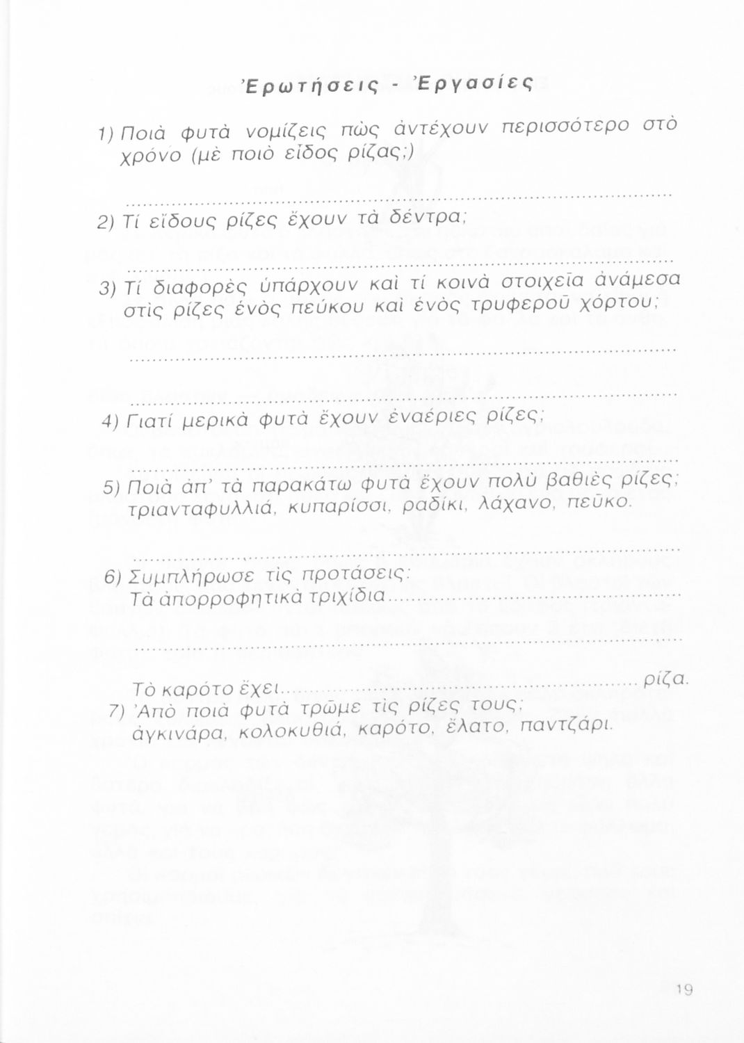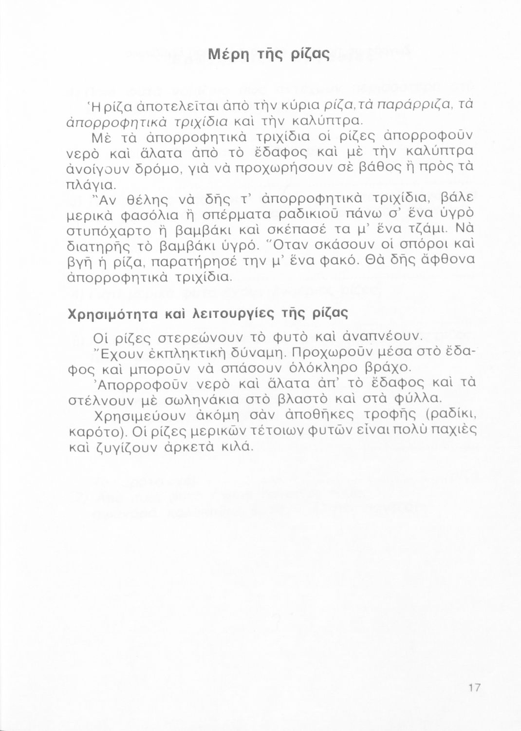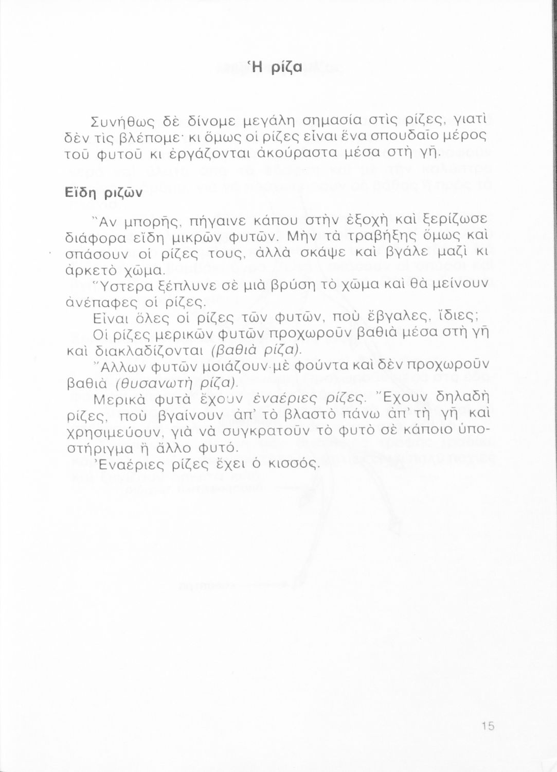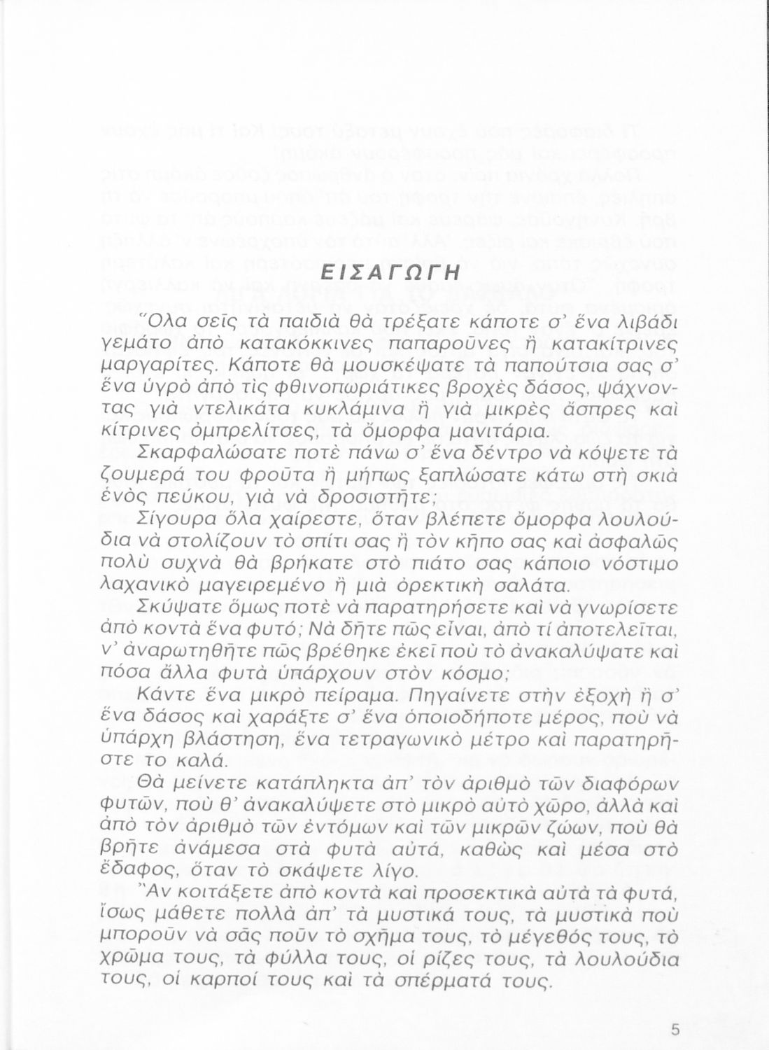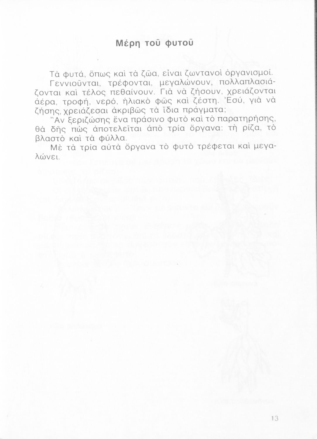 Σχολικό εγχειρίδιο της Γ ΄ Δημοτικού. Στο βιβλίο παρουσιάζονται τα διαφορετικά μέρη των φυτών και τις ιδιότητες του καθενός. Μέσα από παραδείγματα περιγράφεται ο τρόπος γονιμοποίησης και αποθήκευσης τροφής των φυτών καθώς και προφύλαξης τους από πιθανές απειλές. Το δεύτερο μέρος του βιβλίο αφορά τη ζωολογία και κάνει μια κατηγοριοποίηση των ζώων με βάση το φυσικό τους περιβάλλον, όπως ζώα της θάλασσας, του δάσους και ζώα του σπιτιού.