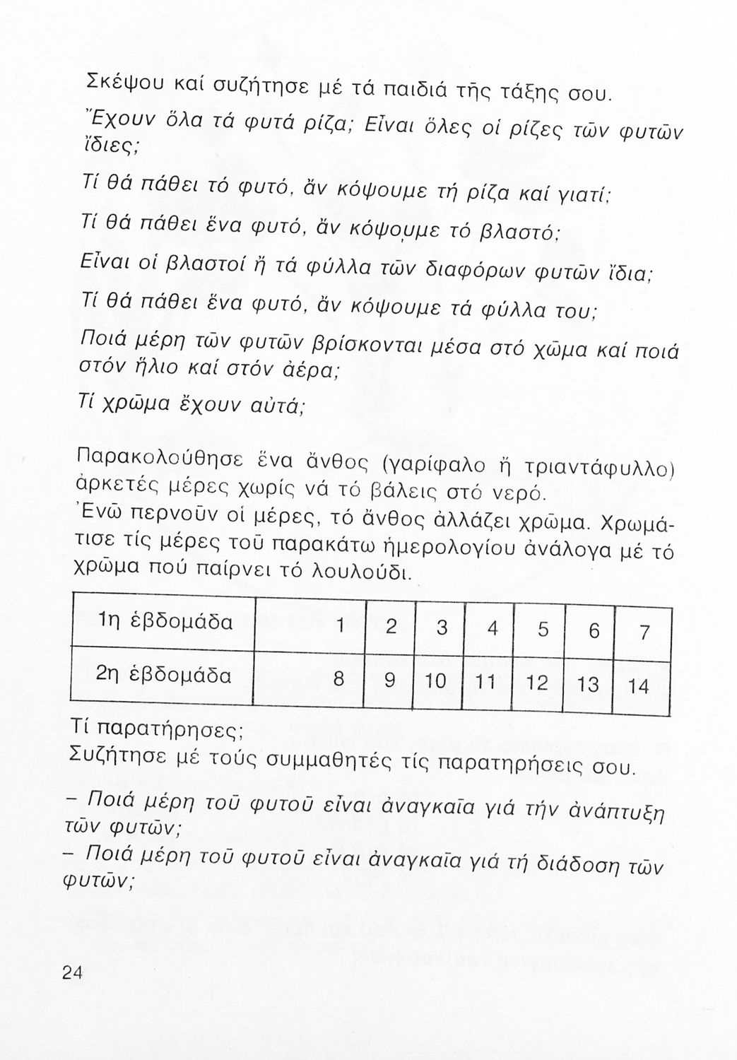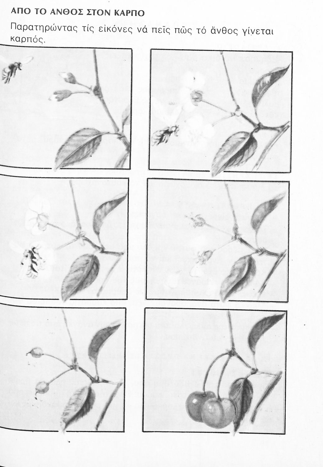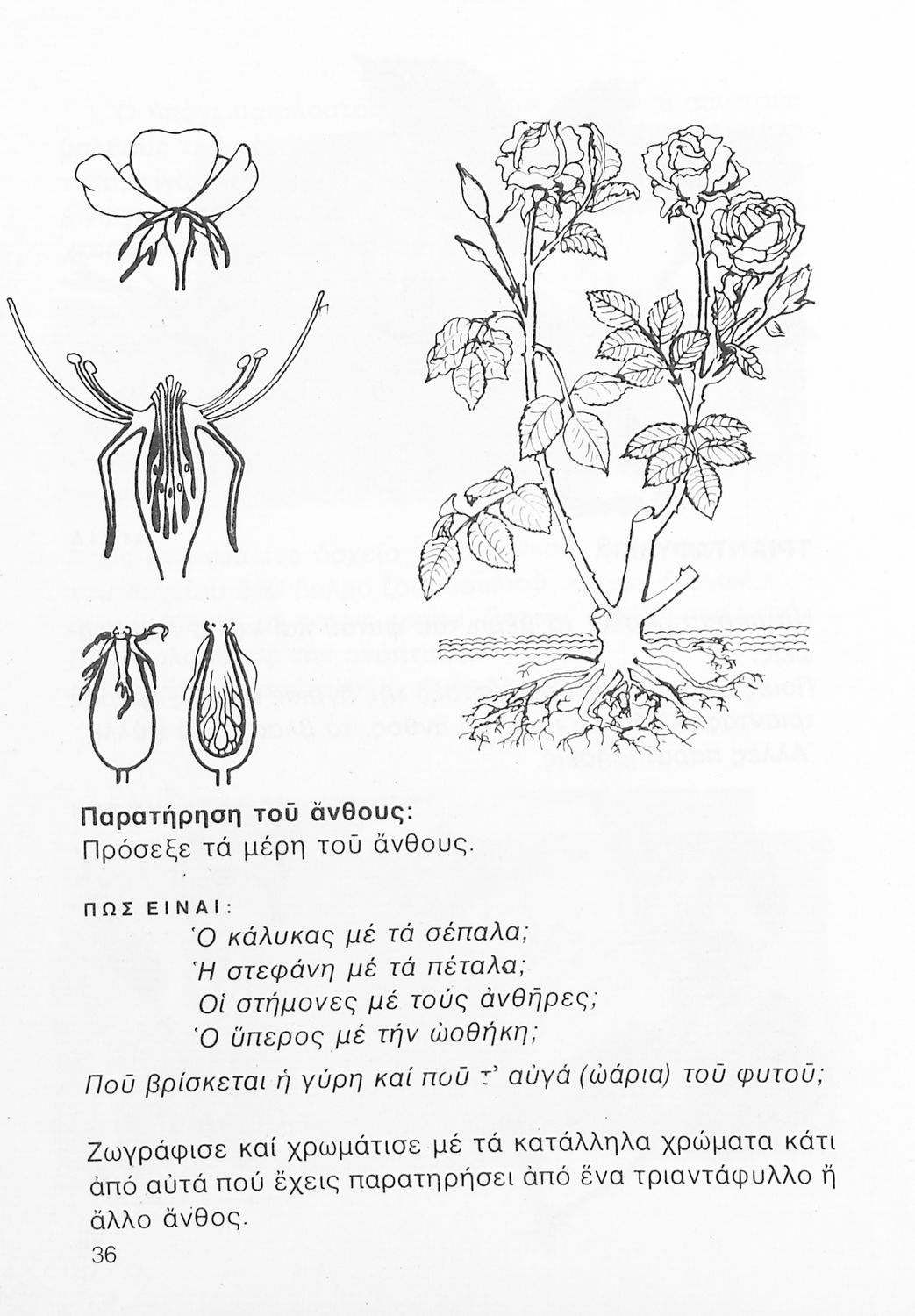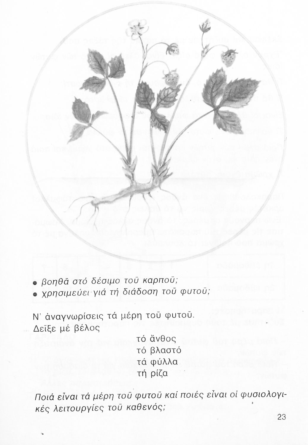 Σχολικό εγχειρίδιο της Γ ΄ Δημοτικού. Στο βιβλίο παρουσιάζονται τα διαφορετικά μέρη των φυτών και τις ιδιότητες του καθενός. Μέσα από παραδείγματα περιγράφεται ο τρόπος γονιμοποίησης και αποθήκευσης τροφής των
