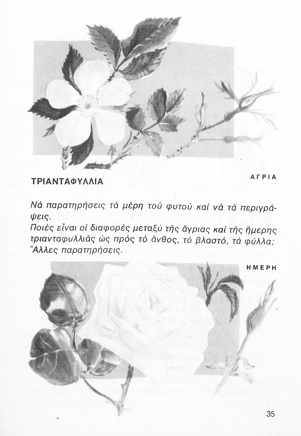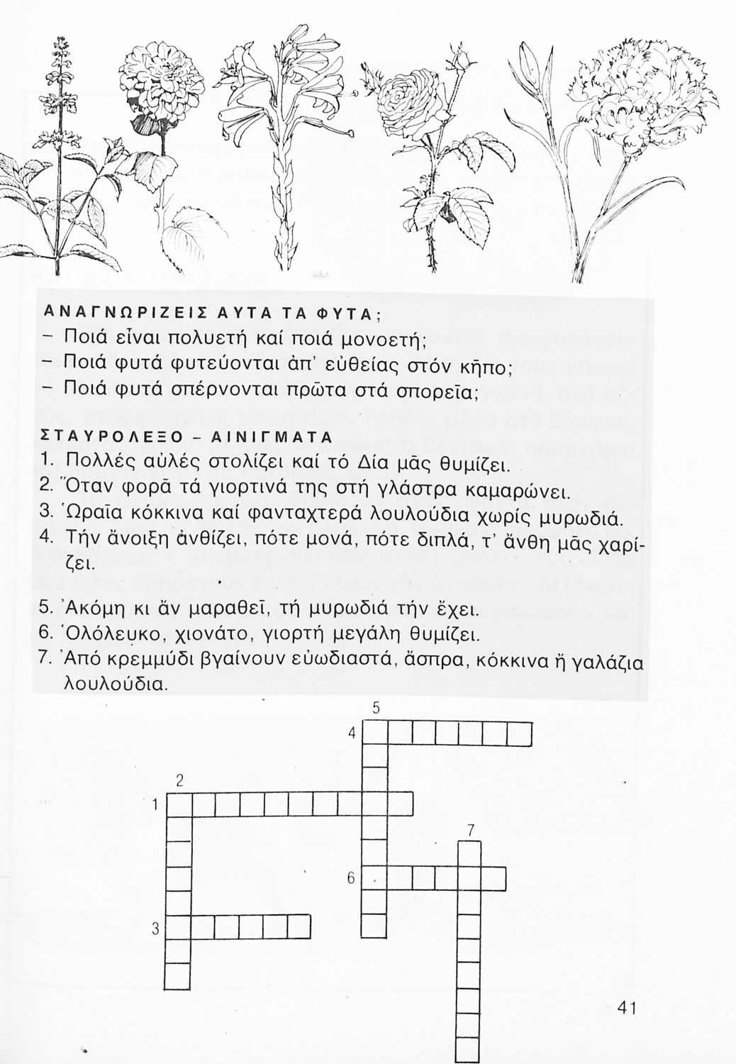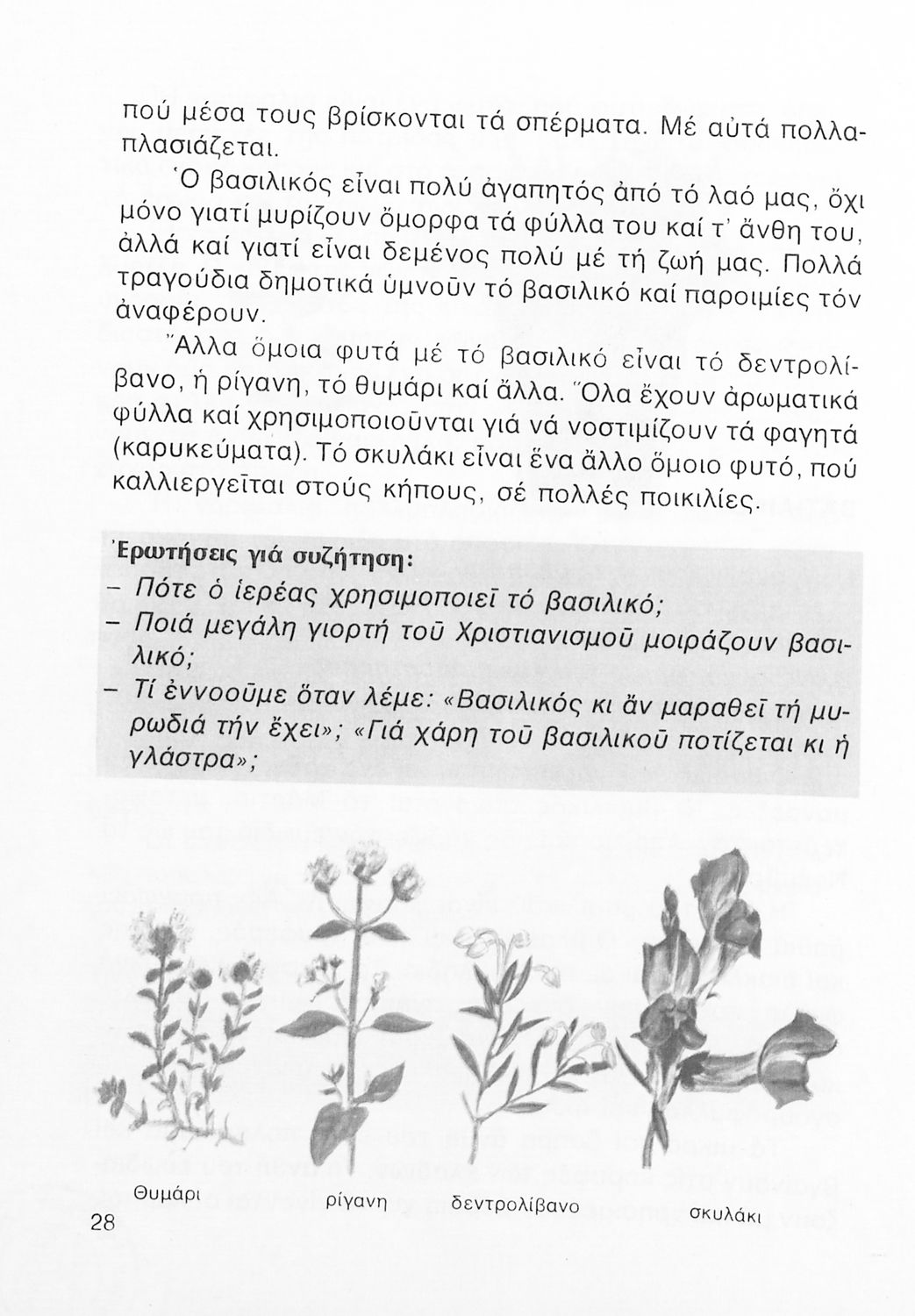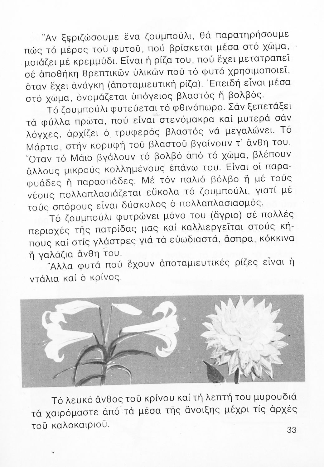 Σχολικό εγχειρίδιο της Γ ΄ Δημοτικού. Στο βιβλίο παρουσιάζονται τα διαφορετικά μέρη των φυτών και τις ιδιότητες του καθενός. Μέσα από παραδείγματα περιγράφεται ο τρόπος γονιμοποίησης και αποθήκευσης τροφής των
