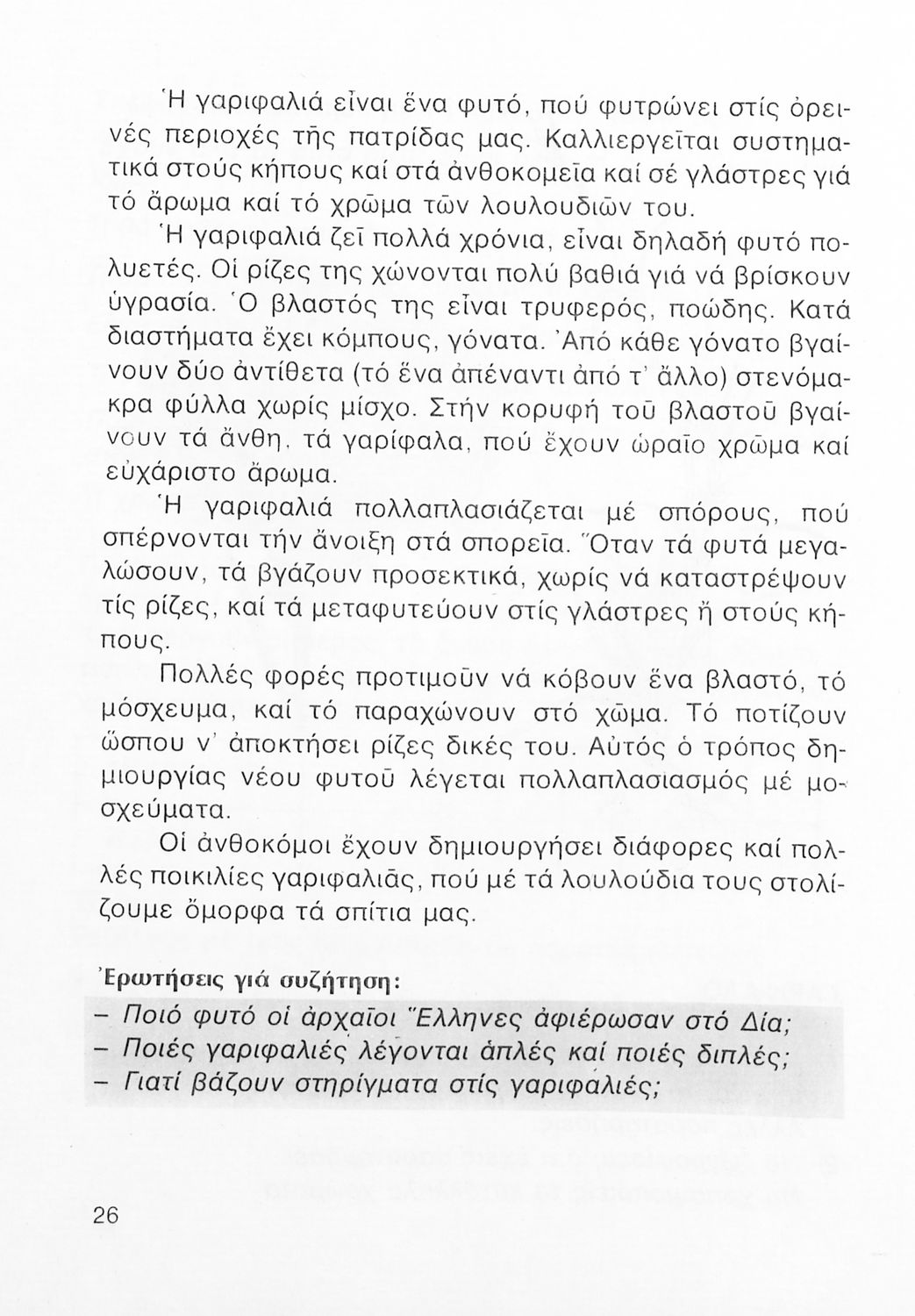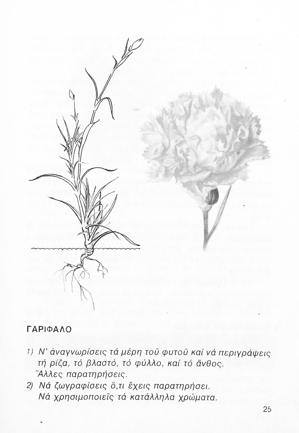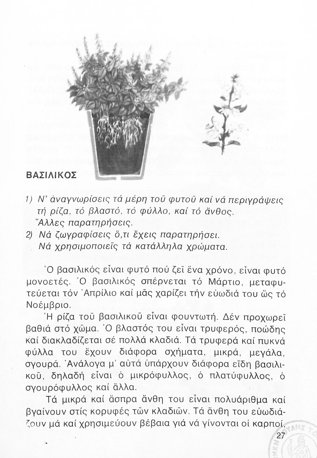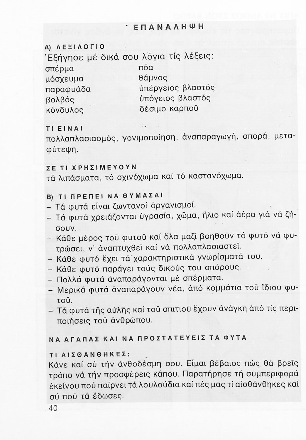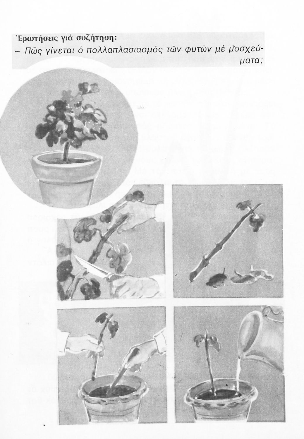 Σχολικό εγχειρίδιο της Γ ΄ Δημοτικού. Στο βιβλίο παρουσιάζονται τα διαφορετικά μέρη των φυτών και τις ιδιότητες του καθενός. Μέσα από παραδείγματα περιγράφεται ο τρόπος γονιμοποίησης και αποθήκευσης τροφής των