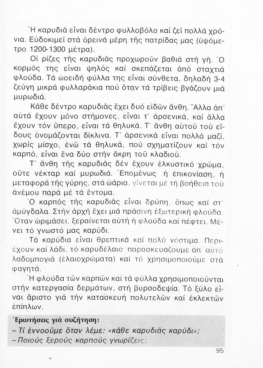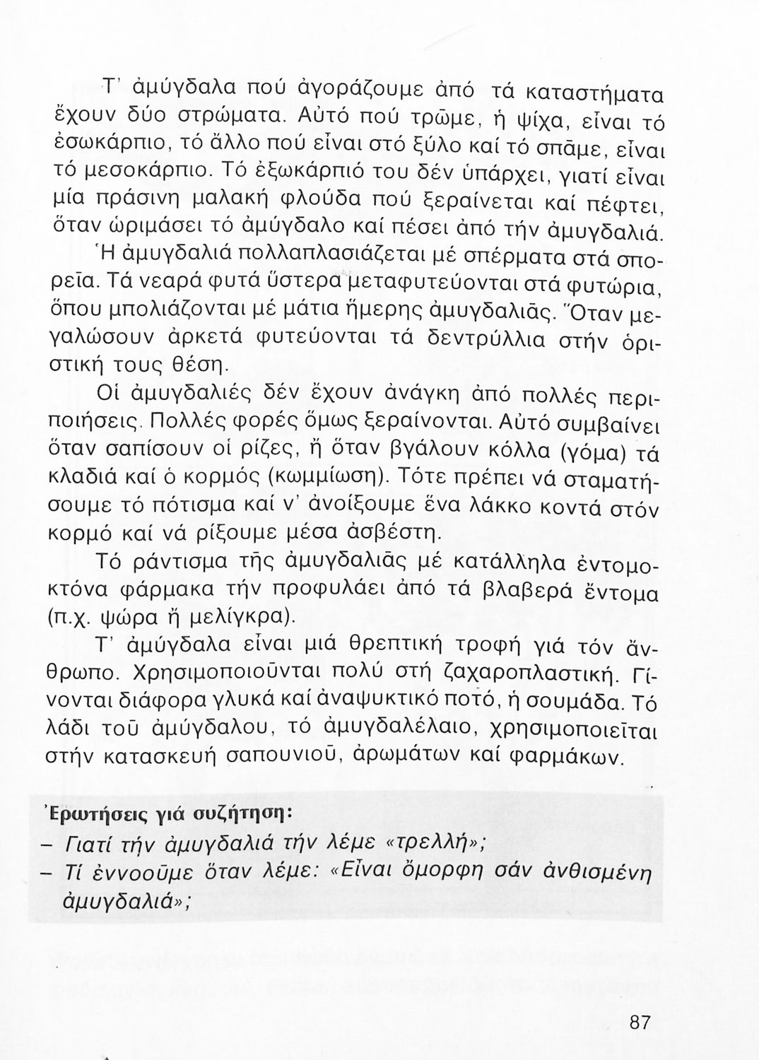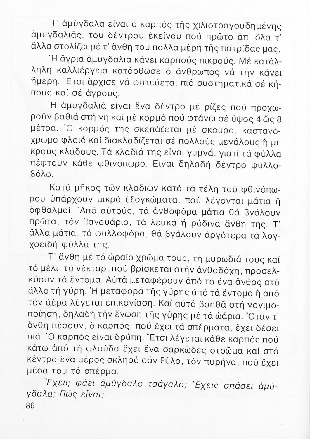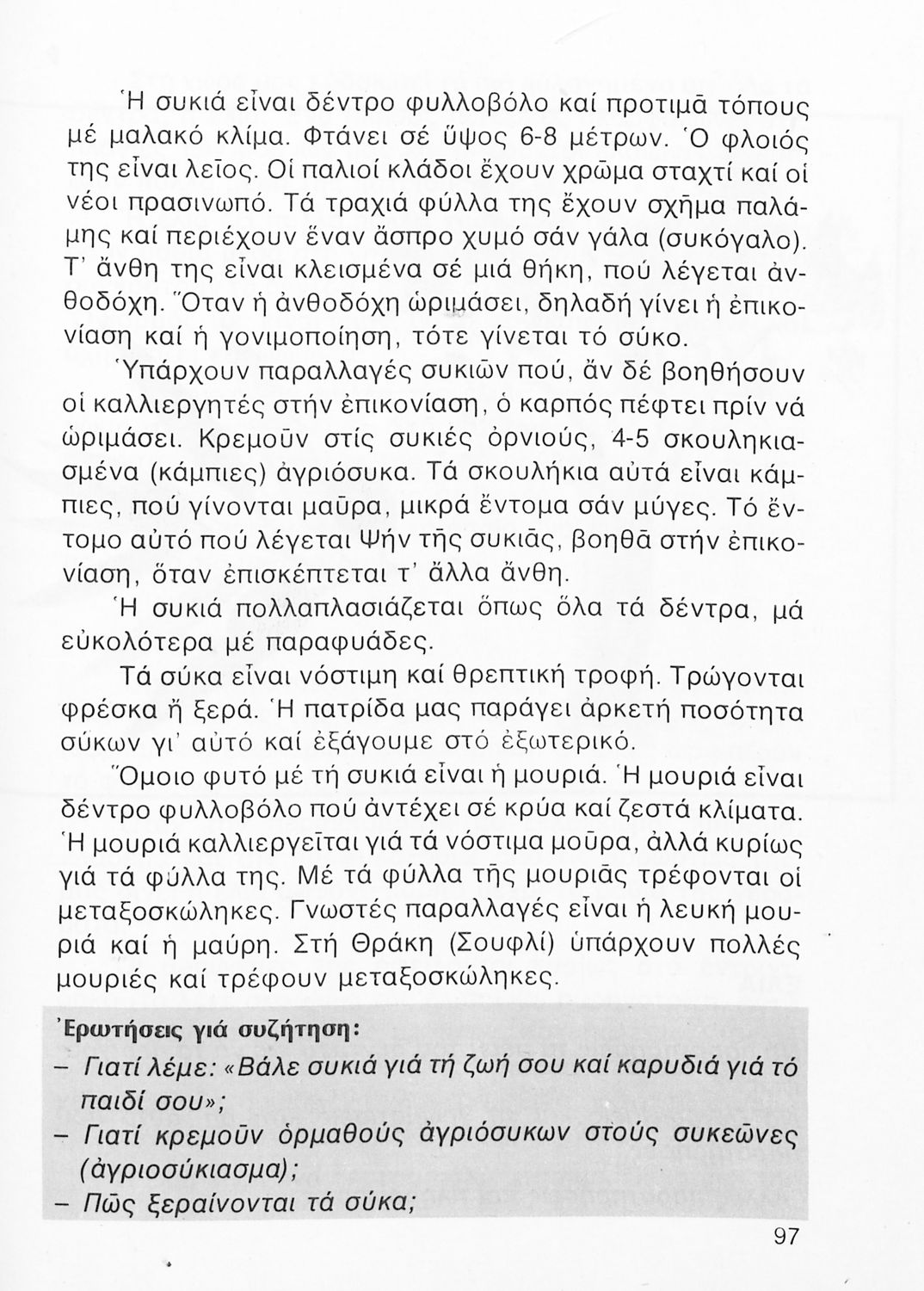 Σχολικό εγχειρίδιο της Γ ΄ Δημοτικού. Στο βιβλίο παρουσιάζονται τα διαφορετικά μέρη των φυτών και τις ιδιότητες του καθενός. Μέσα από παραδείγματα περιγράφεται ο τρόπος γονιμοποίησης και αποθήκευσης τροφής των