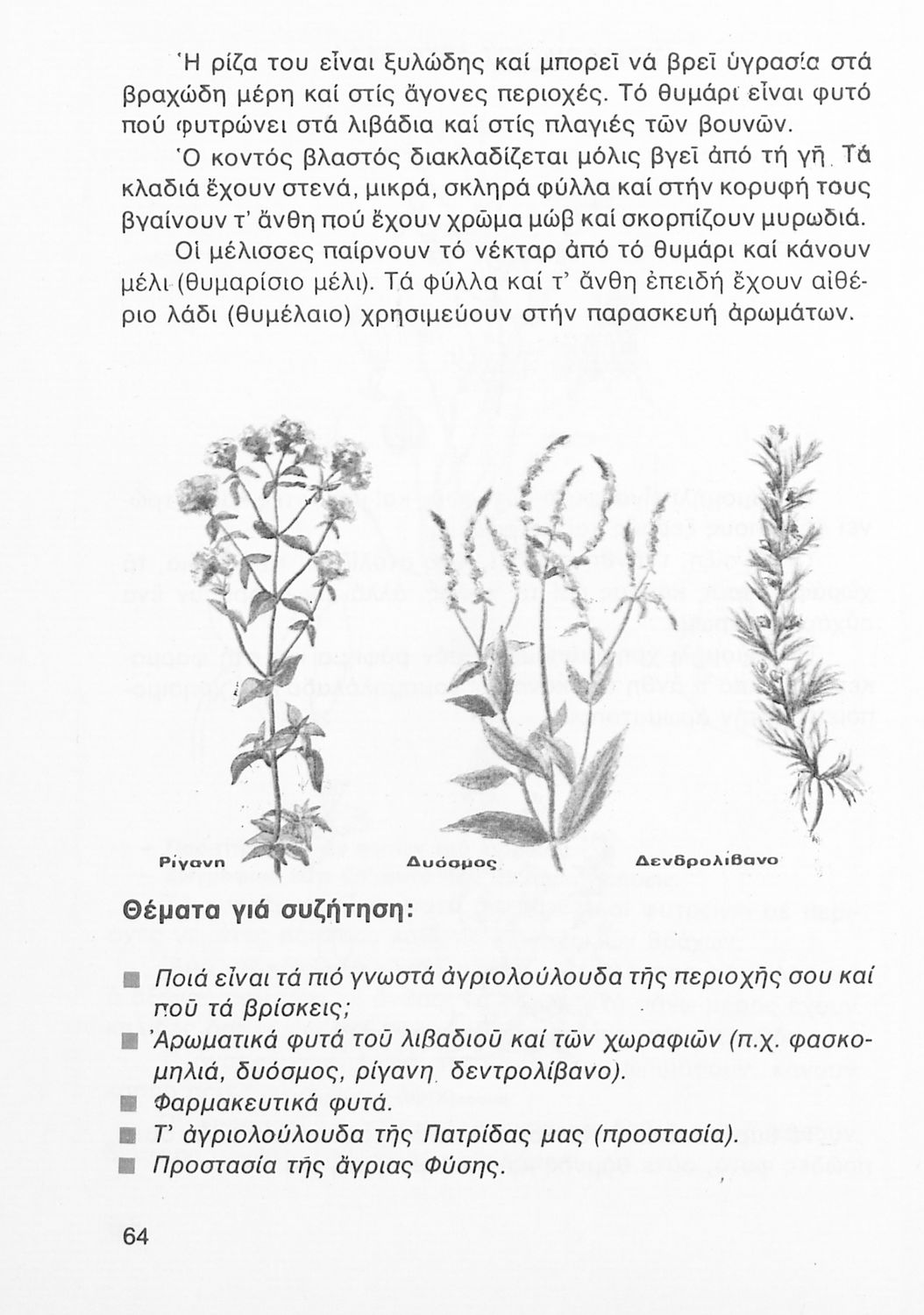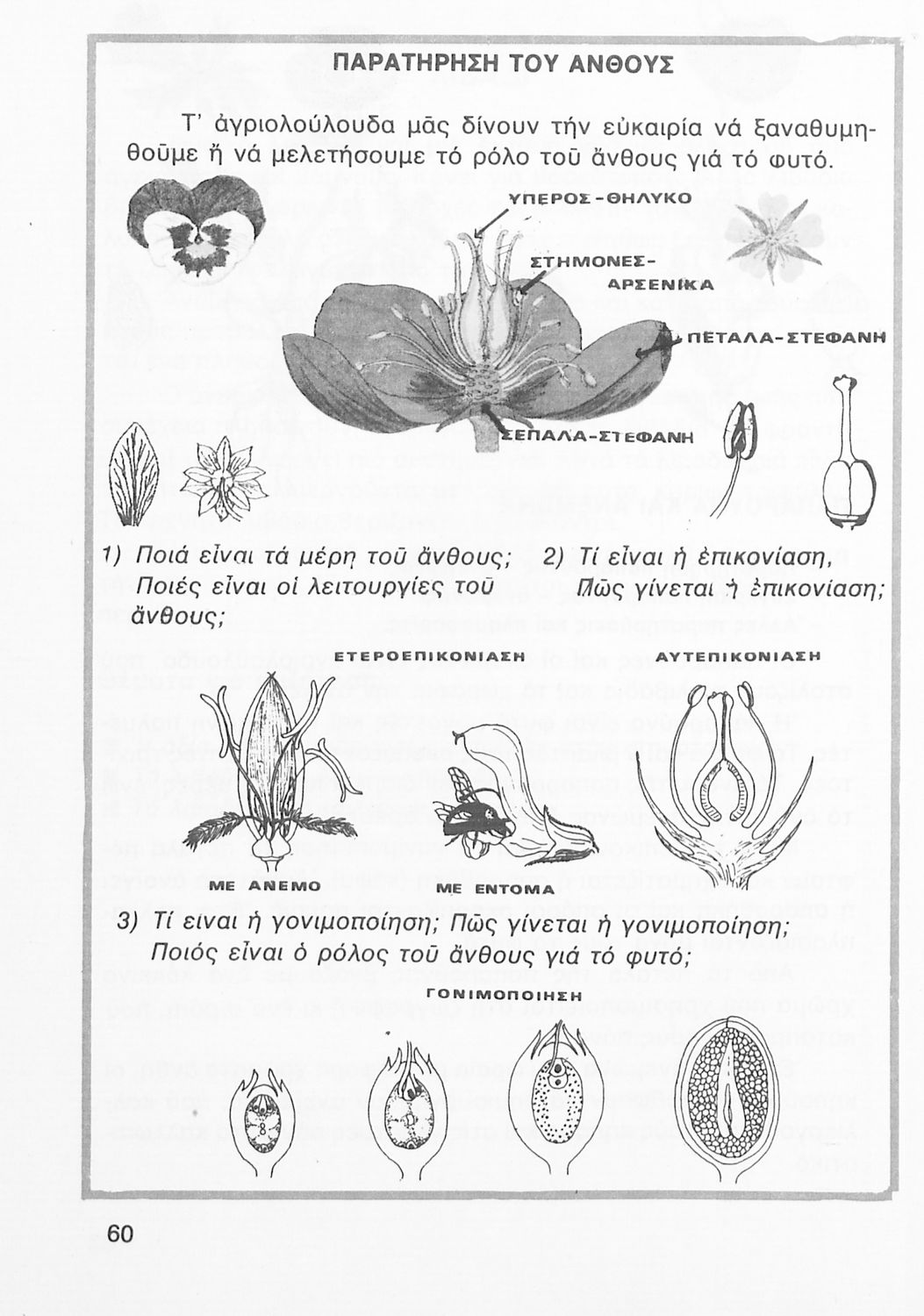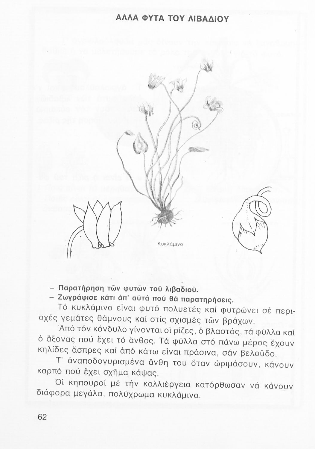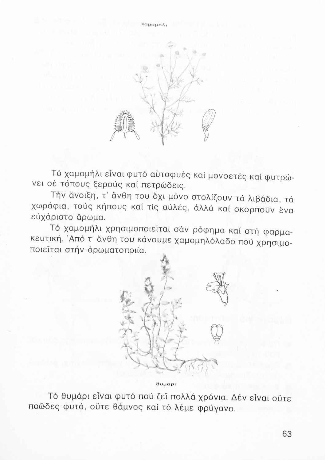 Σχολικό εγχειρίδιο της Γ ΄ Δημοτικού. Στο βιβλίο παρουσιάζονται τα διαφορετικά μέρη των φυτών και τις ιδιότητες του καθενός. Μέσα από παραδείγματα περιγράφεται ο τρόπος γονιμοποίησης και αποθήκευσης τροφής των