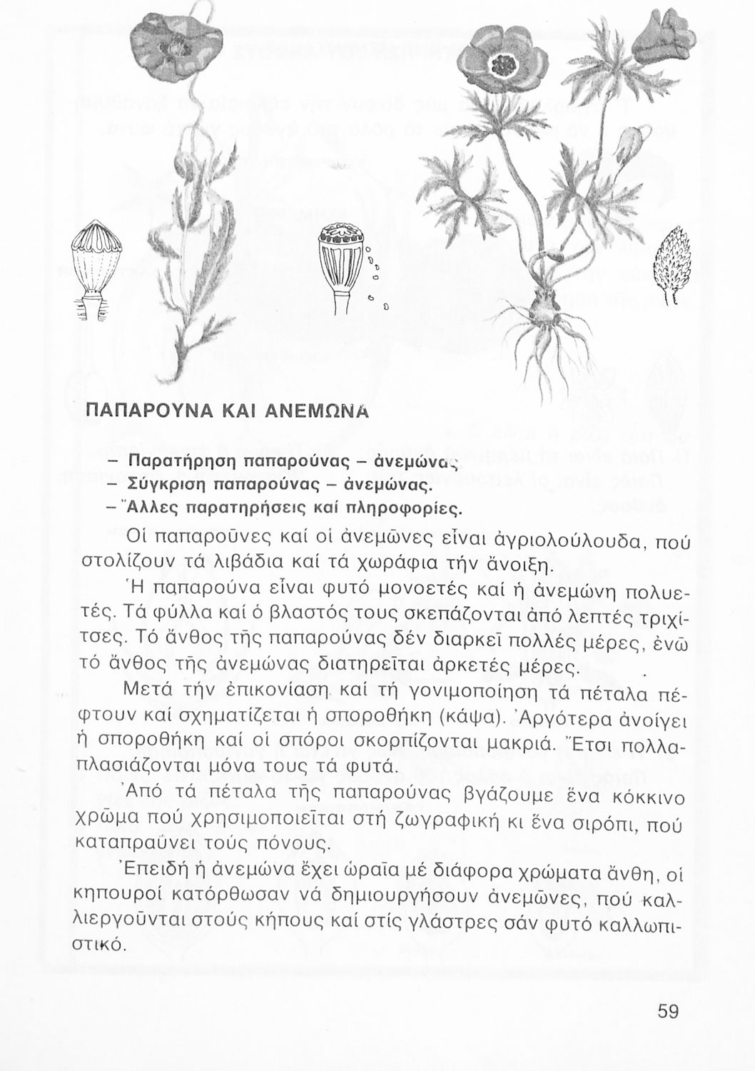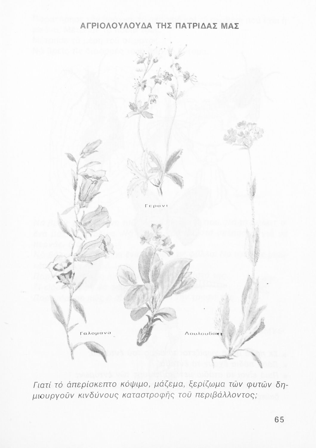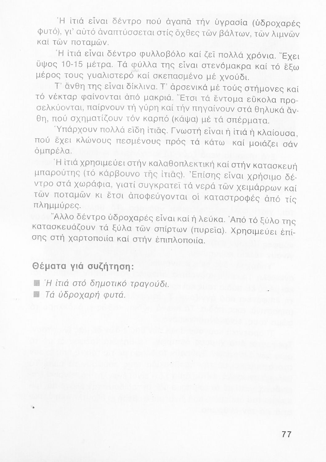 Σχολικό εγχειρίδιο της Γ ΄ Δημοτικού. Στο βιβλίο παρουσιάζονται τα διαφορετικά μέρη των φυτών και τις ιδιότητες του καθενός. Μέσα από παραδείγματα περιγράφεται ο τρόπος γονιμοποίησης και αποθήκευσης τροφής των
