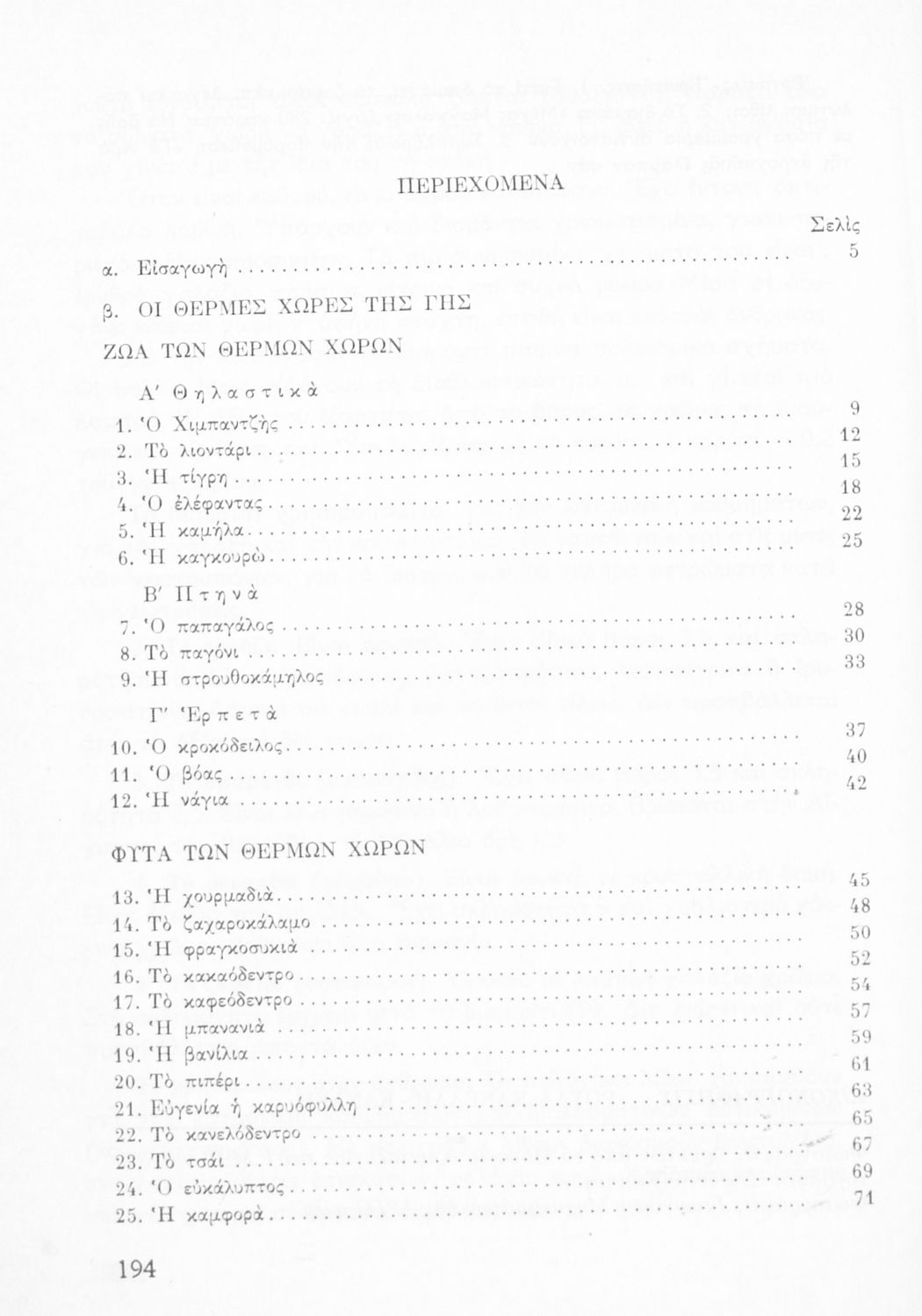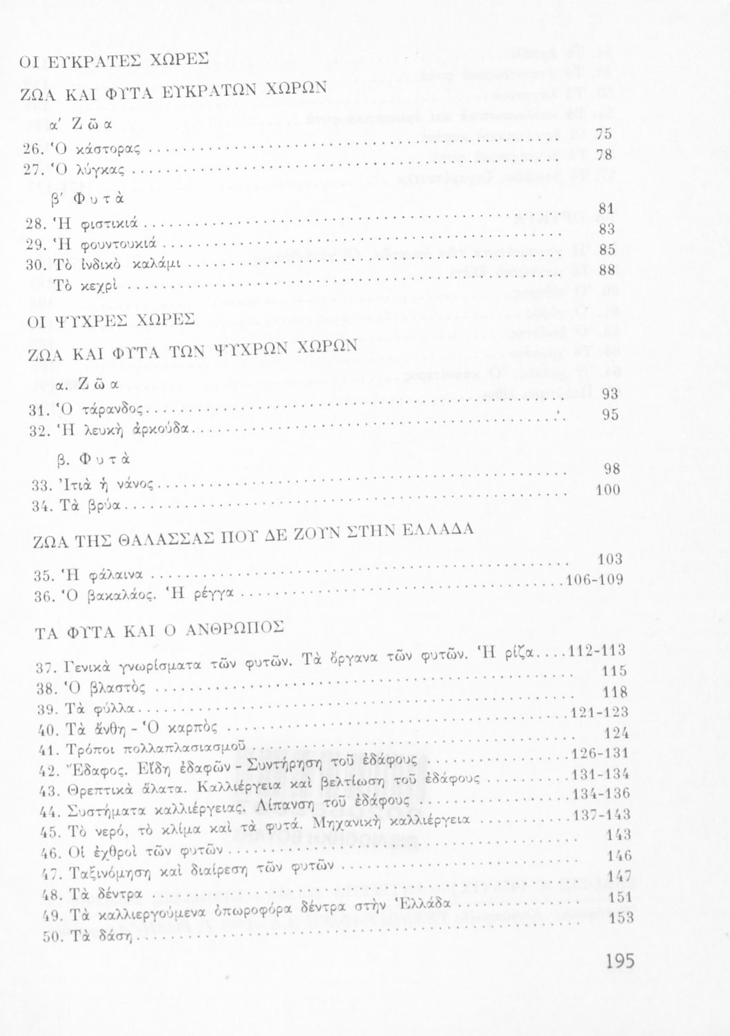 Σχολικό εγχειρίδιο Φυτολογίας και Ζωολογίας της Ε' Δημοτικού το οποίο παρουσιάζει και κατηγοριοποιεί τα ζώα σε θηλαστικά, ερπετά, και πτηνά και αναλύει τον τρόπο ζωής και αναπαραγωγής τους. Στο δεύτερο μέρος του, το βιβλίο παρουσιάζει τα φυτά με βάση τη γεωγραφική της θέση χωρίζοντάς τα σε φυτά θερμών και ψυχρών χωρών. Τέλος, το βιβλίο κλείνει με αναφορές στον τρόπο καλλιέργειας.