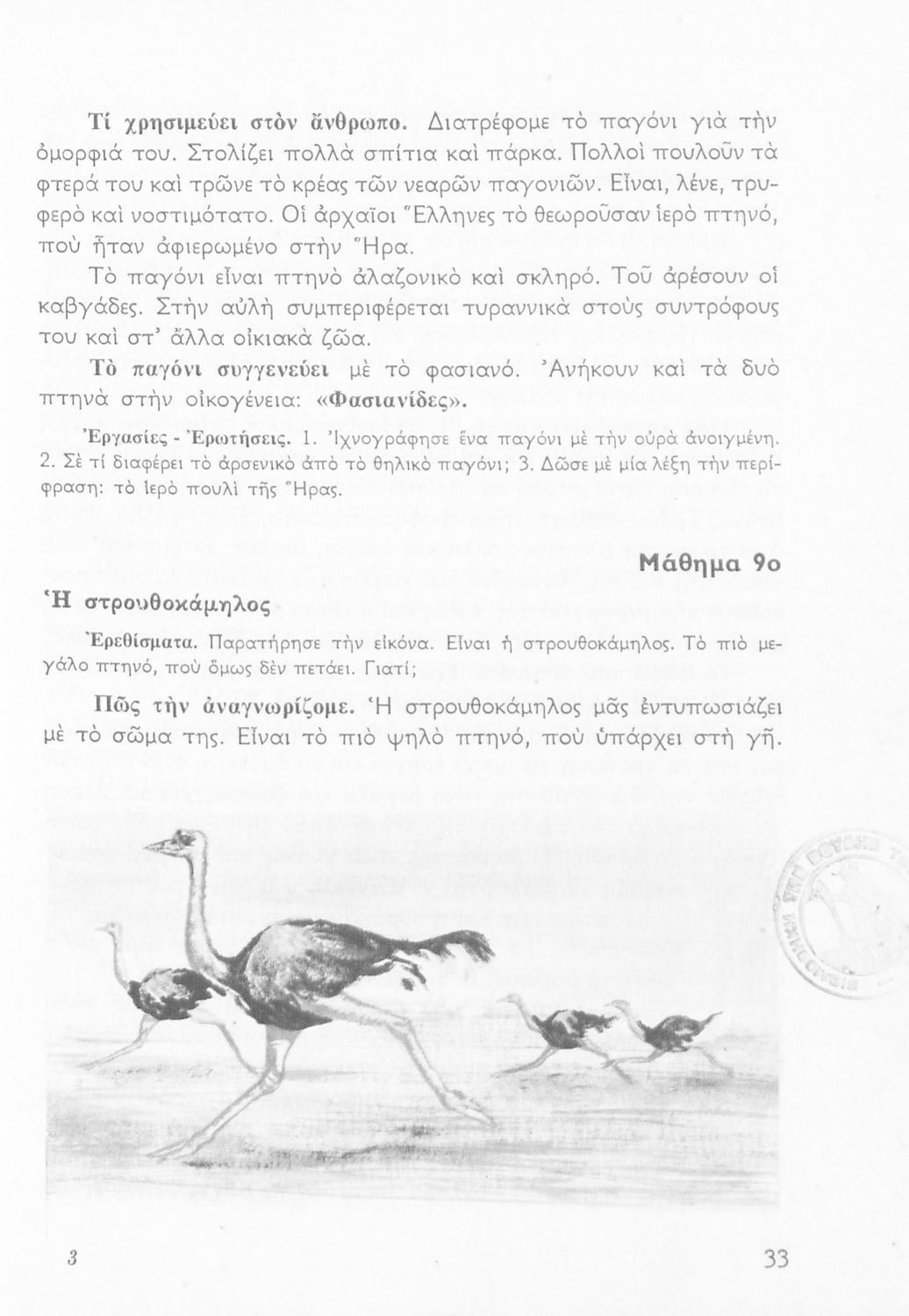 Βαθμίδα εκπαίδευσης: Πρωτοβάθμια Τάξη: Ε' Δημοτικού Γλώσσα: Δημοτική Παρουσίαση περιεχομένου: Σχολικό εγχειρίδιο Φυτολογίας και Ζωολογίας της Ε' Δημοτικού το οποίο παρουσιάζει και κατηγοριοποιεί τα ζώα σε θηλαστικά, ερπετά, και πτηνά και αναλύει τον τρόπο ζωής και αναπαραγωγής τους. Στο δεύτερο μέρος του, το βιβλίο παρουσιάζει τα φυτά με βάση τη γεωγραφική της θέση χωρίζοντάς τα σε φυτά θερμών και ψυχρών χωρών. Τέλος, το βιβλίο κλείνει με αναφορές στον τρόπο καλλιέργειας. |