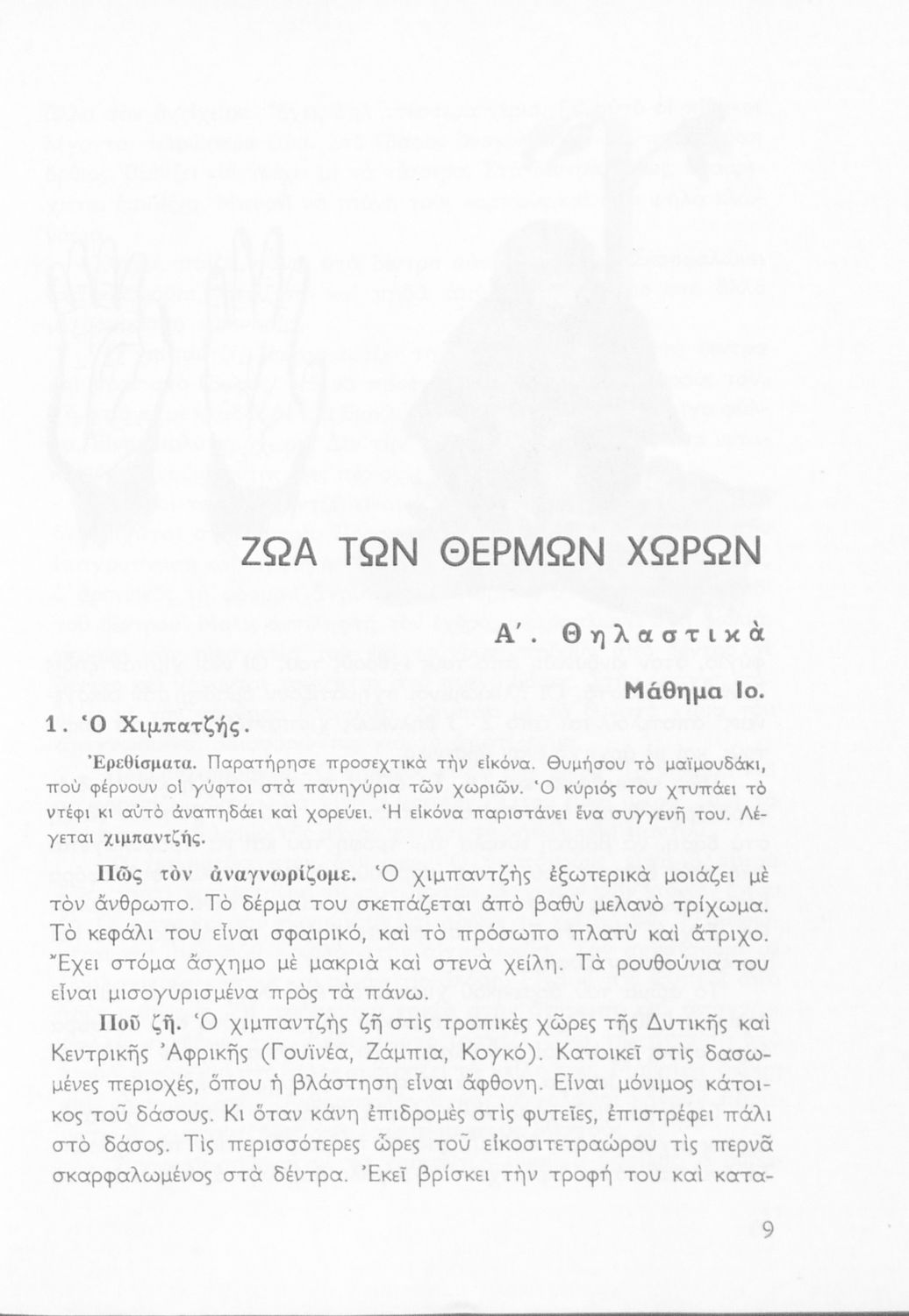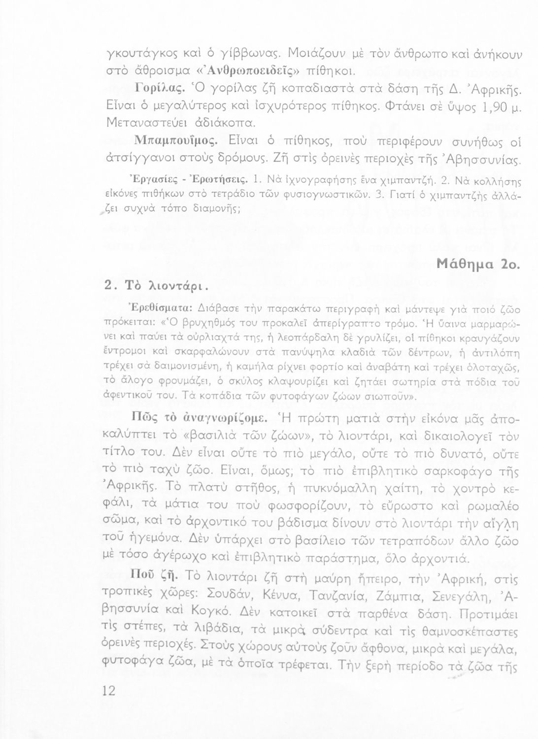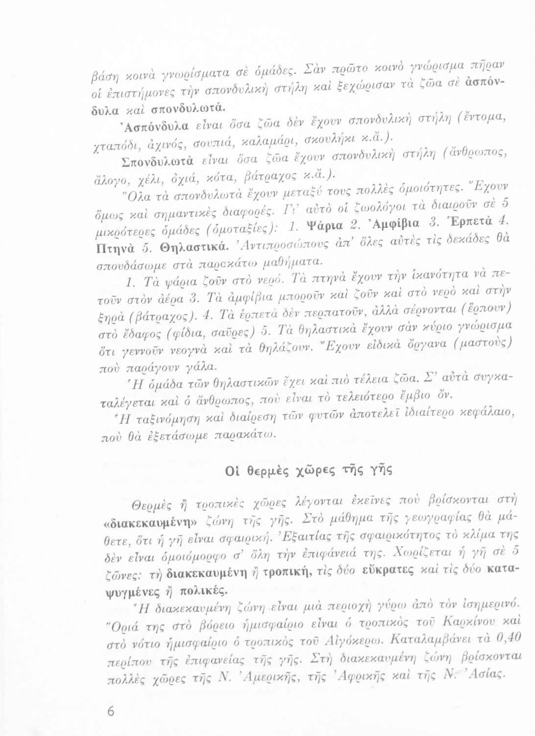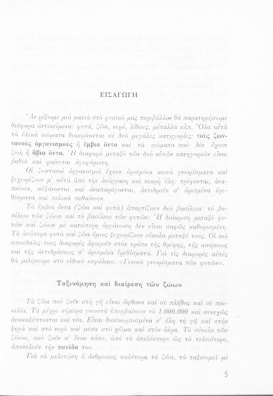 Σχολικό εγχειρίδιο Φυτολογίας και Ζωολογίας της Ε' Δημοτικού το οποίο παρουσιάζει και κατηγοριοποιεί τα ζώα σε θηλαστικά, ερπετά, και πτηνά και αναλύει τον τρόπο ζωής και αναπαραγωγής τους. Στο δεύτερο μέρος του, το βιβλίο παρουσιάζει τα φυτά με βάση τη γεωγραφική της θέση χωρίζοντάς τα σε φυτά θερμών και ψυχρών χωρών. Τέλος, το βιβλίο κλείνει με αναφορές στον τρόπο καλλιέργειας.