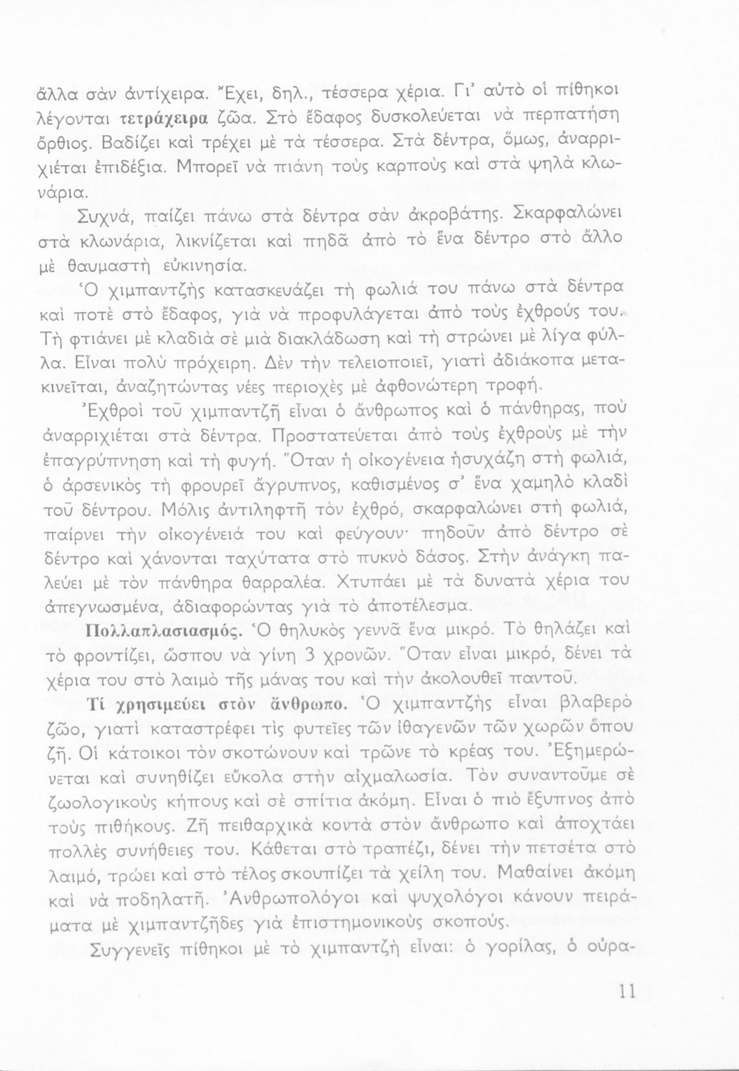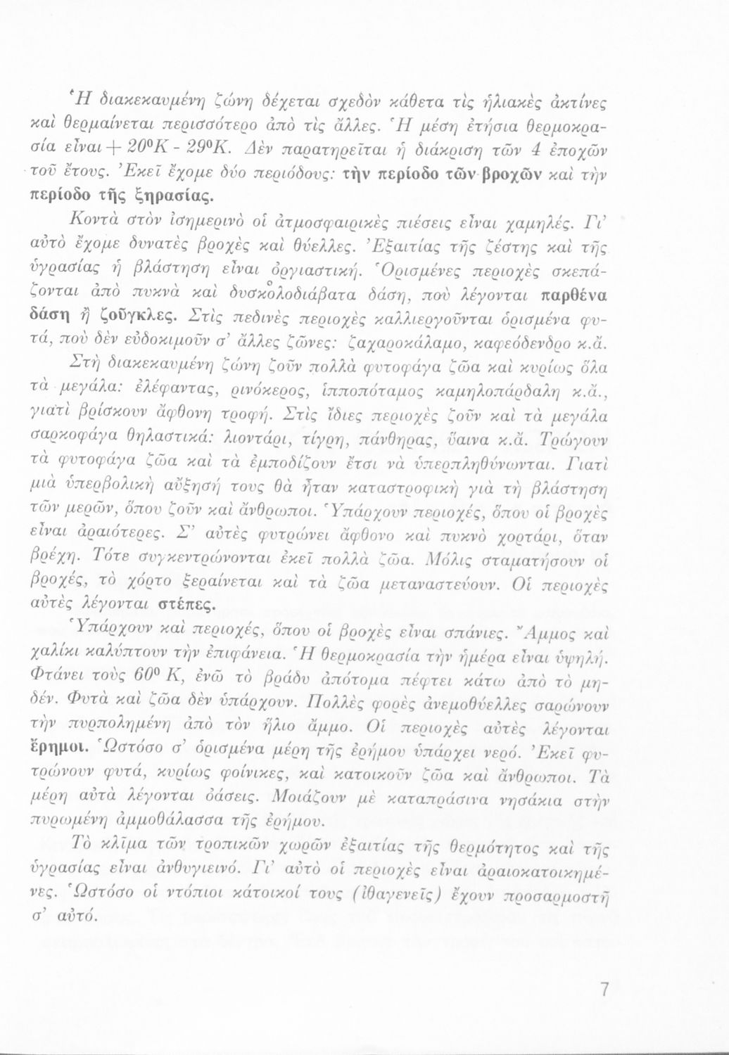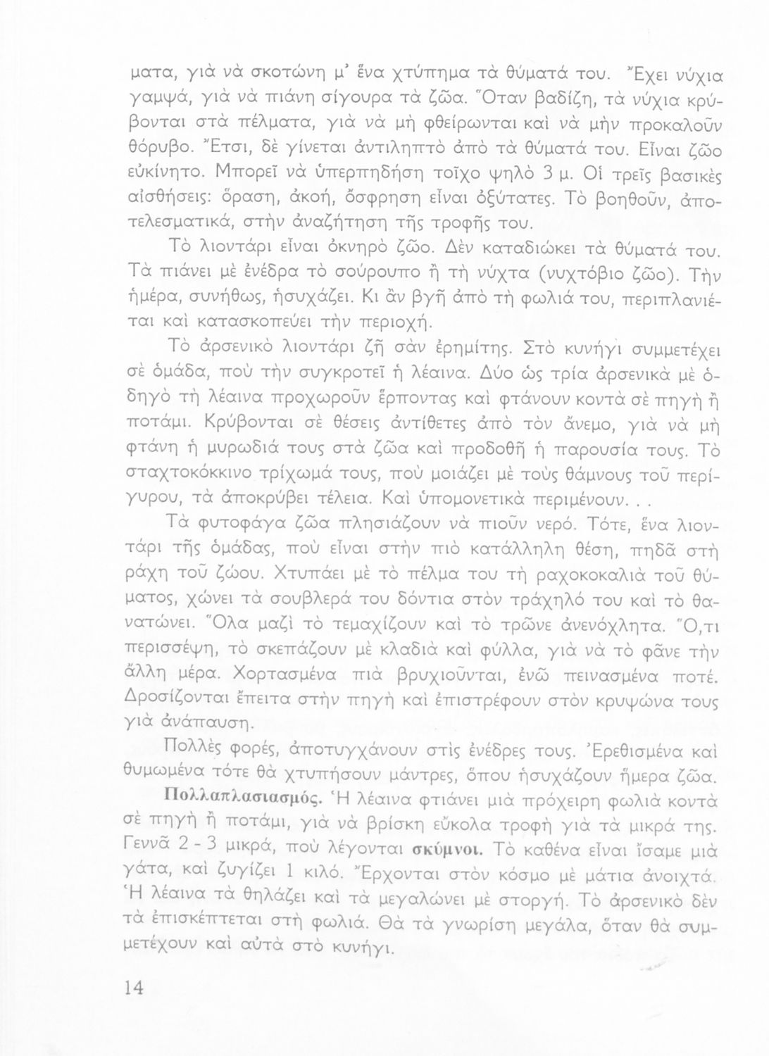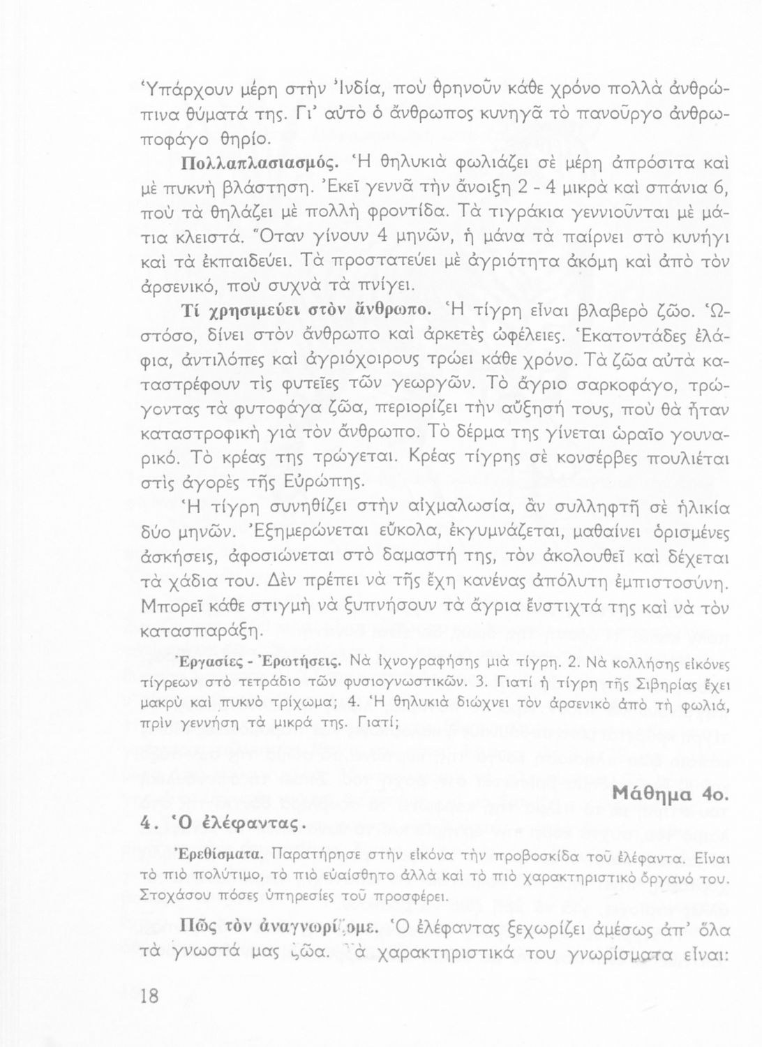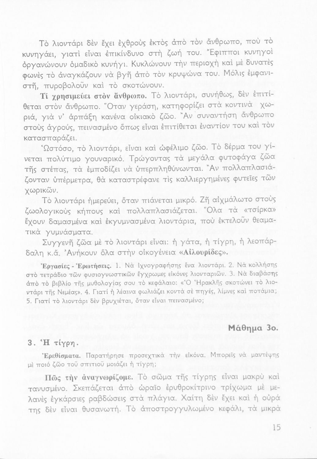 Σχολικό εγχειρίδιο Φυτολογίας και Ζωολογίας της Ε' Δημοτικού το οποίο παρουσιάζει και κατηγοριοποιεί τα ζώα σε θηλαστικά, ερπετά, και πτηνά και αναλύει τον τρόπο ζωής και αναπαραγωγής τους. Στο δεύτερο μέρος του, το βιβλίο παρουσιάζει τα φυτά με βάση τη γεωγραφική της θέση χωρίζοντάς τα σε φυτά θερμών και ψυχρών χωρών. Τέλος, το βιβλίο κλείνει με αναφορές στον τρόπο καλλιέργειας.